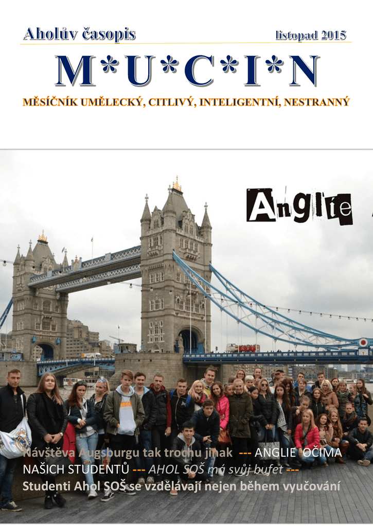 Návštěva Augsburgu tak trochu jinak --- ANGLIE OČIMA NAŠICH STUDENTŮ --- AHOL SOŠ má svůj bufet --Studenti Ahol SOŠ se vzdělávají nejen během vyučování REDAKCE ČASOPISU MUCIN Šéfredaktor: Petr Luzar Fotograf: Ondřej Zámiška Korektura: Mgr. Eva Rastočná Interní redaktoři: Jerzy Stonawski Tomáš Havlík Barbora Ohřalová Klára Pytelková Lucie Vaňková Dominik Křístek Adéla Talašová Externí redaktoři: Dagmar Křístková ÚVODNÍK Milí Aholáci, školní rok už je v plném proudu a my si pro vás opět chystáme spoustu novinek, které nás v letošním školním roce čekají. I v tomto díle se můžete těšit nejen na informace o dění na Aholu, ale i řadu další zajímavostí. Jistě jste si také povšimli, že náš školní časopis opět změnil svou vizáž, především svým formátem, ale také titulní stranou. Doufáme však, že i jeho náplň vás oslní. Vaši redaktoři OBSAH: 1. Ze života Aholu: 1.1. Otevření bufetu na Ahol SOŠ (T. Havlík) 1.2. Nová učebna pro bilingvní výuku 1.3. Návštěva Augsburgu tak trochu jinak (L. Vaňková) 1.4. Anglie očima studentů (P. Luzar) 1.5. Spolupráce Aholu s ostravským multikinem Cinestar (Mgr. Rastočná) 1.6. První pomoc na základní škole (Mgr. Miczková) 1.7. Studenti Ahol SOŠ se vzdělávají nejen během vyučování (Mgr. Rastočná) 1.8. Žákyně Pedagogického lycea zamířily na Šavrdův pohár (Mgr. Eliášová) 2. Sport, umění, kultura: 2.1. Aktuality ze světa sportu (P. Luzar) 2.2. Recenze: Scapinova šibalství (B. Ohřálová) 2.3. Recenze: Stroncium (A. Talašová) 3. Zajímavosti odevšad: 3.1. Bilingvní výuka a její historie (A. Talašová) 3.2. Zázračná voda (J. Stonavwski) 4. Umělecká tvorba 4.1. Klukovská frajeřina (D. Křístková, PL1) 4.2. Šlizg (K. Pytelková, PL1) 5. Humor a zábava: 5.1. Kvízy, hádanky a vtipy 5.2. Horoskopy a pranostiky AKTUALITY Z AHOLU ŠKOLNÍ BUFET NA AHOLU Dne 4. října 2015 se po dlouhých peripetiích a řadě úprav podařilo konečně otevřít školní bufet na SOŠ Ahol. Již toho dne se studenti plni očekávání vrhli jej navštívit a zjistit, co jim tako nová „aholácká“ služba nabízí. A že je nabídka vskutku pestrá – čítá nejrůznější bagety, plněné housky a croissanty, které si studenti mohou nechat zapéct do podoby pannini, domácí sladké pečivo, buchty a zákusky, ale i sortiment mléčných výrobků, sušenek i cereálií a nápojů, a to jak studených, tak i teplých. Školní bufet si zvlášť zakládá na čerstvosti nabízených potravin a jejich kvalitě. Zároveň se snaží studentům nabídnout vždy něco nového, a proto je sortiment pravidelně doplňován o novinky. Studenti navíc mohou své požadavky a přání zapisovat do Knihy stížností a přání, kterou naleznou na prodejním pultu bufetu. Takto si již v první dnech studenti prosadili oblíbený pokrm „párek v rohlíku“. Školní bufet bývá pravidelně otevřen od 8.00 do 13.30. Z důvodu zkvalitnění těchto stravovacích služeb byly také prodlouženy některé přestávky, a to po 2. a 5. vyučovací hodině na 15 minut, aby měli studenti dost času si svačinu nakoupit a před zvoněním na hodinu ji také v klidu zkonzumovat. BILINGVNÍ VÝUKA PŘINESLA AHOLU NOVOU UČEBNU Na základě projektu zapojení SOŠ Ahol do bilingvní výuky mohou žáci od letošního září využívat nově vybavenou učebnu, která slouží zejména výuce bilingvní výuky samotné. Díky projektu je tedy učebna 212 nově obohacena o počítačovou techniku čítající celkem 25 nových notebooků. Žáci si tak mohou užívat interaktivnějšího vyučování při práci s mediální technikou. Učitelům pak nová učebna umožňuje zefektivnění vyučování v možné podobě elearningu, který nabízí celou řadu možností, jak pracovat s žáky kolektivně, skupinově i individuálně, jak je efektivně motivovat i hodnotit. AKTUALITY Z AHOLU ŠKOLNÍ VÝLET DO AUGSBURGU S VÝUKOU NĚMČINY Školní výlet se konal od 28. 9. do 2. 10. 2015. Sraz byl ve 12 hodin večer u naší školy a 30 minut po půlnoci jsme už odjížděli směrem do Německa. V 15 hodin jsme šťastně dojeli do Německa, kde jsme jako první město navštívili město Regentsburg, které se nachází na řece Dunaj. V Regentsburgu jsme zažili krásnou projížďku lodí a také jsme si prošli památky města, například katedrálu svatého Petra. Večer jsme se přivítali s rodinou, u které jsme byli po celý kurz ubytováni. Katedrála sv. Petra Druhý den dopoledne jsme absolvovali první tříhodinovou výuku v německé škole. Poté následovala prohlídka města, ve kterém jsme bydleli. V Augsburgu jsme šli navštívit nejstarší sociální sídliště světa a samozřejmě nechyběla návštěva obchodů, které se nám nabízely na každém rohu. Projížďka lodí. Třetí den pokládám za nejhezčí den z celého týdne. Po tříhodinové výuce ve škole, do které jsme docházeli celý týden, jsme se vydali do Legolandu. Legoland byl hodně veliký a bylo tam mnoho zábavných atrakcí. Byli jsme velmi rádi, že jsme dostali možnost navštívit tento areál. Návštěva hrobky. Město Inglostadt. Čtvrtý den jsme naposled navštívili německou školu, ze které jsme si poté odnesli diplom za absolvování výuky v Německu. Pak následoval výlet do třetího největšího města v Německu, a to do Mnichova. V Mnichově jsme si prohlédli mnoho památek a muzeí. Také jsme se stihli podívat na hrobky německých panovníků a nakonec jsme se zašli podívat na vyhlídkovou věž, ve které jsme se vyvezli výtahem až do 360 metrů. Byl to pro nás Nejstarší sídliště světa. úžasný pocit si prohlédnout celé město z takové výšky. Čekal nás pátý den a to byl bohužel den poslední. Po cestě zpátky domů jsme se ještě zastavili podívat do města Ingolstadt. P