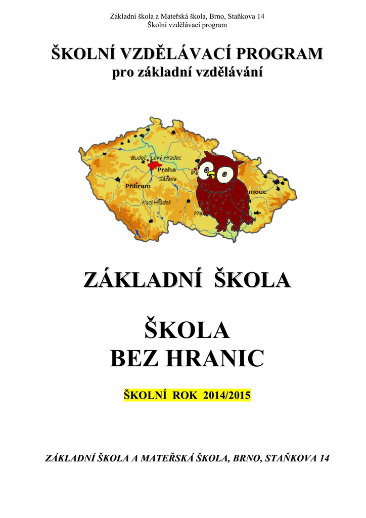 Základní škola a Mateřská škola, Brno, Staňkova 14 Školní vzdělávací program ŠKOLNÍ VZDĚLÁVACÍ PROGRAM pro základní vzdělávání ZÁKLADNÍ ŠKOLA ŠKOLA BEZ HRANIC ŠKOLNÍ ROK 2014/2015 ZÁKLADNÍ ŠKOLA A MATEŘSKÁ ŠKOLA, BRNO, STAŇKOVA 14 Základní škola a Mateřská škola, Brno, Staňkova 14 Školní vzdělávací program 1 Identifikační údaje 1.1 Název školního vzdělávacího programu: Oficiální název: Školní vzdělávací program pro základní vzdělávání Motivační název: Škola bez hranic 1.2 Předkladatel: Název školy: Adresa školy: Základní škola a Mateřská škola, Brno, Staňkova 14 Staňkova 14, 602 00 Brno IČO: 62 157 094 IZO: 062 157 094 RED_IZO: 600 108 503 Ředitelka školy: Mgr. Jana Hlaváčková Zástupkyně ředitelky ZŠ: Mgr. Jitka Zábranská Zástupkyně ředitelky MŠ: Mgr. Jana Kratochvílová Koordinátorka tvorby ŠVP: Mgr. Jitka Zábranská Kontakty: telefon: 541 422 022, 533 433 881 – ZŠ telefon: 533 433 880, 533 433 968 – MŠ tel./fax: 541 219 992 e-mail: [email protected] e-mail: [email protected] e-mail: [email protected] web: www.zsstankova.eu 1.3 Zřizovatel školy: Statutární město Brno Městská část Brno-Královo Pole Palackého tř. 59 612 93 Brno IČO: 44 992 785 telefon: 541 588 111 e-mail: [email protected] web: http://kralovopole.brno.cz/ 1.4 Aktualizace: č. 8 – 31. srpna 2014 1.5 Platnost dokumentu od: 1. září 2014 ŠVP pro školní rok 2014/2015 byl schválen školskou radou dne 15. 10. 2014. Mgr. Jana Hlaváčková ředitelka školy 2 Základní škola a Mateřská škola, Brno, Staňkova 14 Školní vzdělávací program 2 Charakteristika školy 2.1 Úplnost a velikost školy Základní škola a Mateřská škola, Brno, Staňkova 14 vykonává činnost úplné základní školy, školní družiny, mateřské školy a školní jídelny–výdejny. Počet kmenových a odborných učeben odpovídá běžnému provozu, kapacita základní školy je 420 žáků, školní družiny 90 žáků, mateřské školy 100 dětí a kapacita jídelny-výdejny pro základní i mateřskou školu je 340 míst. Budovy základní školy a mateřské školy se společně nacházejí v těsné blízkosti, v klidném prostředí městské části Brno-Královo Pole, v blízkosti Hokejové haly dětí a mládeže, s dobrou dostupností městské hromadné dopravy i dopravy z přilehlých částí Brna. Jedná se o budovy s bohatou historií a mnohaletou školní tradicí. Základní škola byla postavena v roce 1905 pro německou obecnou školu a roku 1919 předána české školní mládeži. V základní škole vyučujeme dle vlastního školního vzdělávacího programu ,,Škola bez hranic”. Jsme členem Asociace českých daltonských škol a Asociace školních sportovních klubů, na prvním stupni využíváme prvky daltonského vyučování. Krajský úřad Jihomoravského kraje, odbor školství, určil ve spolupráci se zřizovatelem Brno-Královo Pole naši základní školu k realizaci vzdělávání ve třídách pro jazykovou přípravu žáků, kteří jsou dětmi osoby jiného členského státu Evropské unie, a žáků-cizinců z třetích zemí. Součástí našeho školního vzdělávacího programu je výuka nepovinného předmětu „Český jazyk pro cizince“. Děti cizinců z Evropské unie i třetích zemí začleňujeme do běžných tříd ve všech ročnících. Mateřská škola Staňkova 14 pracuje podle Školního vzdělávacího programu pro předškolní vzdělávání s názvem ,,Máme se rádi, jsme dobří kamarádi“. Základní filozofií školy je vytvořit příjemné a bezpečné místo jak pro žáky základní školy, tak i pro děti mateřské školy. Staví na vzájemné toleranci, každé dítě má právo se vzdělávat dle svých individuálních možností a potřeb. Cílem je otevřít školu široké veřejnosti, utvářet ji jako centrum vzdělanosti, kultury a sportu. 2.2 Vybavení školy Všechny učebny základní školy jsou vybaveny novým školním nábytkem, audio, případně videotechnikou. Ve třídách i na zrekonstruovaných sociálních zařízeních v celé škole mají děti k dispozici teplou vodu a každý žák používá svou zamykatelnou šatní skříňku. Prostory pro výuku jsou dostatečné. Z odborných učeben žáci využívají nadstandardně vybavené zrekonstruované prostory nad Mateřskou školou Rybníček, kde jsou nově vybudovány tři jazykové učebny, jedna multimediální učebna s interaktivní tabulí, klubovna s žákovskou knihovnou, kabinet pro pedagogické pracovníky, kabinet školní psycholožky a sociální zařízení. Dále žáci navštěvují ateliéry výtvarné a hudební výchovy, odborné pracovny fyziky a chemie, cvičnou kuchyňku, žákovskou knihovnu a tělocvičnu s pingpongovým stolem. Pro výuku informatiky jsou k dispozici tři učebny výpočetní techniky s připojením na Internet. Počítačová síť je postupně rozšiřována, modernizována a dovybavována. Všichni vyučující mají své kabinety, společnou sborovnu s PC, volný přístup na Internet, tiskárnu, kopírku i telefon. V těsné blízkosti budov základní školy i mateřské školy je oplocené víceúčelové hřiště s umělým povrchem, s běžeckou dráhou a doskočištěm – využívá se pro volejbal, basketbal, fotbal, tenis a lehkou atletiku. K tělocvičně a hřišti patří tři šatny se sprchami a sociálním zařízením. Sportovní areál na školním dvoře využívají žáci nejen ve vyučování, ale i v době přestávek nebo ve školní družině. 3 Základní škola a Mateřská škola, Brno, Staňkova 14 Školní vzdělávací program Mateřská škola Rybníček je kompletně zrekonstruovaná, včetně nové střechy, budova byla zateplena a dostala novou fasádu. Děti z mateřské školy mají k dispozici novou zahradu, která má dvě části. Převažují přírodní ma