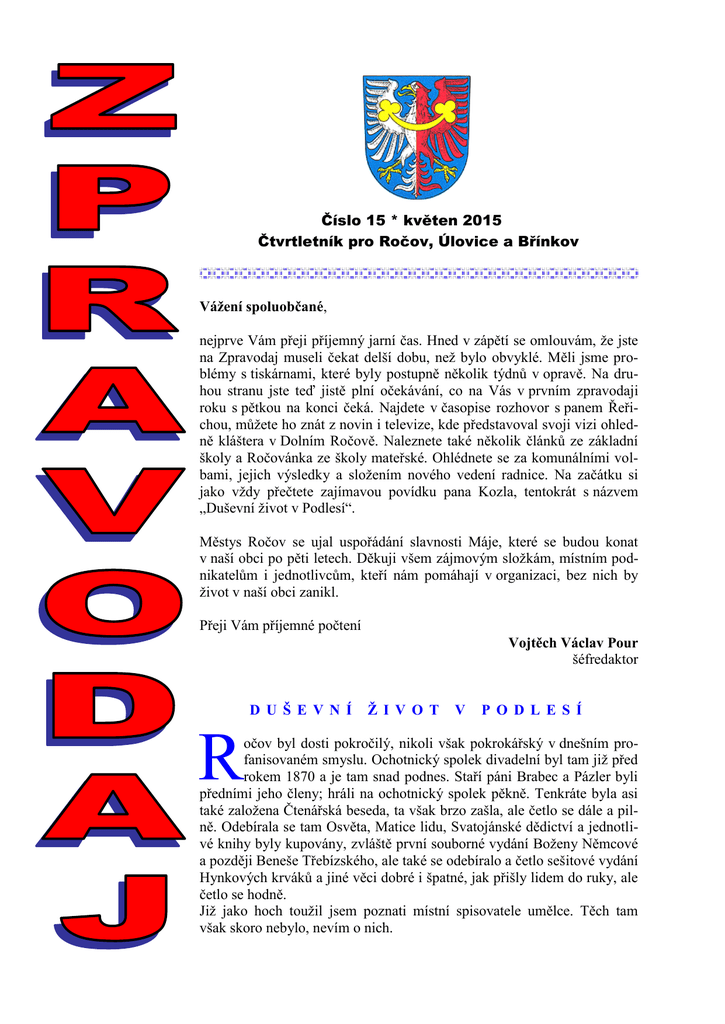 Číslo 15 * květen 2015 Čtvrtletník pro Ročov, Úlovice a Břínkov Vážení spoluobčané, nejprve Vám přeji příjemný jarní čas. Hned v zápětí se omlouvám, že jste na Zpravodaj museli čekat delší dobu, než bylo obvyklé. Měli jsme problémy s tiskárnami, které byly postupně několik týdnů v opravě. Na druhou stranu jste teď jistě plní očekávání, co na Vás v prvním zpravodaji roku s pětkou na konci čeká. Najdete v časopise rozhovor s panem Řeřichou, můžete ho znát z novin i televize, kde představoval svoji vizi ohledně kláštera v Dolním Ročově. Naleznete také několik článků ze základní školy a Ročovánka ze školy mateřské. Ohlédnete se za komunálními volbami, jejich výsledky a složením nového vedení radnice. Na začátku si jako vždy přečtete zajímavou povídku pana Kozla, tentokrát s názvem „Duševní život v Podlesí“. Městys Ročov se ujal uspořádání slavnosti Máje, které se budou konat v naší obci po pěti letech. Děkuji všem zájmovým složkám, místním podnikatelům i jednotlivcům, kteří nám pomáhají v organizaci, bez nich by život v naší obci zanikl. Přeji Vám příjemné počtení Vojtěch Václav Pour šéfredaktor D U Š E V N Í R Ž I V O T V P O D L E S Í očov byl dosti pokročilý, nikoli však pokrokářský v dnešním profanisovaném smyslu. Ochotnický spolek divadelní byl tam již před rokem 1870 a je tam snad podnes. Staří páni Brabec a Pázler byli předními jeho členy; hráli na ochotnický spolek pěkně. Tenkráte byla asi také založena Čtenářská beseda, ta však brzo zašla, ale četlo se dále a pilně. Odebírala se tam Osvěta, Matice lidu, Svatojánské dědictví a jednotlivé knihy byly kupovány, zvláště první souborné vydání Boženy Němcové a později Beneše Třebízského, ale také se odebíralo a četlo sešitové vydání Hynkových krváků a jiné věci dobré i špatné, jak přišly lidem do ruky, ale četlo se hodně. Již jako hoch toužil jsem poznati místní spisovatele umělce. Těch tam však skoro nebylo, nevím o nich. MK ČR E 20377 Zpravodaj č. 15 O nějakém básníkovi také u nás nevím, ale v blízkých Hředlích ještě za mé doby žil básník-samouk Chládek, řemeslem tkadlec, člověk nadaný. Vynikajících dělníků v průmyslu uměleckém také u nás nebylo. Kde by se vzali a z čeho by žili? Kostel a klášter byly vystavěny v 18. století a pak se jen opravovaly. Nemohl se tu vyvinouti ani řemeslník umělecký, ani výtvarný umělec. Byli tu nedalecí architekti Mocker, Sochor a Hilbert, i malíři Holárek nebo Sochor, ale ti nessáli podleského mléka, ti byli vychováváni v ovzduší zcela odlišném. Ve zdejší krajině mohli vyniknuti jen hudebníci, a to zase jen hudebníci výkonní spíše než skladatelé. Od 18. století udrželi se tu Kopřivové; třeba vynikli v Citolibech, přece patřili Podlesí. Jejich následovníků bylo mnoho mezi starými kantory i mezi novými učiteli. Koncem 19. století vynikl Pihert. Muzikantů bylo zde mnoho, opravdový umělec hudebník byl skoro v každé vsi. Pro psychologa jest zajímavé, že toto umění je zde často starou rodinnou výsadou. Má babička ze strany otcovy byla z roku mlynářů a muzikantů Kopřivů, ze kterých pocházeli též Václav a Karel Kopřivové, kantoři v Citolibech, vynikající varhaníci a skladatelé 18. století. Virtuos a koncertní mistr Kopřiva pocházel také z toho rodu. Asi před dvaceti lety mluvili jsme o nich s panem farářem Ondokem z Vinařic. Znal jich několik a potvrdil mi, že veliké hudební nadání zůstalo v tom rodě podnes, i ovšem také lehká muzikantská mysl; neD I V A D L O zbohatnou, ale udrží si smysl pro vše ušlechtilé jako rození umělci. S hudebníky také měli něco společného písničkáři. Chodili po jarmarcích a poutích, zpívali o nešťastných milencích a prodávali písničky. Většinou to byli cizí lidé, ale měli jsme také své. Jest mi se tuto zmíniti o Anně Procházkové z Področova. Za mne byla to již stařenka. Chodívala s nůší a nádobím. Prodávala je po vsích. Cestou skládala nové písničky o vraždách, nešťastných láskách a neštěstích. Dávala je tisknouti u vdovy Jeřábkové ve Slaném. Její muž byl již vetchý stařeček a chodil s ní po vsích a vyhrával na flašinet; nad klášterem měli nový domek, který pak odkázali vnukovi, jemuž jsme obecně říkali „dlouhý Franta“. Ten své babičce písničky psal, jak mu je diktovala. Snad ani psáti neuměla nebo již dobře neviděla. Frantíka Procházku znal jsem již jako dospělého muže, ale bezdětného. Lámal kámen, nad studánkou pálíval vápno z vybraného vápence v pecích, které si po starodávnu vykopal v zemi. Pálil vápno tvrdými pařezy. Nádeničil jiným, hospodařil na poli najatém od knížecích a rád pil kořalku. Písniček Anny měl jsem celý špalíček, který jsem asi před 40 roky dal prof. dru Čeňku Zíbrtovi. Procházková, pokud vím, kostelních a pobožných písniček neskládala. Ty zde prodávali kramáři a písničkáři z Příbramě a odjinud. Písničky světské i pobožné byly po 2 krejcařích. Z knížky Václava Kozla Ročovské obrázky připravil Vojtěch Václav Pour T Ř E T Í H O V Ě K U V E Š K O L E elký počet ročovských, úlovických i břínkovských občanů se dostavilo do třídy ZŠ, kde bylo divadelní představení. Z Loun přijela paní řiditelka městské knihovny se skupinou odvážných žen – hereček. Již několikáté představení nastudovaly a odehrály po okolí, nebo i soutěžily v celostátním klání amatérských divadel, kde úspěšně reprezentovaly náš okres. Tento kus byl, dá se říci, s hvězdičkou, kde si zralé dámy dělají legraci samy ze V –2– MK ČR E 20377 Zpravodaj č. 15 sebe, svých partnerů, lásek, potěšení