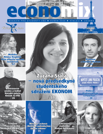 Výstavba nové sportovní haly Na Třebešíně / 39 economix MAGAZÍN PRO STUDENTY VŠE DUBEN 2009 ČÍSLO 2 ZDARMA VŠE tančí jazz dance / 42 Cestopis / 36 Modelka Helena Houdová: Krize položila spoustu neziskovek / 17 Rozhovor s Davidem Markem / 26 Kontroverzní umělec a ředitel Národní galerie Knížák na VŠE / 28 Zuzana Stará – nová předsedkyně studentského sdružení EKONOM / 10 Šrotovné Miřenka Čechová: – co na to říká „Nedělám jednoduchou Škodovka, TPCA a SAP? líbivou zábavu“ / 19 / 34 Zahraniční studentka Madina Nurmatova / 32 Profesor Vladimír Novák o Palachovi... / 20 START UP / 14 2 obsah economix – 2 / 2009 Editorial Před 20 lety jsme přišli do svobody. Z minulého režimu, který je třeba pro zahraniční turisty atrakcí, si nepamatuji nic. První vzpomínky mám až na počátky divokého kapitalismu, kdy mi rodiče u německých hranic koupili první digitální hodinky. Pamatuji si první vlnu kuponové privatizace a pod tím jsem si živě představoval, jak se z klubka odmotává nějaká pěkná barevná příze – to byla ta „první vlna“. Další odmotané vlákno, to už byla „druhá vlna“. Nic špatného se v mých dospívajících očích nedělo, nepotřeboval jsem někoho nenávidět. Mé vrstevníky nespojovalo nic, respektive mohlo nás spojovat neomezené množství věcí, které nám svoboda nabízela. Není to škodlivé? Zatím se v moderní historii mladá generace vždy proti někomu „spikla“, něco kritizovala. A koho máme kritizovat my? Naše rodiče, kteří nám vše mohou dát a vše dovolit? Stát, který nám moc věcí nezakáže? Můžeme obviňovat společnost, že je příliš benevolentní, ale jaké by bylo vyrůstat v kontaktu s rákoskou? Můžeme se pokusit sladce zapomenout, že zdánlivě lze dělat vše, ale nakonec si budeme muset jednu cestu vybrat, a to je právě to největší dilema. Částečnou odpověď můžeme najít v článku Hanky Kubovcové o festivalu Jeden svět. Politici si stěžují, že k volbám nechodí voliči. Volby do parlamentu mnozí z nás „racionálně ignorují“, protože se zdá, že právě náš hlas volby nerozhodne. Jiné to je ve volbách do Akademického senátu VŠE. Zde může i jeden student rozhodnout! Studentští senátoři nejsou svým voličům vzdáleni tolik jako naši parlamentní senátoři a poslanci (nemluvě o evropských poslancích). Své studentské senátory můžete potkat na chodbě školy, můžete vedle nich sedět na přednášce. A až se vás takový senátor zeptá, jestli jste mu dali hlas, co mu řeknete? Abyste nemuseli trapně mlčet, běžte volit a nenechte si tam navolit hrstkou lidí předem vybrané zástupce. Zdraví je více než důležité. Po škole můžete zajít nejen do Rajské zahrady a Akademického klubu, ale také k lékaři. Nemyslím tím samozřejmě psychiatra doc. Chocholouška. Náhlou nevolnost před zkouškou nebo po ní můžete vyřešit v Železniční nemocnici s poliklinikou v Italské ulici. Na to, co může toto zdravotnické zařízení nabídnout studentům a zaměstnancům VŠE, jsme se zeptali jejího ředitele. Utopistické filmy líčí, jak to v budoucnosti vypadat nebude, historické filmy ukazují, jak to nevypadalo v minulosti. Toto řekl jeden významný český umělec, který Economixu před nedávnem poskytl rozhovor. Myslím si, že můžeme dodat: koncept šrotovného jasně líčí, jak by vypadala utopistická záchrana průmyslu, a optimistická predikce jeho zastánců ukazuje, jak to nikdy vypadat nebude. Jestli si chcete tento citát ověřit, přečtěte si články týkající se šrotovného. Božena Němcová by dodala: „Šťastná to automobilka.“ Kdo nechce odhalovat, může se začíst do rozhovoru Pavlíny Máčalové s ekonomem a analytikem Davidem Markem. Profesor Vladimír Novák s námi mluvil o svém studentu Janu Palachovi. Jak by se Palach asi dnes díval na svůj čin, kdyby byl celou událost přežil? Bylo by mu 60 let a třeba by z něho byl učitel. Možná tehdy o podobném činu přemýšlelo více současných šedesátníků. Svůj čin ale neuskutečnili. Možná založili rodiny a tím splnili základní úděl člověka. Tento úděl Palach nesplnil, ale možná byl pro nás svým krátkým životem důležitější víc, než si myslíme. Podívejme se na Palachovu evidenční kartu z archivu VŠE, kterou pro nás našla Kristýna Straková. Rád bych poděkoval Marcelu Bodnárovi, který byl u Economixu od jeho zrodu a teď se vypravil vstříc novým metám. Ať se mu daří! Studentské sdružení Ekonom, které vydává náš magazín, má novou předsedkyni. Je jí Zuzana Stará, sympatická dívka, o které se v magazínu také dočtete. Co by dal mladý Fellini nebo Godard za to, kdyby mohli svá raná dílka předvést v některé z aul VŠE? Dali by mnoho. Po velkých prázdninách se pokusíme uspořádat grandiózní festival amatérských filmů. Proto točte a poté nám svůj film (bez omezení tématu) pošlete a my jej promítneme na stříbrné plátno. Bartoška nám bude závidět! Vladimír Štípek šéfredaktor Šance / 3 SVOČ / 3 Není vám jedno, co se děje ve škole? Volte své zástupce do Akademického senátu! / 4 Doc. Fischer: Mýty, nepravdy a lži v článku pana Steinera / 6 Vyjádření k jednotlivým bodům v reakci doc. Jakuba Fischera na článek Otazníky nad volbami do AS FIS VŠE v Economixu č. 1/2009 / 7 Jak je zabezpečena regulérnost voleb do AS VŠE? / 8 Aktuality / 8 Kolejné podraží / 9 Soutěž o nejlépe vymalovaný pokoj / 9 Economix je k dispozici na kolejích / 9 Zuzana Stará – nová předsedkyně studentského sdružení EKONOM /10 Komplexní zdravotní péče pro studenty a zaměstnance VŠE jen pár kroků od školy na Žižkově / 11 Pro koho jsou prospěchová stipendia? / 12 BiblioBox / 13 Orientujeme se v ISIS V / 13 START UP – Způsob, jak podpoři