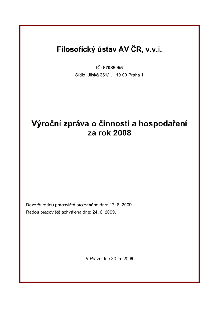 Filosofický ústav AV ČR, v.v.i. IČ: 67985955 Sídlo: Jilská 361/1, 110 00 Praha 1 Výroční zpráva o činnosti a hospodaření za rok 2008 Dozorčí radou pracoviště projednána dne: 17. 6. 2009. Radou pracoviště schválena dne: 24. 6. 2009. V Praze dne 30. 5. 2009 OBSAH I. II. III. 1. 2. 3. 4. IV. V. Informace o složení orgánů veřejné výzkumné instituce a o jejich činnosti či o jejich změnách a) Výchozí složení orgánů pracoviště b) Změny ve složení orgánů c) Informace o činnosti orgánů Informace o změnách zřizovací listiny Hodnocení hlavní činnosti Vědecká činnost pracoviště a uplatnění jejích výsledků a) stručná charakteristika vědecké činnosti pracoviště b) výčet několika nejdůležitějších výsledků vědecké činnosti a jejich aplikací c) nejvýznamnější popularizační aktivity d) domácí a zahraniční ocenění zaměstnanců pracoviště e) další specifické informace o pracovišti Vědecká a pedagogická spolupráce FLÚ s vysokými školami a) nejvýznamnější vědecké výsledky pracoviště vzniklé ve spolupráci s vysokými školami b) nejvýznamnější výsledky činnosti výzkumných center a dalších společných pracovišť FLÚ s vysokými školami Činnost Centra pro teoretická studia (CTS) Činnost Centra medievistických studií (CMS) Činnost Centra globálních studií (CGS) Činnost Centra biblických studií (CBS) Výsledky Centra pro práci s patristickými, středověkými a renesančními texty publikované v roce 2008 c) spolupráce s vysokými školami na uskutečňování doktorských studijních programů a magisterského a bakalářského studia d) vzdělávání středoškolské mládeže Spolupráce FLÚ s dalšími institucemi a s podnikatelskou sférou a) společné projekty výzkumu a vývoje podpořené z veřejných prostředků d) odborné expertizy zpracované v písemné formě pro státní orgány a instituce Mezinárodní vědecká spolupráce FLÚ a) přehled mezinárodních projektů, které FLÚ řeší v rámci mezinárodních vědeckých programů b) nejvýznamnější výsledky dosažené v rámci mezinárodní spolupráce c) akce s mezinárodní účastí, které FLÚ organizoval nebo v nich vystupoval jako spolupořadatel d) výčet jmen nejvýznamnějších zahraničních vědců, kteří navštívili FLÚ e) počet fungujících meziústavních dvoustranných dohod Hodnocení další a jiné činnosti Informace o opatřeních k odstranění nedostatků v hospodaření a zpráva, jak byla splněna opatření k odstranění nedostatků uložená v předchozím roce -2- 4 4 5 5 7 7 7 7 9 11 13 13 14 14 15 16 18 25 28 28 29 29 29 29 30 30 30 31 32 33 35 36 36 VI. Finanční informace o skutečnostech, které jsou významné z hlediska posouzení hospodářského postavení instituce a mohou mít vliv na její vývoj 1. Údaje o majetku a) Informace o vybavení v.v.i. nemovitým majetkem b) Využití nemovitého majetku c) Účetní metoda odpisování d) Věcná břemena spojená s nemovitostmi e) Pohledávky a závazky 2. Hodnocení a analýza dalších údajů o hospodaření FLÚ a) Výnosy b) Náklady c) Náklady na zahraniční spolupráci d) Informace o projektech VII. Předpokládaný vývoj činnosti pracoviště VIII. Aktivity v oblasti ochrany životního prostředí IX. Aktivity v oblasti pracovněprávních vztahů Přílohy Příloha č. 1: Anotace nejvýznamnějších výsledků a jejich aplikací Příloha č. 2: Soupis dalších výsledků vědecké činnosti Příloha č. 3: Ostatní popularizační aktivity FLÚ Příloha č. 4: Knižní publikace vydané FLÚ v nakladatelství Filosofia v roce 2008 Příloha č. 5: Zpráva nezávislého auditora o ověření řádné účetní závěrky sestavené k 31. 12. 2008 / Rozvaha k 31. 12. 2008, Výkaz zisků a ztrát – VVI/ (VI. A.) Příloha č. 6: Výnosy dle zdroje Příloha č. 7: Mzdové prostředky Příloha č. 8: Základní personální údaje Příloha č. 9: Tabulková část výroční zprávy -3- 36 36 37 37 38 38 38 38 38 39 40 41 41 42 42 43 45 53 79 84 87 88 89 91 92 I. Informace o složení orgánů veřejné výzkumné instituce a o jejich činnosti či o jejich změnách a) Výchozí složení orgánů pracoviště Pověřen vedením od 1. 1. 2007: PhDr. Pavel Baran, CSc. Ředitel pracoviště: PhDr. Pavel Baran, CSc. jmenován s účinností od: 1. 5. 2007 Rada pracoviště zvolena dne 29. 1. 2007 ve složení: předseda: doc. PhDr. Milan Mráz, CSc., FLÚ místopředseda: Ing. Jiří Chotaš, PhD., FLÚ členové: PhDr. Pavel Baran, CSc., FLÚ PhDr. Jiří Beneš, FLÚ RNDr. Adolf Filáček, CSc., FLÚ doc. PhDr. Vilém Herold, CSc., FLÚ doc. Filip Karfík, PhD., FF UK prof. PhDr. Pavel Kouba, FF UK prof. RNDr. Jaroslav Peregrin, CSc., FLÚ prof. Miroslav Petříček, Dr., FF UK prof. PhDr. Milan Sobotka, DrSc., FF UK prof. PhDr. Stanislav Sousedík, CSc., KTF UK PhDr. Martin Steiner, FLÚ doc. Karel Thein, PhD., FF UK PhDr. Josef Zumr, CSc., FLÚ Dozorčí rada jmenována dne 1. 5. 2007 ve složení: předseda: prof. PhDr. Jaroslav Pánek, DrSc., AR AV ČR místopředseda: PhDr. Vladimír Svoboda, CSc., FLÚ členové: PhDr. Petr Kratochvíl, CSc., VR AV ČR prof. PhDr. Josef Krob, CSc., FF MU -4- prof. JUDr. Václav Pavlíček, CSc., PF UK prof. PhDr. Tibor Pichler, CSc., FLÚ SAV prof. Ing. Rudolf Zahradník, DrSc., ÚFCH JH b) Změny ve složení orgánů: Nedošlo k žádným změnám ve složení orgánů pracoviště. c) Informace o činnosti orgánů: Ředitel: Vědeckoorganizační činnost ředitele FLU dr. Barana byla v roce 2008 zaměřena do několika hlavních oblastí. V prvních měsících tohoto roku musel dr. Baran věnovat velké úsilí závěrečné fázi jednání o majetkoprávních záležitostech týkajících se akademického areálu Jilská-Husova. Významně přispěl k tomu, že zainteresované ústavy dospěly k definitivní dohodě v této