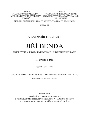 SPISY OPERA FILOSOFICKÉ FAKULTY FACULTATIS PHILOSOPHICAE MASARYKOVY UNIVERSITY ÜNIVERSITATIS MASARYKIANAE V BRNĚ BRUNENSIS ŘÍDÍ JUL. GLÜCKLICH, FEANT. NOVOTNÝ A FEANT. TRÁVNÍČEK ČÍSLO 39 VLADIMÍR HELFERT JIŘÍ BENDA PŘÍSPĚVEK K PROBLÉMU ČESKÉ HUDEBNÍ EMIGRACE II. ČÁSTI I. DÍL (GOTA 1750—1774) GEORG BENDA. DES II. TEILES 1. ABTEILUNG (GOTHA 1750—1774) (MIT EINEM DEUTSCHEN AUSZUG) BRN0 1934 VYDÁVÁ FILOSOFICKÁ FAKULTA S PODPOROU MINISTERSTVA ŠKOLSTVÍ A NÁRODNÍ OSVĚTY V KOMISI KNIHKUPECTVÍ A. PÍŠA V BRNĚ, ČESKÁ 28 Předmluva. Přicházím-li opožděně s druhou částí monografie o Jiřím Bendovi, jsou toho příčinou zevní okolnosti, jež překonati nebylo v mých silách. Tato část zahrnuje Bendův život a Bendovu tvorbu v letech 1750—1774, t. j. od nastoupení úřadu maestra v Gotě až do příchodu Seylerovy divadelní společnosti do Goty, kdy v uměleckých poměrech gotských i ve směru Bendovy tvorby nastal důležitý obrat. Metodická zásada celé této monografie o umělci spočívá na tom noetickém základě, že k uspokojivému poznání osobnosti tvůrcovy a jeho díla mohu dospět jedině tehdy, jestliže poznám inspirační zdroj, z něhož dílo vyrostlo, a hlavně vnitřní strukturu díla. Inspiračním zdrojem přitom rozumím všechny poznatelné podmínky, jež působily na vývoj umělecké osobnosti, i všechny podněty, jež určovaly směr a kvalitu díla. Poznat inspirační zdroj je otázka historická a psychologická. Poznáním inspiračního zdroje, takto do šíře i do hloubky pojatého, vyčerpávám však pouhou polovinu svého úkolu. Druhá polovina teprve dovršuje a uzavírá problémy umělecké monografie. Je to poznání vnitřní struktury a vnitřního organismu vytvořeného díla, jeho vývojové linie, jeho poměru k umění, jež je obklopovalo v minulosti i v současnosti, po případě i v následnosti, jeho funkčnosti v současné i v pozdější době. Toto poznání se děje cestou analytickou a je otázkou estetickou a otázkou hudebně-historické kritiky a též sociologie umění. Teprve tímto dvojím poznáním dospívám k dokonalému proniknutí díla; teprve na těchto základech mohu přikročit ke konečnému synthetickému obrazu tvůrce. Věren této metodické zásadě, podávám v tomto díle nejprve ony zevní podmínky, jež sloužily Bendovi v Gotě za inspirační zdroj. Při tom jsem se snažil pečlivě se vyvarovat všech odboček, 1* 4 které by naturalisticky kupily sebraný materiál a tím rušily jednotnou koncepci a jednotný styl knihy. Nešlo mi zde o hromadění zevních fakt, nýbrž o postižení d u š e v n í c h a myšlenkových proudů, které vanuly tehdy Gotou a působily na utváření psychického organismu Bendova. Neboť především tyto ideové proudy — a možno říci, jedině ony — mají význam pro tvůrčí vývoj umělcův. Nerad, přinucen dnešními mimořádnými hospodářskými poměry, se odhodlávám oddělit od tohoto dílu knihy díl druhý, který se zabývá skladatelskou činností Bendovou v 1. 1750—1774 a podává analysu jeho díla. Oba díly, tento historický a druhý estetickoanalytický a hudebně-historický, tvoří celek a vzájemně se doplňují. Teprve tímto druhým dílem bude tato druhá část ukončena. Prameny tohoto s v a z k u : V hojné míře je poskytl dřívější vévod. archiv zámku Friedensteinu v Gotě, nyní stát. durynský archiv v Gotě. Jsou to zvláště akta z úřední registratury: Bendova Dieneracta (UUXXXVII, 52). Byla sebrána do jednoho svazku r. 1778, když Benda opouštěl gotské vévodské služby a když v jeho služebních aktech se hledaly doklady o tom, jaké má povinnosti k vévodské komoře. Druhá skupina jsou d i v a d e l n í akta (YY X, 24,36,46), obsahující dokumenty o divadle, dále akta o dvorní k a p e l e (UU XXXVII. 40, 45, 56), většinou ve formě platebních rozkazů, jež posílal vévoda své komoře nebo dvor. maršálskému úřadu. K tomu přistupují další svazky platebních rozkazů, týkající se celého dvora (Y Y V. 3. 51. 52) a akta o peněžních nákladech na divadlo (E XIII, A). Tato akta se doplňují s t. zv. C o d i c e s c h a r t a c e i (Cod. Chart.), které obsahují čistopisy nebo i koncepty s vlastnoručními přípisky vévodovými, a to aktů, z nichž mnohé jsou též obsaženy v U U XXXVII. a j. Jsou to zejména Cod. Chart. 1332 (čistopisy, autografy), 1334 (koncepty o divadle), 1332, 8 a 1335, 2 (divadlo). Důležité jsou též d i v a d e l n í i n v e n t á ř e jednak v Cod. Chart. 1332, 7, jednak v X X VI, 78. Jiné prameny, pokud netvoří ucelenou skupinu, budou uvedeny vždy na příslušném místě. Zvláštní skupinu gotských pramenů tvoří t. zv. F o u r i r Bücher. Dvorní písař (Fourir) měl povinnost do zvláštní knihy psát deník dvorního života. Byly zapisovány především významné události dvorní, jako narozeniny, jmeniny a úmrtí členů panov- 5 nické rodiny, dále sepisováni účastníci při dvorní tabuli, kde kdo seděl a pod. Dále se zapisovaly i jiné události, jako návštěvy cizích hostí u dvora a při tom také, kdy hrála kapela, byla-li dvorní komedie nebo intermezzo. Tak vznikl deník dvorního života, skrývající i pro nás nejeden cenný záznam. Úroveň tohoto deníku je ovšem nestejná, podle toho, zdali si fourir všímal více pouhých dvorních okázalostí, nebo také událostí rázu kulturního. Fourir-Bücher (budou zkracovány F.-B.) jsou zachovány pro celé období Bendova působení v Gotě s některými malými mezerami, o nichž bude učiněna zmínka v dalším výkladě. Přinesly zvláště cenný doplněk k dějinám gotského divadla a intermezza. V první a třetí kapitole jsem se opíral nejvíce o tištěné prameny. Je to hlavně korespondence mezi vévodkyní Luisou Dorotou a Voltairem a Grimmova Corréspondence l
