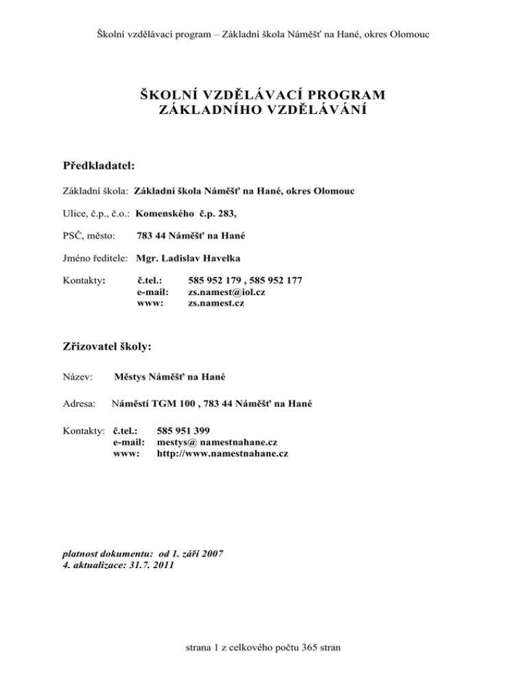 Školní vzdělávací program – Základní škola Náměšť na Hané, okres Olomouc ŠKOLNÍ VZDĚLÁVACÍ PROGRAM ZÁKLADNÍHO VZDĚLÁVÁNÍ Předkladatel: Základní škola: Základní škola Náměšť na Hané, okres Olomouc Ulice, č.p., č.o.: Komenského č.p. 283, PSČ, město: 783 44 Náměšť na Hané Jméno ředitele: Mgr. Ladislav Havelka Kontakty: č.tel.: e-mail: www: 585 952 179 , 585 952 177 [email protected] zs.namest.cz Zřizovatel školy: Název: Městys Náměšť na Hané Adresa: Náměstí TGM 100 , 783 44 Náměšť na Hané Kontakty: č.tel.: e-mail: www: 585 951 399 mestys@ namestnahane.cz http://www.namestnahane.cz platnost dokumentu: od 1. září 2007 4. aktualizace: 31.7. 2011 strana 1 z celkového počtu 365 stran Školní vzdělávací program – Základní škola Náměšť na Hané, okres Olomouc Historie školy Základní škola Náměšť na Hané, okres Olomouc provozuje svoji činnost ve dvou budovách. Budova I. stupně v ulici Zákostelí 92 byla postavena v roce 1910. Budova II. stupně v ulici Komenského 283 byla postavena roce 1925. V roce 2004 byla dokončena rekonstrukce školní jídelny a v roce 2005 byla postavena nová tělocvična. Charakteristika školy Základní škola Náměšť na Hané je úplná škola s devíti postupnými ročníky. Na prvním stupni (1. aţ 5. ročník) je pět tříd, na druhém stupni (6. aţ 9. ročník) je zpravidla po dvou paralelních třídách. Kapacita školy je stanovena na 360 ţáků, k 30. 9. 2006 měla škola 258 ţáků. Součástí školy je školní druţina, která sídlí v budově I. stupně na ulici Zákostelí 92. Kapacita školní druţiny je od 1.9. 2007 30 ţáků. Další součástí školy je školní jídelna, která také sídlí v budově I. stupně na ulici Zákostelí 92. Kapacita školní jídelny je 250 obědů. Škola poskytuje na základě ţivnostenského oprávnění v rámci své doplňkové činnosti restaurační a ubytovací sluţby a pronajímá své prostory v době, kdy nejsou vyuţívány pro výuku. Škola je spádovou školou pro okolní obce. Jedná se o obce Drahanovice, Stříţov, Ludéřov, Lhota pod Kosířem, Loučany a Olbramice. Téměř 40 % ţáků dojíţdí z okolních obcí. Této skutečnosti musí být přizpůsoben začátek vyučování a rozvrh hodin. Vybavení školy Materiální Škola je dobře vybavena učebnicemi. Učební pomůcky jsou vesměs starší, při výuce je částečně vyuţíván výukový SW. Pro další studium a práci ţáků i pedagogů je k dispozici školní knihovna. Literatura, učebnice, učební pomůcky a výukový SW jsou průběţně doplňovány v rámci finančních moţností o nové. Na odborné učebny navazují kabinety se sbírkami učebních pomůcek. Prostorové Výuka probíhá ve dvou budovách, vzdálených od sebe asi 700 metrů. Součástí obou budov je školní dvůr a pozemek. Ani jedna budova nemá parkoviště. Budova odloučeného pracoviště na ulici Zákostelí 92 slouţí celému I. stupni. V prvním patře budovy je sborovna, učebna hudební výchovy, pět tříd a kabinet. V přízemí budovy jsou šatny a školní druţina, která má k dispozici dvě místnosti a malou tělocvičnu. Školní druţina vyuţívá malé hřiště, které je na pozemku za školní budovou. V této budově také sídlí pobočka výtvarného oboru ZUŠ Olomouc a pobočka hudebního oboru ZUŠ Litovel. Hlavní budova na ulici Komenského 283 slouţí celému druhému stupni. V této budově sídlí vedení školy, jsou zde všechny třídy a sborovna, odborné učebny a kabinety se sbírkami (fyzika, chemie, přírodopis, zeměpis, hudební výchova, výtvarná výchova, cizí jazyky, dílna, cvičná kuchyň a učebna výpočetní techniky a knihovna ). Součástí budovy je také tělocvična se sociálním zařízením a kabinetem. V suterénu budovy se nachází šatny. strana 2 z celkového počtu 365 stran Školní vzdělávací program – Základní škola Náměšť na Hané, okres Olomouc Technické Jednou z priorit školy ve výuce i v běţném chodu školy je vyuţití informačních a komunikačních technologií. Vybavenost školy touto technikou ale zatím není dostačující. Pro výuku nejen ICT ale i dalších předmětů slouţí učebna výpočetní techniky s 26 stanicemi. K dispozici je dataprojektor a interaktivní tabule e-Beam. Pro práci ţáků je k dispozici počítač v knihovně. Učitelé mají k dispozici počítač ve sborovně a notebooky. NA I. stupni jsou tři učebny vybaveny z projektu Moderní výuka financovaného z prostředků EU OPVK interaktivní tabulí SMART Board s příslušenstvím. Pro výuku je z tohoto projektu na I. stupni k dispozici 15 notebooků zapojených do školní sítě. Na II. stupni jsou z projektu Moderní výuka do škol instalovány 2 interaktivní tabule SMART Board s příslušenstvím a vizualizér. Na II. stupni škola ještě disponuje učebnou s PC, dataprojektorem, interaktivní tabulí, hlasovacím zařízením a zvukovou aparaturou, za pomoci kterých je realizována výuka za podpory IVH (interaktivních výukových hodin) certifikovanými učiteli, jako součást projektu „IVOŠ – zvyšování kvality ve vzdělávání zavedením interaktivní výuky do škol“, registrační číslo projektu CZ.1.07/1.1.04/01.0154. Čtyři starší, ale vyhovující počítače, má k dispozici druţina. Všechny počítače ve školní druţině jsou připojeny na internet. Počítače v obou budovách jsou propojeny do počítačové sítě, přes kterou mají ţáci i učitelé přístup na internet. Kaţdý pracovník školy a kaţdý ţák školy má své přístupové heslo do školní počítačové sítě, svůj prostor na serveru pro ukládání dat a svou e-mailovou schránku s adresou. V kanceláři školy a sborovně na I. stupni je umístěna kopírka, kterou mohou vyuţívat pedagogové. Technické vybavení školy je j