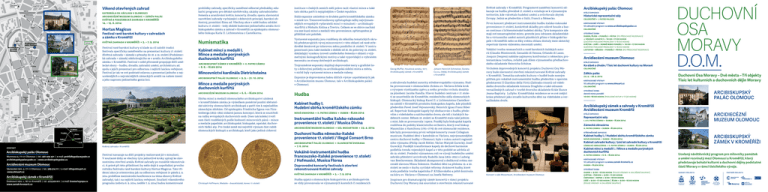 Víkend otevřených zahrad katedrála sv. václava v olomouci arcidiecézní muzeum olomouc • zdíkův palác květná a podzámecká zahrada v kroměříži 14. – 15. 6. 2014 Hortus Magicus Festival raně barokní kultury v zahradách a zámku v Kroměříži Arcibiskupský palác Olomouc květná zahrada v kroměříži • 5. – 7. 9. 2014 Festival raně barokní kultury si klade za cíl založit tradici festivalu specificky zaměřeného na prezentaci kultury 17. století (Květná zahrada + zámek) s přesahy do 18. a 19. století (Podzámecká zahrada + zámek) odehrávajícího se v areálu Arcibiskupského zámku v Kroměříži. Festival v sobě přirozeně propojuje dílčí umělecké obory – hudbu, divadlo, zahradní umění, architekturu ad. spolu s jejich prezentací pro odbornou i nejširší laickou veřejnost. Festival je tak ve své podstatě oslavou a prezentací jednoho z nejucelenějších a nejvzácnějších zámeckých areálů na našem území a jeho naprosto jedinečného genia loci. prohlídky zahrady, specificky zaměřené odborné přednášky, edukační programy pro dětské návštěvníky, ukázky zahradnického řemesla a aranžování květin, koncerty, divadlo, opera, slavnostní nasvětlení zahrady vycházející z dobových principů, barokní ohňostroj, promítání filmu ad. Všechny akce v sobě budou odrážet kulturu 17. století – tedy období budování jedinečného areálu Arcibiskupského zámku a zahrad v Kroměříži za episkopátu olomouckého biskupa Karla II. Lichtensteina z Castelkornu. instituce v českých zemích měli právo razit vlastní mince a také tato sbírka patří k nejúplnějším v České republice. Numismatika Vystavené exponáty jsou rozděleny do několika tematických okruhů představujících vývoj mincovnictví v této oblasti od raně-středověké denárové po tolarovou měnu pozdního 18. století. V centru pozornosti jsou také medaile z období od 16. do poloviny 19. století, dokládající vysokou úroveň uměleckého řemesla v oblasti s výjimečnými ikonografickými motivy a také vypovídající o vybraném mecenátu ze strany dotčených arcibiskupů. Kabinet mincí a medailí I. Mince a medaile porýnských duchovních kurfiřtů arcibiskupský zámek v kroměříži • ii. patro zámku • 6. 6. – říjen 2014 Mincovnictví kardinála Dietrichsteina arcibiskupský palác olomouc • 9. 9. – 31. 10. 2014 Mince a medaile porýnských duchovních kurfiřtů arcidiecézní muzeum olomouc • 6. 6. – říjen 2014 Sbírka mincí a medailí olomouckého arcibiskupství uložená v kroměřížském zámku je výsledkem poměrně pozdní sběratelské aktivity olomouckých arcibiskupů a patří tím k nejmladším zámeckým sbírkám. Od episkopátu Friedricha Egona von Fürstenberga (1853–1891) získává jasnou koncepci, která se soustředí na ražby evropských duchovních osob. Dnes tak kolekci tvoří osm částí rozdělených podle hodností mincovních pánů – mince a medaile papežské, arcibiskupské, biskupské, opatské, duchovních řádků atp. Pro české země má největší význam část ražeb olomouckých biskupů a arcibiskupů, kteří jako jediná církevní kontakt Arcibiskupský palác Olomouc Wurmova 9, 771 01 Olomouc | tel.: 587 405 421 | e-mail: [email protected] [email protected] | www.arcibiskupskypalac.cz Arcidiecézní muzeum Olomouc Václavské nám. 3, 771 11 Olomouc | tel.: 585 514 111 | e-mail: [email protected] www.olmuart.cz Arcibiskupský zámek v Kroměříži Sněmovní nám. 1, 767 01 Kroměříž | tel.: 573 502 011 | e-mail: [email protected] www.zamek-kromeriz.cz Festival navazuje na dílčí projekty realizované již v minulosti. V současné doby se všechny tyto jednotlivé kroky upírají ke slavnostnímu otevření areálu Květné zahrady po rozsáhlé rekonstrukci. A právě při této příležitosti by mělo dojít k uspořádání prvního ročníku festivalu raně barokní kultury Hortus Magicus. Tato třídenní akce je orientována jak na odbornou veřejnost (v pátek 5. 9. 2014 proběhne mezinárodní konference na téma obnovy Květné zahrady), tak i na nejširší laickou veřejnost. Součástí víkendového programu (sobota 6. 9. 2014, neděle 7. 9. 2014) budou komentované Stálá expozice umístěná ve druhém patře kroměřížského zámku v místě tzv. Trezorové knihovny zpřístupňuje ražby nejvýznamnějších evropských vydavatelů mincí v minulosti – arcibiskupů-kurfiřtů z Mohuče, Kolína a Trevíru. Celkem se ve sbírce nachází cca 950 kusů mincí a medailí této provenience, zpřístupněno je přibližně 400 položek. Trojrozměrné exponáty doplňují doprovodné texty a grafické listy s dobovými pohledy na arcibiskupská sídelní místa a města, v nichž byly vystavené mince a medaile raženy. Expozice je doprovázena řadou dílčích výstav uspořádaných jak v Arcidiecézním muzeu Olomouc, tak v Arcibiskupském paláci v Olomouci. Vokální tvorba renesančních a raně barokních italských autorů (Claudio Monteverdi, Gesualdo di Venosa, Orlando di Lasso, Josquin Desprez) nabídne zajímavou konfrontaci s německou protestantskou tvorbou, zvláště pak dílem významného předbachovského skladatele Heinricha Schütze. Georg Muffat, Houslová sonáta, 1677, Arcibiskupský zámek v Kroměříži Johann Heinrich Schmelzer, Sonáta Cu-cu, (1669), Arcibiskupský zámek v Kroměříži květná zahrada v kroměříži • 5. – 7. 9. 2014 Hudba spjatá s olomouckým biskupstvím a arcibiskupstvím se vždy provozovala ve významných kostelích či rezidencích Inspirace pro dramaturgický záměr koncertů v rámci projektu Duchovní Osy Moravy má souvislost s otevřením rekonstruované Hudba Kabinet hudby I. Hudební sbírka kroměřížského zámku nová knihovna • ii. patro zámku • duben – říjen 2014 Instrumentální hudba italsko-rakouské pro