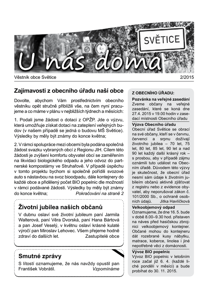 Věstník obce Světice Zajímavosti z obecního úřadu naší obce Dovolte, abychom Vám prostřednictvím obecního věstníku opět stručně přiblížili vše, na čem nyní pracujeme a co máme v plánu v nejbližších týdnech a měsících: 1. Podali jsme žádost o dotaci z OPŽP. Jde o výzvu, která umožňuje získat dotaci na zateplení veřejných budov (v našem případě se jedná o budovu MŠ Světice). Výsledky by měly být známy do konce května; 2. V rámci spolupráce mezi obcemi byla podána společná žádost svazku vybraných obcí z Regionu JIH. Cílem této žádosti je zvýšení komfortu obyvatel obcí se zaměřením na likvidaci biologického odpadu a jeho odvoz do partnerské kompostárny ve Struhařově. V případě úspěchu v tomto projektu bychom si společně pořídili svozové auto s nástavbou na svoz bioodpadu, dále kontejnery do každé obce a přidělený počet BIO popelnic dle možností v rámci podávané žádosti. Výsledky by měly být známy do konce května; Pokračování na straně 2 Životní jubilea našich občanů V dubnu oslaví své životní jubileum paní Jarmila Walterová, paní Věra Dvorská, paní Hana Bártová a pan Josef Veselý, v květnu oslaví krásné kulaté výročí pan Miroslav Lehovec. Všem přejeme hodně zdraví do dalších let. Zastupitelé obce Smutné zprávy S lítostí oznamujeme, že nás navždy opustil pan František Vobrátil. Vzpomínáme 2/2015 Z obecního úřadu: Pozvánka na veřejné zasedání Zveme občany na veřejné zasedání, které se koná dne 27.4. 2015 v 19.00 hodin v zasedací místnosti Obecního úřadu Výzva Obecního úřadu Obecní úřad Světice se obrací na své občany, kteří se v červnu, červenci a srpnu dožívají životního jubilea – 70 let, 75 let, 80 let, 85 let, 90 let a nad 90 let každý další krásný rok – s prosbou, aby v případě zájmu oznámili tuto událost na Obecním úřadě. Důvodem této výzvy je skutečnost, že obecní úřad nesmí sám údaje k životním jubileím občanů aktivně zjišťovat z registru nebo z evidence obyvatel, aby neporušoval zákon č. 101/2000 Sb., o ochraně osobních údajů. Jitka Havlíčková Velkoobjemový odpad Oznamujeme, že dne 16. 5. bude v době 8.00–9.30 hod. přistaven na náves před hasičskou zbroj nici velkoobjemový kontejner. Občané mohou do kontejneru dát rozebrané kusy nábytku, matrace, koberce, linolea i jiné nepotřebné věci z domácnosti. Vývoz BIO popelnic Vývoz BIO popelnic v letošním roce začal již 6. 4. (každé liché pondělí v měsíci) a bude probíhat do 30. 11. 2015. Věstník obce Světice • 2/2015 Zajímavosti z obecního úřadu obce Světice Pokračování ze strany 1 3. Připravujeme veškeré podklady pro podání žádosti v ROP na rekonstrukci místních komunikací. Žádost může být podána pouze na ty části místních komunikací, které splňují podmínky dotačního titulu, jehož hlavním cílem je podpora podnikání v malých a středních obcích. Další důležitou skutečností je, že na tyto komunikace musí být připravena projektová dokumentace a vydáno stavební povolení. V tomto smyslu splňují dotační požadavky ulice V Zálesí, K Panskému poli, propojené části ulic Lomená, Kolmá, Strmá a Potoční. Výsledky by měly být známy do konce června; 4. V návaznosti na rozpočet pro rok 2015 připravujeme v jarních a letních měsících stavební projekty, které by měly zvýšit komfort i bezpečnost v obci, a to: doplnění veřejného osvětlení v lokalitách a ulicích naší obce; účelové zásahy do vodovodního řadu (instalace sekčních šoupat atd.) a pokračování ve výměnách vodoměrů v obci; zadána příprava projektové dokumentace na tyto projekty: a.)okolí KD Světice – parkování, bezpečnost pro pěší atd.; b.)rekonstrukce vodovodního řadu; 2 5. Pokročily práce na výstavbě nového pavilonu ZŠ Světice. Během následujících 14 dní bude dokončena fasáda a veškeré práce na vnějším plášti objektu. Následně budou probíhat dokončovací práce: terén ní úpravy kolem objektu, instalační práce uvnitř objektu (rozvody vody, odpadů, topení, elektřiny, zabezpečovacích systémů aj.) Stavba by měla být dokončena asi do poloviny měsíce června a do konce června by objekt měl být zkolaudován; 6. Ve spolupráci s městem Říčany nyní spolupracujeme na projektu zvýšení bezpečnosti v silniční dopravě. Výsledkem snažení by měla být instalace úsekového měření v naší obci, a to v úsecích, která pro tato měření budou vhodná. Ze strany obce je cíl naprosto jasný: zpomalit dopravu a zvýšit bezpečnost v obci. Pavel Kyzlink Věstník obce Světice • 2/2015 Částečné zatmění slunce V pátek 20. března se našim pohledům naskytl nezvyklý úkaz, a to částečné zatmění slunce. Podle astronomů to bylo největší zatmění slunce v České republice viditelné mezi lety 2011 a 2026 a o to zajímavější, že bylo krásné počasí. První viditelný kontakt Měsíce se Sluncem nastal v 9 hodin 37 minut a Měsíc v té chvíli začal ukrajovat sluneční kotouč z pravého horního okraje. Postupně se přesouval doleva přes horní polovinu Slunce. Maximum tohoto úkazu, kdy Měsíc „ukousl“ přes 73 % slunečního kotouče, bylo v 10 hodin 46 minut. V tu chvíli bylo zvláštní světlo a ticho. Ptáci si s příchodem zatmění posedali na dráty elektrického vedení a jejich zpěv vůbec nepřipomínal dopoledne, ale spíše zpěv, který známe z večera. Také se citelně ochladilo. Po dosažení maximálního zákrytu se začal Měsíc pomalu odsouvat k levému hornímu okraji, kde v 11 hodin 58 minut Slunce opustil. Další zatmění slunce bude sice v roce 2021, ale zakryto bude pouze 17% slunečního kotouče. Přeji všem našim občanům, aby nekrásnější měsíce v roce – jaro