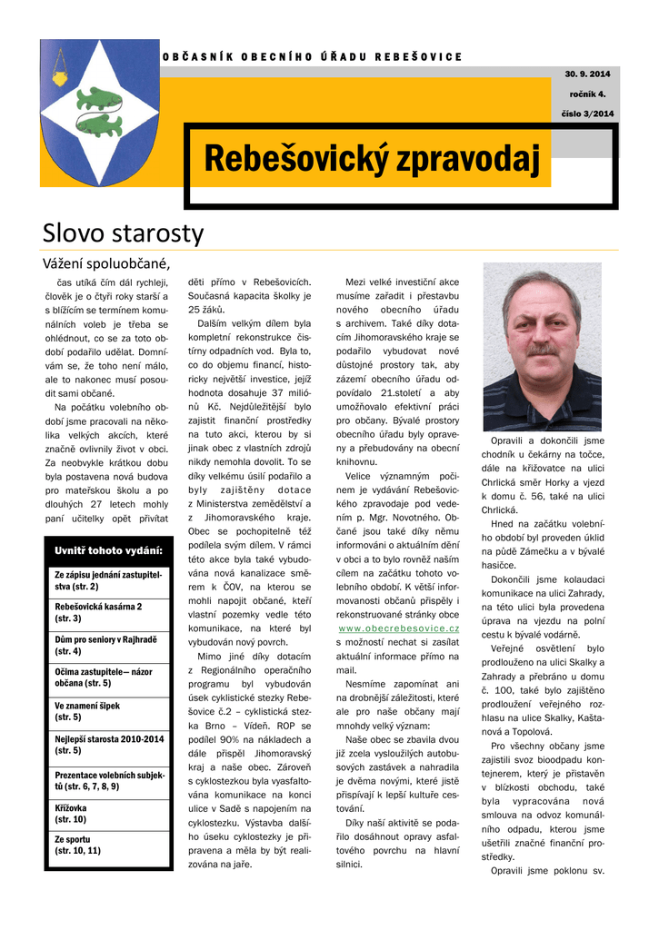 OBČASNÍK OBECNÍHO ÚŘADU REBEŠOVICE 30. 9. 2014 ročník 4. číslo 3/2014 Rebešovický zpravodaj Slovo starosty Vážení spoluobčané, čas utíká čím dál rychleji, člověk je o čtyři roky starší a s blížícím se termínem komunálních voleb je třeba se ohlédnout, co se za toto období podařilo udělat. Domnívám se, že toho není málo, ale to nakonec musí posoudit sami občané. Na počátku volebního období jsme pracovali na několika velkých akcích, které značně ovlivnily život v obci. Za neobvykle krátkou dobu byla postavena nová budova pro mateřskou školu a po dlouhých 27 letech mohly paní učitelky opět přivítat Uvnitř tohoto vydání: Ze zápisu jednání zastupitelstva (str. 2) Rebešovická kasárna 2 (str. 3) Dům pro seniory v Rajhradě (str. 4) Očima zastupitele— názor občana (str. 5) Ve znamení šipek (str. 5) Nejlepší starosta 2010-2014 (str. 5) Prezentace volebních subjektů (str. 6, 7, 8, 9) Křížovka (str. 10) Ze sportu (str. 10, 11) děti přímo v Rebešovicích. Současná kapacita školky je 25 žáků. Dalším velkým dílem byla kompletní rekonstrukce čistírny odpadních vod. Byla to, co do objemu financí, historicky největší investice, jejíž hodnota dosahuje 37 miliónů Kč. Nejdůležitější bylo zajistit finanční prostředky na tuto akci, kterou by si jinak obec z vlastních zdrojů nikdy nemohla dovolit. To se díky velkému úsilí podařilo a byly zajištěny dotace z Ministerstva zemědělství a z Jihomoravského kraje. Obec se pochopitelně též podílela svým dílem. V rámci této akce byla také vybudována nová kanalizace směrem k ČOV, na kterou se mohli napojit občané, kteří vlastní pozemky vedle této komunikace, na které byl vybudován nový povrch. Mimo jiné díky dotacím z Regionálního operačního programu byl vybudován úsek cyklistické stezky Rebešovice č.2 – cyklistická stezka Brno – Vídeň. ROP se podílel 90% na nákladech a dále přispěl Jihomoravský kraj a naše obec. Zároveň s cyklostezkou byla vyasfaltována komunikace na konci ulice v Sadě s napojením na cyklostezku. Výstavba dalšího úseku cyklostezky je připravena a měla by být realizována na jaře. Mezi velké investiční akce musíme zařadit i přestavbu nového obecního úřadu s archivem. Také díky dotacím Jihomoravského kraje se podařilo vybudovat nové důstojné prostory tak, aby zázemí obecního úřadu odpovídalo 21.století a aby umožňovalo efektivní práci pro občany. Bývalé prostory obecního úřadu byly opraveny a přebudovány na obecní knihovnu. Velice významným počinem je vydávání Rebešovického zpravodaje pod vedením p. Mgr. Novotného. Občané jsou také díky němu informováni o aktuálním dění v obci a to bylo rovněž naším cílem na začátku tohoto volebního období. K větší informovanosti občanů přispěly i rekonstruované stránky obce w w w . o b e cr e b e s o v i c e . cz s možností nechat si zasílat aktuální informace přímo na mail. Nesmíme zapomínat ani na drobnější záležitosti, které ale pro naše občany mají mnohdy velký význam: Naše obec se zbavila dvou již zcela vysloužilých autobusových zastávek a nahradila je dvěma novými, které jistě přispívají k lepší kultuře cestování. Díky naší aktivitě se podařilo dosáhnout opravy asfaltového povrchu na hlavní silnici. Opravili a dokončili jsme chodník u čekárny na točce, dále na křižovatce na ulici Chrlická směr Horky a vjezd k domu č. 56, také na ulici Chrlická. Hned na začátku volebního období byl proveden úklid na půdě Zámečku a v bývalé hasičce. Dokončili jsme kolaudaci komunikace na ulici Zahrady, na této ulici byla provedena úprava na vjezdu na polní cestu k bývalé vodárně. Veřejné osvětlení bylo prodlouženo na ulici Skalky a Zahrady a přebráno u domu č. 100, také bylo zajištěno prodloužení veřejného rozhlasu na ulice Skalky, Kaštanová a Topolová. Pro všechny občany jsme zajistili svoz bioodpadu kontejnerem, který je přistavěn v blízkosti obchodu, také byla vypracována nová smlouva na odvoz komunálního odpadu, kterou jsme ušetřili značné finanční prostředky. Opravili jsme poklonu sv. Rebešovický zpravodaj Stránka 2 Slovo starosty—pokračování ze strany 1 Jana Nepomuckého, která doposud jen pustě chátrala. Na tuto opravu jsme získali dotace od Ministerstva kultury, zároveň s touto opravou jsme nechali vytvořit repliku sochy sv. Jana Nepomuckého. Po opravě poklony jsme přistoupili i k úpravě blízkého okolí. Postavili jsme chodník, kde mohou jezdit i maminky s kočárky, upravili jsme prameniště odtoku vody do zbudovaného jezírka, zbudovali nové schodiště a dřevěný mostek a provedli jsme obnovu zeleně vysázením nových keřů. Hned na začátku volebního období jsme rekonstruovali dětské hřiště u obchodu a nové jsme vybudovali v zahradě mateřské školy. Pronajali jsme pozemek a objekt bývalé vodárny Mysliveckému sdružení Svratka. Myslivci zde díky tomu mohli zbudovat voliéry pro odchov bažantů a opravit jinak nevyužívanou budovu na myslivnu. Získali jsme od vojenské správy do majetku dalších 4.868 m2 pozemku v bývalém areálu armády. Účastnili jsme se projektu společných nákupů energií pro obec, čímž jsme ušetřili značné finanční prostředky a zorganizovali jsme podobnou možnost pro všechny občany Rebešovic. Nezapomněli jsme ani na majitele pejsků – umožnili jsme jim vstup do nádvoří zámečku a rozmístili jsme v obci koše na psí exkrementy. Kompletně jsme opravili nejen lavičky na Zámečku mezi břízami a u dětského hřiště, ale vchodové dveře do restaurace a provedli jsme opravu dveří na Zámečku včetně výměny kování a zámků. Díky uzavřené smlouvě o spolupráci na projektu Jižní Morava – Království Komety, naši ob