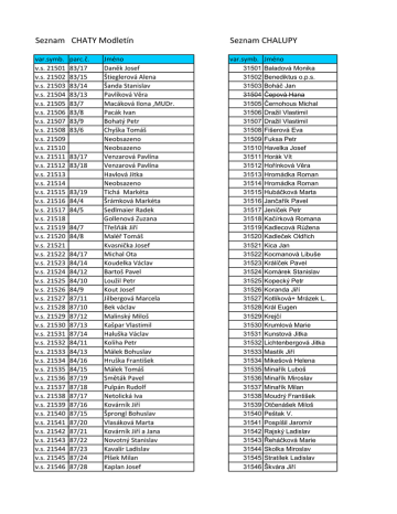 Seznam CHATY Modletín Seznam CHALUPY var.symb. v.s. 21501 v.s. 21502 v.s. 21503 v.s. 21504 v.s. 21505 v.s. 21506 v.s. 21507 v.s. 21508 v.s. 21509 v.s. 21510 v.s. 21511 v.s. 21512 v.s. 21513 v.s. 21514 v.s. 21515 v.s. 21516 v.s. 21517 v.s. 21518 v.s. 21519 v.s. 21520 v.s. 21521 v.s. 21522 v.s. 21523 v.s. 21524 v.s. 21525 v.s. 21526 v.s. 21527 v.s. 21528 v.s. 21529 v.s. 21530 v.s. 21531 v.s. 21532 v.s. 21533 v.s. 21534 v.s. 21535 v.s. 21536 v.s. 21537 v.s. 21538 v.s. 21539 v.s. 21540 v.s. 21541 v.s. 21542 v.s. 21543 v.s. 21544 v.s. 21545 v.s. 21546 var.symb. Jméno parc.č. 83/17 83/15 83/14 83/13 83/7 83/8 83/9 83/6 83/17 83/18 83/19 84/4 84/5 84/7 84/8 84/17 84/14 84/12 84/10 84/9 87/11 87/10 87/12 87/13 87/14 84/11 84/13 84/16 84/15 87/19 87/18 87/17 87/16 87/15 87/20 87/21 87/22 87/23 87/24 87/28 Jméno Daněk Josef Štieglerová Alena Šanda Stanislav Pavlíková Věra Macáková Ilona ,MUDr. Pacák Ivan Bohatý Petr Chyška Tomáš Neobsazeno Neobsazeno Venzarová Pavlína Venzarová Pavlína Havlová Jitka Neobsazeno Tichá Markéta Šrámková Markéta Sedlmaier Radek Gollenová Zuzana Třešňák Jiří Maléř Tomáš Kvasnička Josef Michal Ota Koudelka Václav Bartoš Pavel Loužil Petr Kout Josef Jilbergová Marcela Bek václav Malinský Miloš Kašpar Vlastimil Haluška Václav Koliha Petr Málek Bohuslav Hruška František Málek Tomáš Směták Pavel Pulpán Rudolf Netolická Iva Kovárník Jiří Šprongl Bohuslav Vlasáková Marta Kovárník Jiří a Jana Novotný Stanislav Kavalír Ladislav Plšek Milan Kaplan Josef 31501 31502 31503 31504 31505 31506 31507 31508 31509 31510 31511 31512 31513 31514 31515 31516 31517 31518 31519 31520 31521 31522 31523 31524 31525 31526 31527 31528 31529 31530 31531 31532 31533 31534 31535 31536 31537 31538 31539 31540 31541 31542 31543 31544 31545 31546 Baladová Monika Benediktus o.p.s. Boháč Jan Čepová Hana Černohous Michal Dražil Vlastimil Dražil Vlastimil Fišerová Eva Fuksa Petr Havelka Josef Horák Vít Hořínková Věra Hromádka Roman Hromádka Roman Hubáčková Marta Jančařík Pavel Jeníček Petr Kačírková Romana Kadlecová Růžena Kadleček Oldřich Kica Jan Kocmanová Libuše Králíček Pavel Komárek Stanislav Kopecký Petr Koranda Jiří Kotlíková+ Mrázek L. Král Eugen Krejčí Krumlová Marie Kunstová Jitka Lichtenbergová Jitka Mastík Jiří Mikešová Helena Minařík Luboš Minařík Miroslav Minařík Milan Moudrý František Otčenášek Miloš Peštak V. Pospíšil Jaromír Rajský Ladislav Řeháčková Marie Skolka Miroslav Stratílek Ladislav Škvára Jiří v.s. 21547 v.s. 21548 v.s. 21549 v.s. 21550 v.s. 21551 v.s. 21552 v.s. 21553 v.s. 21554 v.s. 21555 v.s. 21556 v.s. 21557 v.s. 21558 v.s. 21559 v.s. 21560 v.s. 21561 v.s. 21562 v.s. 21563 v.s. 21564 v.s. 21565 v.s. 21566 v.s. 21567 v.s. 21568 v.s. 21569 v.s. 21570 v.s. 21571 v.s. 21572 v.s. 21573 v.s. 21576 v.s. 21577 87/27 87/26 87/25 87/29 87/30 87/31 87/32 87/35 87/34 87/33 87/36 87/37 87/38 87/41 87/40 87/42 87/43 66 87/2 87/3 87/4 87/5 67 68 69 88/8 88/9 Landa Martin Hajdáková Petra Dvořák Petr Štěpánková Miroslava Bredová Jaroslava Kocourková Jaroslava Jaroš František Makalouš Petr Strnad Miroslav Hoferek Břetislav Jankůj Ivan Pinkas Josef Zavřel Miroslav Danielková Ivana Kosinová Jana Michal Petr Komžák Stanislav Valda jiří Douda Miloš Divecká Světlana Moravec Břetislav Kupčák Pavel Musilová Miloslava Bareš Miroslav Gregor Jaroslav Havlíček Petr Kleinerová Marie Fišer Neobsazeno 31547 31548 31549 31550 Vidourková Petra Zajíčková Ivana Záruba Josef Seifert