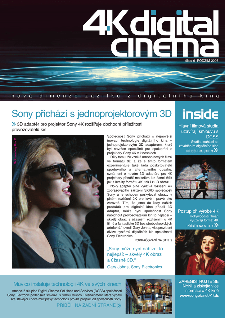 4K číslo 6 PODZIM 2008 n o v á d i m e n z e z á ž i t k u z d i g i t á l n í h o Sony přichází s jednoprojektorovým 3D Photo courtesy Real D 3D adaptér pro projektor Sony 4K rozšiřuje obchodní příležitosti provozovatelů kin Společnost Sony přichází s nejnovější inovací technologie digitálního kina – jednoprojektorovým 3D adaptérem, který byl navržen speciálně pro spolupráci s projektory Sony 4K v kinosálech. Díky tomu, že vzniká mnoho nových filmů ve formátu 3D a že s tímto formátem experimentuje také řada poskytovatelů sportovního a alternativního obsahu, oznámení o novém 3D adaptéru pro 4K projektory přináší majitelům kin šanci těžit jak z kvality formátu 4K, tak i z 3D obrazu. Nový adaptér plně využívá rozlišení 4K zobrazovacího zařízení SXRD společnosti Sony a je schopen poskytovat obrazy v plném rozlišení 2K pro levé i pravé oko zároveň. Tím, že jsme do řady našich produktů pro digitální kino přidali 3D adaptér, může nyní společnost Sony nabídnout provozovatelům kin to nejlepší – skvělý obraz s úžasným rozlišením u 4K filmů a fantastické 3D bez stroboskopických artefaktů.“ uvedl Gary Johns, viceprezident divize systémů digitálních kin společnosti Sony Electronics. k i n a inside Hlavní filmová studia uzavírají smlouvu s DCSS Studia souhlasí se zaváděním digitálního kina PŘÍBĚH NA STR. 3 Postup při výrobě 4K Hollywoodští filmaři využívají formát 4K PŘÍBĚH NA STR. 4 POKRAČOVÁNÍ NA STR. 2 „Sony může nyní nabízet to nejlepší: – skvělý 4K obraz a úžasné 3D.“ Gary Johns, Sony Electronics Muvico instaluje technologii 4K ve svých kinech Americká skupina Digital Cinema Solutions and Services (DCSS) společnosti Sony Electronic podepsala smlouvu s firmou Muvico Entertainment, která vybaví své stávající i nové multiplexy technologií pro 4K projekci od společnosti Sony. PŘÍBĚH NA ZADNÍ STRANĚ ZAREGISTRUJTE SE NYNÍ a získejte více informací o 4K kině www.sonybiz.net/4kdc 4K digital cinema Úvodník Vítejte v čísle 6. Nedávná oznámení společností Warner Bros a Sony Picture, potvrzující větší nabídku nových i remasterovaných filmů ve formátu 4K, stejně jako rostoucí trend využívání nové generace digitálních 4K kamer uznávanými filmaři i začínajícími hvězdami, jasně ukazují, že rok 2008 byl přelomovým okamžikem pro tento formát budoucnosti. Za zmínku také stojí, že loňský doposud největší kasovní úspěch, film Temný rytíř, byl vydán ve formátu 4K. Jeden z předních řetězců kin oznámil své rozhodnutí výrazně POKRAČOVÁNÍ ZE STR. 1 Adaptér je zkonstruován pro plátna o velikosti maximálně 17 metrů. Společnost Sony představila 3D adaptér v rámci technologické části veletrhu ShowEast v Orlandu. 3D adaptér by měl být k dispozici od března 2009. Nové modely objektivových jednotek LKRL-A002 a LKRLA003 mají poměr přiblížení (1,1 – 1,9?), respektive (1,9 – 4,0?) a obsahují optickou a mechanickou soupravu pro každý obraz určený pro pravé i levé oko. Systém má splňovat specifikace DCI pro digitální 3D projekci a překonávat limity šířky pásma a rozlišení všech v současné době dostupných jednoprojektorových 3D systémů. Pokud se projektor SRX-R220 4K použije společně s integrovaným média blokem Sony LMT-200, je schopen dosáhnout 4:4:4 12-bitové RGB signálové cesty z média bloku a zároveň zamezit vzniku stroboskopických artefaktů v podobě, které charakterizují současná 3D řešení. Umožňuje také 3D zobrazení 60P, které je obzvlášť účinné při promítání sportovních záznamů či jiného 3D obsahu s rychlým pohybem. Systém byl vyvinut s cílem poskytnout provozovatelům kin flexibilitu při přepínání mezi zobrazováním obsahu ve formátu 4K a ve formátu 3D. 3D adaptér se připojuje k úchytu na objektivu projektoru a je kompatibilní s v terénu již používanými projektory Sony CineAlta 4K, které využívají média bloky LMT-200. 2 www.sonybiz.net/4kdc rozšířit svou základnu 4K zařízení, díky čemuž si tak bude moci rostoucí počet návštěvníků od nynějška užívat toho nejlepšího možného 2D kina současnosti. Oznámení společnosti Sony o 3D adaptéru je pak příjemnou třešinkou na dortu. Tento unikátní systém je prvním svého druhu, který plně využívá výhod mainstreamových 3D filmů a nově se objevujícího alternativního 3D obsahu s rychlým pohybem. CHRIS DICKINSON, EDITOR 3D podporuje alternativní obsah Oznámení o novém 3D adaptéru pro projekční systémy 4K otevírá trh pro alternativní obsah ve formátu 3D Díky produkcím, jako byl v minulém roce uskutečněný 3D koncert hudební skupiny U2 či v nedávné době fantasticky úspěšné koncertní turné „Hannah Montana/Miley Cyrus: To nejlepší z obou světů“, je formát 3D tou nejžádanější věcí současnosti. Díky novému 3D adaptéru pro projektory Sony CineAlta 4K, který je jediným dostupným systémem, jenž přináší zobrazení 60P pro sportovní přenosy, jsou nyní 3D zařízení schopna zachycovat a zobrazovat alternativní obsah jako nikdy předtím. Todd Cogan, viceprezident pro obchodní rozvoj ve firmě PACE, která je přední společností zabývající se 3D technologiemi, uvádí, že 3D filmy si v kinech vedou mnohem lépe. „Slyšel jsem toho mnoho o obchodních modelech zabývajících se formátem 3D,“ říká Cogan. „Ve srovnání s 2D filmy je u 3D filmů zisk trojnásobný a tyto filmy zůstávají v kinech třikrát déle.“ Společnost PACE se podílela na výrobě 14 z 15 posledních 3D filmů. Další dvě velké produkce, které nyní průmysl s napětím očekává, jsou Avatar Jamese Camerona a záznam Burning Up Tour skupiny Jonas Brother produkovaný společností Disney, přičemž oba tyto filmy