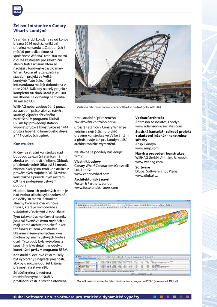 Železniční stanice v Canary Wharf v Londýně V samém srdci Londýna se od konce března 2014 nachází unikátní dřevěná konstrukce. Za pouhých 6 měsíců postavila rakouská společnost WIEHAG toto 300 metrů dlouhé zastřešení pro železniční stanici trati Crossrail, která se nachází v londýnské části Canary Wharf. Crossrail je železniční a stavební projekt ve Velkém Londýně. Tato železniční infrastruktura má být dokončena v roce 2018. Náklady na celý projekt s kompletní sítí drah, která je asi 100 km dlouhá, se odhadují na zhruba 18 miliard EUR. WIEHAG nebyl zodpovědný pouze za stavební práce, ale i za návrh a statický výpočet dřevěného zastřešení. V programu Dlubal RSTAB byl provedený statický výpočet prutové konstrukce ze 1414 prutů z lepeného lamelového dřeva a 111 ocelových trubek. Konstrukce Příčný řez střešní konstrukce nad budovou železniční stanice má zhruba tvar poloviční elipsy. Oblouk překlenuje volně šířku asi 31 metrů. Nosnou skořepinu tvoří konstrukce z provázaných trojúhelníků. Dřevěná konstrukce s pravidelným rastrem 6,0 m je podepřena uzlovými podporami. Na obou koncích podélných stran je nad vodou střecha vykonzolovaná do délky 30 metrů. Zakončení střechy tvoří ocelová kruhová trubka, která je rovnoběžně s ostatními dřevěnými diagonálami. Tyto takzvané zakončovací nosníky jsou zakřivené ve dvou rovinách a mají kromě architektonické funkce též funkci ztužení konstrukce. Hlavním inženýrsko-technickým úkolem byl návrh uzlových bodů z oceli. Tyto body byly vytvořeny a spočítány jako detailní modely s konečnými prvky v programu RFEM. Konstrukční ocelové části musely být vytvořeny s největší přesností, aby bylo možné dodržet kritéria přesnosti na staveništi. Střešní krytina je tvořená membránovými polštáři. V prostřední části je střecha otevřená Výstavba železniční stanice v Canary Wharf v Londýně (foto: WIEHAG) pro usnadnění přirozeného zavlažování vnitřního parku. Crossrail stanice v Canary Wharf je jedním z největších projektů dřevěné konstrukce ve Velké Británii a představuje tak pro Londýn další architektonické zvýraznění. Na stavbě se podílely následující firmy: Vlastník budovy Canary Wharf Contractors (Crossrail) Ltd, Londýn www.canarywharf.com Architektonický návrh Foster & Partners, London www.fosterandpartners.com Vedoucí architekt Adamson Associates, Londýn www.adamson-associates.com Statická kancelář - celkový projekt + zkušební inženýr - konstrukce střechy Arup, Londýn www.arup.com Návrh a provedení konstrukce WIEHAG GmbH, Altheim, Rakousko www.wiehag.com Software Dlubal Software s.r.o., Praha www.dlubal.cz Model konstrukce střechy železniční stanice v programu RSTAB (screenshot: Dlubal)
