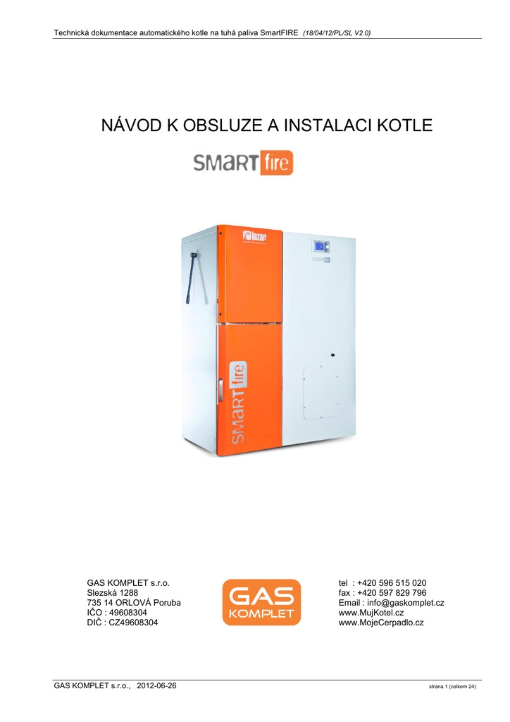 Technická dokumentace automatického kotle na tuhá paliva SmartFIRE (18/04/12/PL/SL V2.0) NÁVOD K OBSLUZE A INSTALACI KOTLE GAS KOMPLET s.r.o. Slezská 1288 735 14 ORLOVÁ Poruba IČO : 49608304 DIČ : CZ49608304 GAS KOMPLET s.r.o., 2012-06-26 tel : +420 596 515 020 fax : +420 597 829 796 Email : [email protected] www.MujKotel.cz www.MojeCerpadlo.cz strana 1 (celkem 24) Technická dokumentace automatického kotle na tuhá paliva SmartFIRE (18/04/12/PL/SL V2.0) 1 1.1 2 2.1 2.2 2.3 2.4 3 3.1 3.2 3.3 3.4 3.5 3.6 3.7 3.8 3.9 3.10 4 4.1 4.2 4.3 4.4 4.5 4.6 5 5.1 5.2 5.2.1 5.2.2 5.2.3 5.2.4 5.2.5 5.3 5.4 5.5 6 6.1 6.1.1 6.1.2 6.1.3 6.1.4 6.1.5 6.1.6 6.1.7 6.1.8 6.2 6.3 6.4 6.5 7 7.1 7.2 7.3 7.4 7.5 7.5.1 7.5.2 7.5.3 7.6 7.7 7.8 7.9 8 8.1 8.1.1 8.2 9 10 11 Úvod ............................................................................................................................................................................ 3 Rozsah dodávky .......................................................................................................................................................... 3 Technické parametry a rozměry ................................................................................................................................ 4 Technické parametry ................................................................................................................................................... 4 Kvalita paliva (mezní hodnoty) .................................................................................................................................... 4 Rozměry kotle ............................................................................................................................................................. 5 Pohledy na kotel .......................................................................................................................................................... 6 Konstrukce kotle, popis funkce ................................................................................................................................ 7 Obecný popis .............................................................................................................................................................. 7 Spalovací komora ........................................................................................................................................................ 7 Výměník kotle .............................................................................................................................................................. 7 Čištění výměníku kotle ................................................................................................................................................ 7 Podavač paliva ............................................................................................................................................................ 7 Přívod spalovacího vzduchu........................................................................................................................................ 7 Hořák ........................................................................................................................................................................... 7 El. horkovzdušné zapalování....................................................................................................................................... 7 opláštění kotle ............................................................................................................................................................. 7 Řez kotlem .................................................................................................................................................................. 8 Zabezpečovací prvky ................................................................................................................................................. 8 Havarijní termostat ...................................................................................................................................................... 8 Střižný šroubek............................................................................................................................................................ 8 Koncový spínač krytu dvířek........................................................................................................................................ 8 Turniket proti prohoření paliva ..................................................................................................................................... 8 Termistor (ochrana motoru podavače paliva) .............................................................................................................. 8 Objemové čidlo a schéma jeho zapojení ..................................................................................................................... 9 Instrukce pro instalaci.............................................................................................................................................. 11 Související normy ...................................................................................................................................................... 11 Umístění kotle vzhledem k požárním předpisům ....................................................................................................... 11 Umístění na podlaze z nehořlavého materiálu .......................................................................................................... 11 Bezpečná vzdálenost od hořlavých hmot. ................................................................................................................. 11 Umístění vzhledem k manipulačnímu prostoru................................................................