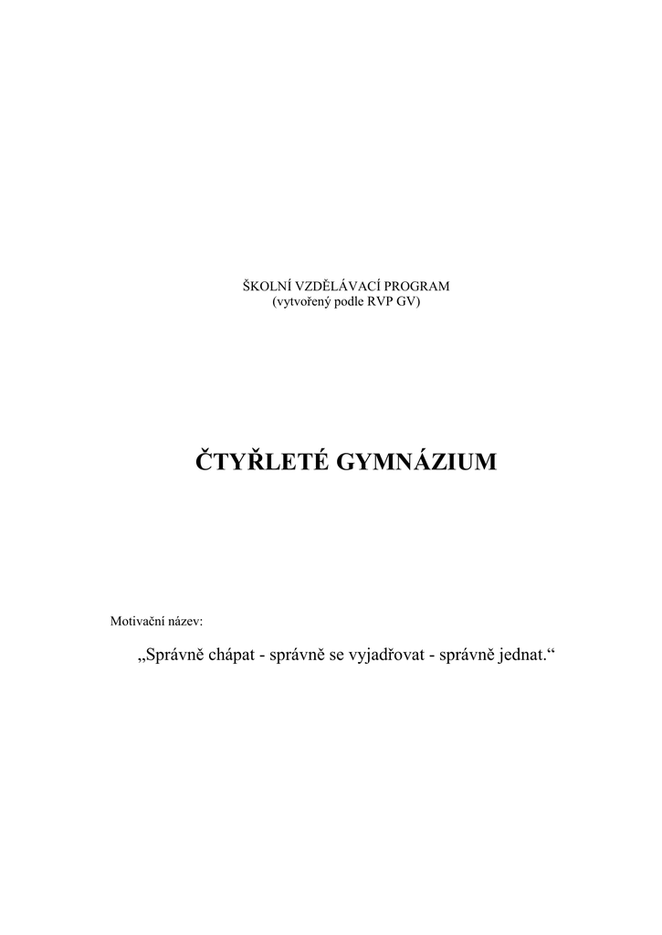 ŠKOLNÍ VZDĚLÁVACÍ PROGRAM (vytvořený podle RVP GV) ČTYŘLETÉ GYMNÁZIUM Motivační název: „Správně chápat - správně se vyjadřovat - správně jednat.“ 1. Identifikační údaje Předkladatel: Název školy: Forma vzdělání: REDIZO IČ Adresa školy: Ředitel školy: Gymnázium, Praha 4, Postupická 3150 denní 600005089 604 59 085 Postupická 3150, Praha 4 Mgr. Josef Tomek Hlavní koordinátor: RNDr. Ilona Šimková Kontakty: Telefon: e-mail: www: 246 007 400 [email protected] www.postupicka.cz Zřizovatel Název: IČ: Magistrát hlavního města Prahy 000 64 581 Adresa: Mariánské náměstí 2, Praha 1, 110 00 Telefon: Fax: 236 002 042 236 007 084 www: www.magistrat.praha-mesto.cz Platnost dokumentu od 1. 9. 2009 Podpis ředitele: Razítko školy: Stránka | 2 Obsah 1. Identifikační údaje ................................................................................................... 2 2. Charakteristika školy ............................................................................................... 6 3. 4. 2.1. Charakteristika školy, její velikost a umístění .................................................. 6 2.2. Vybavení školy ................................................................................................. 6 2.3. Charakteristika pedagogického sboru ............................................................... 6 2.4. Charakteristika žáků ......................................................................................... 7 2.5. Dlouhodobé projekty a mezinárodní spolupráce .............................................. 7 2.6. Spolupráce s rodiči a jinými subjekty............................................................... 8 Charakteristika ŠVP ................................................................................................. 9 3.1. Zaměření školy ................................................................................................. 9 3.2. Cíle vzdělávání ................................................................................................. 9 3.3. Profil absolventa ............................................................................................. 11 3.4. Organizace přijímacího řízení ........................................................................ 12 3.5. Organizace maturitní zkoušky ........................................................................ 12 3.6. Zabezpečení výuky žáků se specifickými vzdělávacími potřebami ............... 13 3.7. Zabezpečení výuky žáků mimořádně nadaných ............................................. 13 3.8. Začlenění průřezových témat.......................................................................... 14 Učební plány .......................................................................................................... 28 4.1. 5. Čtyřleté vzdělávání ......................................................................................... 28 Učební osnovy ....................................................................................................... 30 5.1. Jazyk a jazyková komunikace ........................................................................ 30 5.1.1. Český jazyk a literatura ............................................................................... 32 5.1.2. Cizí jazyk .................................................................................................... 42 5.1.3. Další cizí jazyk ............................................................................................ 65 5.2. 5.2.1. Matematika a její aplikace ............................................................................ 103 Matematika ............................................................................................... 104 5.3. Informační a komunikační technologie ........................................................ 115 5.4. Člověk a společnost ...................................................................................... 127 5.4.1. Dějepis ...................................................................................................... 128 5.4.2. Základy společenských věd ...................................................................... 137 5.5. Člověk a příroda ........................................................................................... 161 5.5.1. Fyzika ........................................................................................................ 163 5.5.2. Chemie ...................................................................................................... 170 5.5.3. Biologie ..................................................................................................... 179 5.5.4. Zeměpis ..................................................................................................... 189 5.6. Umění a kultura ............................................................................................ 200 Stránka | 3 5.6.1. Hudební výchova ...................................................................................... 202 5.6.2. Výtvarná výchova ..................................................................................... 215 5.7. 5.7.1. 5.8. Člověk a zdraví ............................................................................................. 240 Tělesná výchova ........................................................................................ 241 Semináře pro 3. ročník.................................................................................. 254 5.8.1. Konverzace v CJ – anglický jazyk ............................................................ 254 5.8.2. Konverzace v CJ – německý jazyk ........................................................... 258 5.8.3. Konverzace v CJ – španělský jazyk .......................................................... 262 5.8.4. Konverzace v CJ