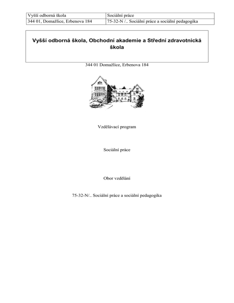 Vyšší odborná škola 344 01, Domažlice, Erbenova 184 Sociální práce 75-32-N /.. Sociální práce a sociální pedagogika Vyšší odborná škola, Obchodní akademie a Střední zdravotnická škola 344 01 Domažlice, Erbenova 184 Vzdělávací program Sociální práce Obor vzdělání 75-32-N/.. Sociální práce a sociální pedagogika Vyšší odborná škola 344 01, Domažlice, Erbenova 184 Sociální práce 75-32-N/.. Sociální práce a sociální pedagogika Identifikační údaje vyšší odborné školy Název školy: Vyšší odborná škola, Obchodní akademie a Střední zdravotnická škola Domažlice, Erbenova 184 344 01 Domažlice, Erbenova 184 Plzeňský kraj Příspěvková organizace Adresa školy: Zřizovatel školy: Typ právnické osoby: Kód a název oboru vzdělání: Název vzdělávacího programu: Zaměření vzdělávacího programu: Podmínky zdravotní způsobilosti uchazeče ke vzdělávání Formy vzdělávání denní kombinovaná Vyučovací jazyk: Dosažený stupeň vzdělání Způsob ukončování vzdělávání Doklad o dosaženém vzdělání Označení absolventa VOŠ 75-32-N/..Sociální práce a sociální pedagogika Sociální práce Podmínky zdravotní způsobilosti nesplňují uchazeči se závažnými duševními chorobami a poruchami chování (v souladu s nařízením vlády č. 211/2010 Sb.) Délka vzdělávacího programu 3 ročníky (6 období) 3,5 ročníku (7 období) Český jazyk Vyšší odborné Absolutorium Vysvědčení o absolutoriu, diplom absolventa VOŠ Diplomovaný specialista DiS. Vyšší odborná škola 344 01, Domažlice, Erbenova 184 Sociální práce 75-32-N/.. Sociální práce a sociální pedagogika Obsah 1 2 3 3.1 4 4.1 4.2 4.3 5 6 7 7.1 7.2 8 8.1 8.2 8.3 8.4 8.5 8.6 8.7 8.8 8.9 8.10 8.11 8.12 8.13 8.14 8.15 8.16 8.17 8.18 8.19 8.20 8.21 8.22 8.23 8.24 Profil absolventa ..................................................................................................................... 5 Kompetence a uplatnění absolventa ....................................................................................... 8 Charakteristika vzdělávacího programu ............................................................................... 10 Pojetí a cíle vzdělávacího programu ..................................................................................... 10 Organizace výuky ................................................................................................................. 16 Denní forma vzdělávání ........................................................................................................ 16 Kombinovaná forma vzdělávání ........................................................................................... 17 Organizace praxe .................................................................................................................. 18 Podmínky pro přijímání uchazečů ........................................................................................ 20 Podmínky ukončování vzdělávacího programu .................................................................... 21 Učební plán ........................................................................................................................... 22 Denní forma vzdělávání ........................................................................................................ 22 Kombinovaná forma vzdělávání ........................................................................................... 25 Sylaby vyučovacích předmětů .............................................................................................. 29 Jazykové vzdělávání ............................................................................................................. 29 Filosofie a etika ..................................................................................................................... 33 Kultura osobního projevu ..................................................................................................... 37 Statistika a demografie .......................................................................................................... 39 Základy ekonomiky .............................................................................................................. 42 Aplikovaná výpočetní technika ............................................................................................ 44 Základy korespondence ........................................................................................................ 47 Teorie a metody sociální práce ............................................................................................. 50 Sociální politika .................................................................................................................... 55 Právo ..................................................................................................................................... 56 Psychologie ........................................................................................................................... 58 Sociologie ............................................................................................................................. 65 Základy pedagogiky .............................................................................................................. 68 Pedagogika volného času ...................................................................................................... 71 Zdravotní nauky .................................................................................................................... 74 Sociální patologie ................................................................................................................. 78 Psychosociální výcvik ...............................................................................................