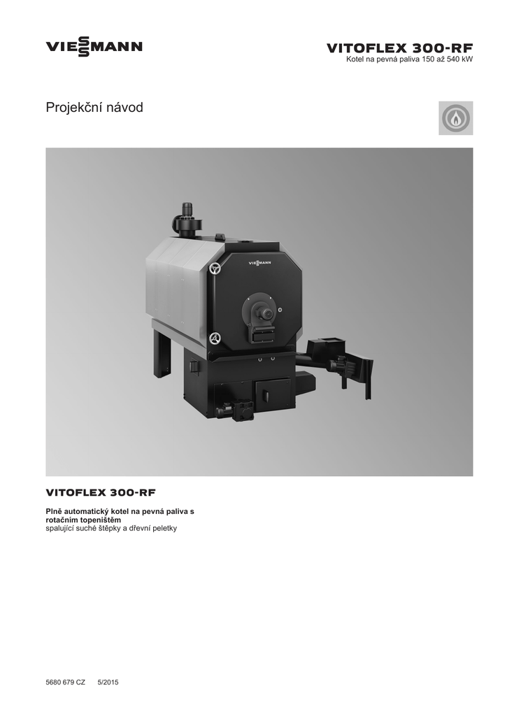 Viesmann Projekční návod VITOFLEX 300-RF Plně automatický kotel na pevná paliva s rotačním topeništěm spalující suché štěpky a dřevní peletky 5680 679 CZ 5/2015 VITOFLEX 300-RF Kotel na pevná paliva 150 až 540 kW Obsah Obsah Základy spalování dřeva 1. 1 Základy spalování dřeva pro výrobu tepla ................................................................ ■ Všeobecné základy ............................................................................................... ■ Stanovení potřeby paliva ...................................................................................... ■ Koncentrace energie různých nositelů energie ve srovnání s topným olejem (směrné hodnoty) .................................................................................................. 1. 2 Základy spalování dřevních peletek ......................................................................... ■ Co jsou dřevní peletky? ........................................................................................ ■ Požadavky na palivo ............................................................................................. ■ Druhy k dodání ...................................................................................................... 1. 3 Základy spalování dřevních štěpek pro výrobu tepla ................................................ ■ Co jsou štěpky? .................................................................................................... ■ Definice tříd velikosti štěpky podle ČSN EN ISO 17225-4 .................................... ■ Požadavky na palivo ............................................................................................. 1. 4 Minimální požadavky na palivo ................................................................................. ■ Obsažené látky ..................................................................................................... ■ Nedřevěná paliva z biomasy ................................................................................. 1. 5 Spolková vyhláška na ochranu proti imisím (1. BImSchV) ....................................... ■ Obsah vyhlášky 1. BImSchV ................................................................................. ■ Novelizace 1. BImSchV - zpřísnění emisních mezních hodnot ............................ ■ Emisní mezní hodnoty prachu a oxidu uhelnatého (CO) podle 1. BImSchV stupeň 2 (§ 5) ............................................................................................................ 6 6 7 10 8 8 8 8 9 9 9 9 9 10 10 10 10 10 10 2. Vitoflex 300-RF 2. 1 Popis výrobku ........................................................................................................... ■ Stručný přehled výhod .......................................................................................... ■ Stav při dodání ...................................................................................................... 2. 2 Technické údaje ........................................................................................................ ■ Technické údaje .................................................................................................... 12 12 12 13 13 3. Regulace 3. 1 Technické údaje Ecocontrol ...................................................................................... ■ Obj. č. viz ceník ..................................................................................................... ■ Funkce: ................................................................................................................. ■ Součást dodávky ................................................................................................... 3. 2 Příslušenství Ecocontrol ........................................................................................... ■ Ovládání dodatečného zdroje tepla (zdroj tepla špičkového zatížení) .................. ■ Ovládání externího pohonu bez světelné závory .................................................. ■ Ovládání externího pohonu světelnou závorou .................................................... 3. 3 Příslušenství Ecocontrol, management výkonu ........................................................ ■ Management zásobníku, 5 čidel ........................................................................... ■ Externí nárokování zap/vyp .................................................................................. ■ Provozní hlášení, beznapěťové ............................................................................ ■ Signál výkonu 0 - 10 V .......................................................................................... 3. 4 Příslušenství Ecocontrol dálkový přenos / dálkové monitorování ............................. ■ Hlásiče poruchy, analogové, s akumulátorovou stanicí ........................................ ■ Export provozních dat přes Modbus TCP/IP ......................................................... ■ Vizualizace Vitoflex 300 externí (propojeno kabelem) .......................................... 3. 5 Mastercontrol pro zařízení se dvěma kotli ................................................................ ■ Obj. č. viz ceník ..................................................................................................... ■ Funkce .................................................................................................................. ■ Součást dodávky ................................................................................................... ■ Vizualizace s dotykovou obrazovkou .................................................................... 3. 6 Příslušenství Mastercontrol ...................................................................
