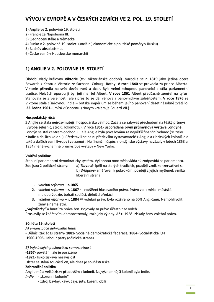 VÝVOJ V EVROPĚ A V ČESKÝCH ZEMÍCH VE 2. POL. 19. STOLETÍ 1) Anglie ve 2. polovině 19. století 2) Francie za Napoleona III. 3) Sjednocení Itálie a Německa 4) Rusko v 2. polovině 19. století (sociální, ekonomické a politické poměry v Rusku) 5) Bachův absolutismus 6) České země v Habsburské monarchii 1) ANGLIE V 2. POLOVINE 19. STOLETÍ Období vlády královny Viktorie (tzv. viktoriánské období). Narodila se r. 1819 jako jediná dcera Edwarda z Kentu a Victorie ze Sachsen- Coburg- Rothy. V roce 1840 se provdala za prince Alberta. Viktorie přivedla na svět devět synů a dcer. Byla velmi schopnou panovnicí a ctila parlamentní tradice. Největší oporou jí byl její manžel Albert. V roce 1861 Albert předčasně zemřel na tyfus. Stahovala se z veřejnosti, ale i přes to se dál věnovala panovnickým záležitostem. V roce 1876 se Viktorie stala císařovnou Indie – britské impérium se během jejího panování desetinásobně zvětšilo. 22. ledna 1901- umírá v Osbornu. (Novým králem je Eduard VII.) Hospodářský růst: Z Anglie se stala nejrozvinutější hospodářská velmoc. Začala se zabývat přechodem na těžký průmysl (výroba železnic, strojů, lokomotiv). V roce 1851- uspořádána první průmyslová výstava Londýně. Londýn se stal centrem obchodu. Celá Anglie byla považována za největší finanční velmoc ( zisky z Indie a dalších kolonií). Představili se na ní především vystavovatelé z Anglie a z britských kolonií, ale také z dalších zemí Evropy i ze zámoří. Na finanční úspěch londýnské výstavy navázaly v letech 1853 a 1854 méně významné průmyslové výstavy v New Yorku. Vnitřní politika: Stabilní parlamentní demokratický systém. Výkonnou moc měla vláda zodpovídá se parlamentu. Zde jsou 2 politické strany: a) Toryové- lpěli na starých tradicích, později vznik konzervativní s. b) Whigové- směřovali k pokrokům, později z jejich myšlenek vzniká liberální strana. 1. volební reforma – r.1865 2. volební reforma – r. 1867 rozšíření hlasovacího práva. Právo volit měla i městská maloburžoazie, bohatí sedláci, dělničtí předáci. 3. volební reforma – r. 1884 volební právo bylo rozšířeno na 60% Angličanů. Nemohli volit ženy a nemajetní. „Sufražetky“ = hnutí za práva žen. Bojovaly za právo účastnit se voleb. Proslavily se žhářstvím, demonstrovaly, rozbíjely výlohy. Až r. 1928- získaly ženy volební právo. 80. léta 19. století A) emancipace dělnického hnutí - Dělníci zakládají strany- 1881- Sociálně demokratická federace, 1884- Socialistická liga 1900-1906- Labour party (dělnická strana) B) boje irských poslanců za samostatnost -1867- povstání, ale je poraženo -1921- Irsko získává nezávislost Ulster se stává součástí VB, ale dnes je součástí Irska. Zahraniční politika Anglie měla velké zisky především z kolonií. Nejvýznamnější kolonií byla Indie. Indie - „korunní kolonie“ - zdroj bavlny, kávy, čaje, juty, koření, obilí 1 - byla hlavním odbytištěm anglického zboží - důležitý strategický bod. - Britové odtud expandovali do Barmy, Malajska, Afganistanu. Britové pronikali i do Číny. Zde se 1840-1860 uskutečnily tři Opiové války. Západní obchodníci ale nebyli spokojeni s obchodními podmínkami, a tak k císařskému dvoru byly vysílány diplomatické mise s požadavky otevření několika přístavů a dalších výhod. Čínský císař však mise odmítal. Opiové války, které donutily Čínu přijmout velmi nevýhodné podmínky: -otevření všech čínských přístavů západním obchodníkům -postoupení Hongkongu Británii -povinný nákup obrovského množství indického opia. Územní zisky Anglie: 1867- získali Kanadu 1875- zisk Suezského průplavu 1882- získali pod svou nadvládu Egypt 1888- Súdán 1901- získali Austrálii 1907- Nový Zéland 1910- Jihoafrickou unii Všechna získaná území měla statut dominií původnímu obyvatelstvu byl přiznán určitý podíl na správě, ale většinou tato území řídili Britové. 1899- 1902 –Búrské války Anglie X původním nizozemským kolonistům (Bůrové) na jihu Afriky. Britové měli za cíl vytvořit kolonie od severu až k jihu , narazili na odpor Francouzů střetli se u Fašody - začali vyjednávat, dohodli se na spolupráci proti Německu. 2) FRANCIE ZA NAPOLEONA III. r. 1848- ve Francii je revoluce prezidentem –Ludvík Napoleon. 1851- provedl Ludvík převrat a ustanovil se na dalších deset let prezidentem. 1852- se ustanovil císařem a své jméno změnil na Napoleon III. Takto vládne až do roku 1870. 1852- 1870- období císařství. Za vlády Napoleona III. Došlo k obrovskému růstu v hospodářství. Zavedl veřejné práce pro nezaměstnané. Za jeho vlády dochází k přestavbě Paříže. Vznikla celá řada nových bulvárů. Francie se stává kulturním a módním centrem Evropy. 1860: dochází k úpadku hospodářského vzestupu. Levné výrobky z Anglie se dostávají do Francie hospodářské potíže. Této situace využívají: republikáni, monarchisté. Zahraniční politika: Byla výbojná i koloniální (nejvíce kolonizovali Středozemí). Zahraniční politika byla zaměřena proti Rusku. 1853: tzv. Krymská válka- VB+FR = porazili Rusko 1861- podnikl Napoleon výpravu do Mexika, chtěl získat Mexiko jako koloniální říši. Nakonec ale museli Mexiko opustit (1867). 1864- byl otevřen Suezský průplav Prusko francouzská válka byla dalším neúspěchem Napoleona 4. 9. 1870- Končí císařství a nastává 3. republika. Včele prozatímní vlády stojí republikánské vláda. Tato vláda podepisuje příměří s Pruskem. 10. 5. 1871- Frankfurtský mír- Francie ztrácí Alsasko, části Lotrinska. Byly to nejbohatší části Francie. 2 PO ROCE 1870- dochází k hospodářské krizi Francie musela platit válečné náhrady (