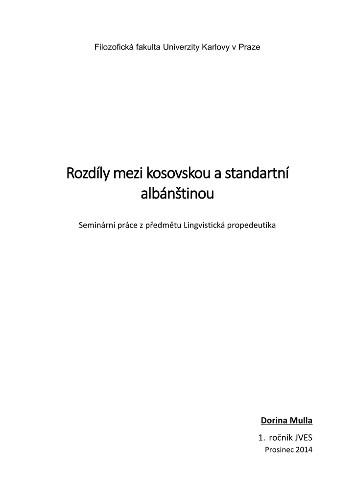 Filozofická fakulta Univerzity Karlovy v Praze Rozdíly mezi kosovskou a standartní albánštinou Seminární práce z předmětu Lingvistická propedeutika Dorina Mulla 1. ročník JVES Prosinec 2014 Obsah ÚVOD ....................................................................................................................................................... 3 1 2 Albánština ....................................................................................................................................... 4 1.1 Původ ....................................................................................................................................... 5 1.2 Dialekty .................................................................................................................................... 6 1.3 Standardizace .......................................................................................................................... 8 1.4 Výpůjčky .................................................................................................................................. 8 Kosovská vs. Standartní albánština................................................................................................ 9 ZÁVĚR .................................................................................................................................................... 11 2 ÚVOD Cílem této práce je uvést četné rozdíly mezi kosovskou a standartní albánštinou. Na začátku mé práce se budu zabývat albánským jazykem, původem Albánců, kde uvedu dvě hlavní teorie. Neopomenu ani albánské dialekty a jejich charakteristiku a také slovní zásobu. Na závěr jsem vytvořila dvě tabulky, kde jsou rozdíly mezi kosovskou a standartní albánštinu vidět velmi zřetelně. Vybrala jsem si toto téma, protože mi je velmi blízké, sama hovořím kosovskou albánštinou. Nejvíce jsem čerpala z knihy Dialektologjia (Gjinari, 2003) a také z knihy Albánština: lingvistický pohled (Gramelová, 2014). 3 1 Albánština Albánský jazyk neboli Gjuha shqipe je jazyk, kterým hovoří 5 414 3001 lidí na světě. Řadí se mezi indoevropské jazyky, v nichž tvoří samostatnou větev. Hlavními oblastmi jsou Albánie (cca 3,5 mil. obyvatel) a Kosovo (cca 2 mil. obyvatel). Pak tu jsou samozřejmě velmi staré albánské menšiny žijící v Srbsku, Černé hoře, Makedonii, Řecku a v jižní Itálii. Dnešní ekonomická situace, jak v Albánii tak i v Kosovu, zavedla Albánce i do Spojených států amerických, Velké Británii, Německa, Švýcarska, Rakouska, Norska, Švédska a samozřejmě i do České republiky atd. Oficiálním jazykem Albánie je albánština od roku 1912, kdy Albánie získala nezávislost a u Kosova až od roku 2008. Název, pod kterým jsou Albánci na světě známí – čes. Albánec, řec. Αλβανός, lat. Albanus, angl. Albanian, něm. Albaner, fran. Albanais, turec. Arnavutlar apod. – pochází z názvu ilyrského kmene Albanů, kteří sídlily na území dnešní Albánie. Byzantští Řekové používali pro Albánii označení Arvanon, z něhož pochází i varianta albánského etnonyma Arvanitas (řec. Αρβανίτης) označující autochtonní albánskou menšinu v Řecku. Turci tuto variantu zkomolili na Arna(v)ut ()دوان را, přičemž pro Albánii používali slovo Arna(v)utluk. Samotní Albánci ještě na začátku minulého století vnímali toto slovo jako velmi urážlivé, zatímco dnes je neutrální, bez negativních konotací. V jižních částech albánského jazykového prostoru proběhla ještě rotacizace souhlásky n, a tak vznikla varianta arbër. Ve středověku nazývali Albánci svou zemi Arbën/Arbër nebo Arbëni/Arbëri. Rozšířením původního Arbër o sufix vyjadřující geografickou příslušnost vznikla varianta arbëresh, která se dodnes zachovala u albánské menšiny v jižní Itálii, zatímco nerotacizovanou variantou arbënesh se označuje albánská komunita v okolí chorvatského Zadaru (Surovčák, 2013, s. 38). Později však, asi v 17. století, bylo toto slovo u Albánců nahrazeno výrazem shqip, což v doslovném překladu znamená –„ srozumitelný“, „správně“ – a od něho jsou pak odvozeny výrazy jako Shqipëtar („Albánec“), Shqipëria („Albánie“), Gjuha Shqipe („Albánský jazyk“). S tímto výrazem se samozřejmě můžeme setkat i v jiných jazycích jako například v srbštině – šiptar – Srbové takto označovali kosovské Albánce a je tedy tento výraz chápán jako urážka. Chci se tu zmínit i o albánské menšině žijící v Itálii. Nazývají se Arbrešové (alb. Arbëresh), zachovali si tedy starší etnonymum. Do Itálie uprchli v 15. st. před tureckou invazí a dodnes žijí v jižní Itálii, konkrétně v Apulii, v Basilicatě, v Kalábrii a na Sicílii. Arbrešové jsou na svůj původ velmi hrdí, zakládají si na dodržování tradic ale hlavně na zachování svého jazyka, na jeho čistotě. Jejich jazyk pochází z toskského2 dialektu a standartní albánštině není moc podobný, zachoval si totiž řadu archaismů a má mnoho italských výpůjček, což je jasné. Jejich dnešní počet se odhaduje na 100 tisíc obyvatel3. Na webových stránkách Roberta Elsieho4, známého albanisty, jsou nahrávky albánských mluvčích z různých míst s různými dialekty. Jsou tam i nahrávky Arbrešů. Je obecně známo, že Albánci jsou na svůj jazyk velmi hrdí. Vyplývá to už z názvu Gjuha shqipe, což v doslovném překladu znamená – „srozumitelný jazyk“ – a shqipëtar je tedy „ten 1 http://www.ethnologue.com/language/sqi Albánština má dva základní dialekty – gegský (gegë) a toskský (toskë). V češtině nejsou tyto výrazy zcela ustáleny. Odkazuju se tedy na významného českého albanistu Pavla Hradečného, který tyto dva dialekty v češtině používá s pří