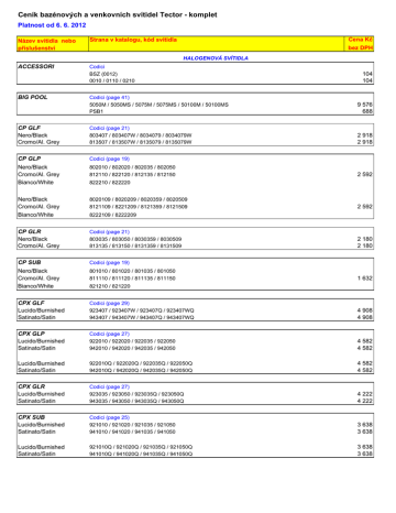 Ceník bazénových a venkovních svítidel Tector - komplet Platnost od 6. 6. 2012 Název svítidla nebo příslušenství Cena Kč Strana v katalogu, kód svítidla bez DPH HALOGENOVÁ SVÍTIDLA ACCESSORI BIG POOL Codici BSZ (0012) 0010 / 0110 / 0210 104 104 Codici (page 41) 5050M / 5050MS / 5075M / 5075MS / 50100M / 50100MS PSB1 9 576 688 CP GLF Nero/Black Cromo/Al. Grey Codici (page 21) 803407 / 803407W / 8034079 / 8034079W 813507 / 813507W / 8135079 / 8135079W 2 918 2 918 CP GLP Codici (page 19) Nero/Black Cromo/Al. Grey Bianco/White 802010 / 802020 / 802035 / 802050 812110 / 822120 / 812135 / 812150 Nero/Black Cromo/Al. Grey Bianco/White 8020109 / 8020209 / 8020359 / 8020509 8121109 / 8221209 / 8121359 / 8121509 CP GLR Nero/Black Cromo/Al. Grey Codici (page 21) 803035 / 803050 / 8030359 / 8030509 813135 / 813150 / 8131359 / 8131509 CP SUB Codici (page 19) Nero/Black Cromo/Al. Grey Bianco/White 801010 / 801020 / 801035 / 801050 811110 / 811120 / 811135 / 811150 CPX GLF Lucido/Burnished Satinato/Satin Codici (page 29) 923407 / 923407W / 923407Q / 923407WQ 943407 / 943407W / 943407Q / 943407WQ 4 908 4 908 CPX GLP Lucido/Burnished Satinato/Satin Codici (page 27) 922010 / 922020 / 922035 / 922050 942010 / 942020 / 942035 / 942050 4 582 4 582 Lucido/Burnished Satinato/Satin 922010Q / 922020Q / 922035Q / 922050Q 942010Q / 942020Q / 942035Q / 942050Q 4 582 4 582 CPX GLR Lucido/Burnished Satinato/Satin Codici (page 27) 923035 / 923050 / 923035Q / 923050Q 943035 / 943050 / 943035Q / 943050Q 4 222 4 222 CPX SUB Lucido/Burnished Satinato/Satin Codici (page 25) 921010 / 921020 / 921035 / 921050 941010 / 941020 / 941035 / 941050 3 638 3 638 Lucido/Burnished Satinato/Satin 921010Q / 921020Q / 921035Q / 921050Q 941010Q / 941020Q / 941035Q / 941050Q 3 638 3 638 2 592 822210 / 822220 2 592 8222109 / 8222209 2 180 2 180 1 632 821210 / 821220 FLAME Codici (page 9) 1010G / 1020G / 1035G / 1050G 6 796 Codici (page 31) 15 / 16 1520 / 1620 550 1 202 GLF Nero/Black Cromo/Al. Grey Codici (page 17) 3407 / 3407W / 34079 / 34079W 3507 / 3507W / 35079 / 35079W 2 146 2 146 GLP Codici (page 13) Nero/Black Cromo/Al. Grey Bianco/White 2010 / 2020 / 2035 / 2050 / 20109 / 20209 / 20359 / 20509 2110 / 2120 / 2135 / 2150 / 21109 / 21209 / 21359 / 21509 GLR Nero/Black Cromo/Al. Grey Codici (page 15) 3035 / 3050 / 30359 / 30509 3135 / 3150 / 31359 / 31509 KFLAME 1 spot 2 spot 3 spot 4 spot 5 spot 6 spot Codici (page 11) 10501G / 105019G 10502G* / 105029G* 10503G* / 105039G* 10504G* / 105049G* 10505G* / 105059G* 10506G* / 105069G* KSUB 1 spot 2 spot 3 spot 4 spot 5 spot 6 spot Codici (page 7) 10501 / 11501 / 105019 / 115019 10502* / 11502* / 105029* / 115029* 10503* / 11503* / 105039* / 115039* 10504* / 11504* / 105049* / 115049* 10505* / 11505* / 105059* / 115059* 10506* / 11506* / 105069* / 115069* 2 044 3 708 5 028 6 470 7 706 8 872 OBLO' GLF Codici (page 23) 803407/2 - 803407W/2 - 813507/2 - 813507W/2 863407/2 - 863407W/2 - 873407/2 - 873407W/2 3 244 3 244 Codici (page 23) 802010/2 - 802020/2 - 812110/2 - 812120/2 862010/2 - 862020/2 - 872010/2 - 872020/2 2 918 2 918 Codici (page 23) 801010/2 - 801020/2 - 811110/2 - 811120/2 861010/2 - 861020/2 - 871010/2 - 871020/2 2 008 2 008 Codici (page 43) 9250 / 9350 9265 / 9365 1 528 1 528 Codici (page 35) 4050 / 4150 40501 / 41501 4075 / 4175 40751 / 41751 40100 / 41100 40101 / 41101 401008 / 411008 401018 / 411018 3 570 3 742 4 034 4 188 4 034 4 188 4 188 4 326 5075 / 5175 50100 / 51100 501008 / 511008 2 798 2 798 2 952 FLO OBLO' GLP OBLO' SUB POOL PUNTO 1 820 2210 / 2220 / 22109 / 22209 1 426 1 426 7 894 15 444 22 652 30 066 37 066 44 102 PUNTO FLUO RICAMBI CP RICAMBI OBLO' Codici (page 37) 4021 / 4121 / 4021W / 4121W Codici 8010 / 8110 / 8210 8020 / 8120 / 8220 80 / 81 / 82 722 808 328 Codici 8320 / 8420 / 8620 / 8720 310 SUB Codici (page 5) Nero/Black Cromo/Al. Grey Bianco/White 1010 / 1020 / 1035 / 1050 1110 / 1120 / 1135 / 1150 TITANO Codici (page 39) 4050M / 4050MS / 4075M / 4075MS 40100M / 40100MS 4121M / 4121MS / 4121WM / 4121WMS VENTO 5 972 910 1210 / 1220 9 576 10 194 11 636 Codici (page 33) 054 / 056 058 060 / 062 3 262 3 398 5 492 LED SVÍTIDLA ACCESSORI ALITER Codici BOC050F BOC/YDRO POOL CECU (chiave serraggio CLK - cloosing tool CLK) CLK PCA19 PCA19/T 654 808 242 2 918 876 688 Codici (page 181) ALT900/15 – ALT901/15 – ALT905/15 – ALT902/15 – ALT903/15 – ALT920/15 – ALT922/15 ALT900/25 – ALT901/25 – ALT905/25 – ALT902/25 – ALT903/25 – ALT920/25 – ALT922/25 11 326 ALT900/40 – ALT901/40 – ALT905/40 – ALT902/40 – ALT903/40 – ALT920/40 – ALT922/40 ALT1800/15 – ALT1801/15 – ALT1805/15 – ALT1802/15 – ALT1803/15 ALT1820/15 – ALT1822/15 ALT1800/25 – ALT1801/25 – ALT1805/25 – ALT1802/25 – ALT1803/25 14 072 ALT1820/25 – ALT1822/25 ALT1800/40 – ALT1801/40 – ALT1805/40 – ALT1802/40 – ALT1803/40 ALT1820/40 – ALT1822/40 ALITER POOL Codici (page 183) ALTP900/15 – ALTP901/15 – ALTP905/15 – ALTP902/15 – ALTP903/15 ALTP920/15 – ALTP922/15 ALTP900/25 – ALTP901/25 – ALTP905/25 – ALTP902/25 – ALTP903/25 10 640 ALTP920/25 – ALTP922/25 ALTP900/40 – ALTP901/40 – ALTP905/40 – ALTP902/40 – ALTP903/40 ALTP920/40 – ALTP922/40 ALTP1800/15 – ALTP1801/15 – ALTP1805/15 – ALTP1802/15 – ALTP1803/15 ALTP1820/15 – ALTP1822/15 ALTP1800/25 – ALTP1801/25 – ALTP1805/25 – ALTP1802/25 – ALTP1803/25 ALTP1820/25 – ALTP1822/25 ALTP1800/40 – ALTP1801/40 – ALTP1805/40 – ALTP1802/40 – ALTP1803/40 ALTP1820/40 – ALTP1822/40 13 386 APOLLO ARGO ARIES ATLANTICUS Codici (page 97) AP700 – AP701 – AP705 – AP702 – AP703 – AP720 – AP722 6 728 Codici (page 167) AG700 - AG701 – AG705 - AG702 - AG703 - AG720 - AG722 AG600 - AG601 – AG605 - AG602 - AG603 - AG620 - AG622 23 648 23 648 AGS700 - AGS701 – AGS705 - AGS702 - AGS703 - AGS720 - AGS722 AGS600 - AGS601 – AGS605 - AGS602 - AGS603 - AGS620 - AGS622 22 550 22 550 Codici (page 53) AR700 - AR701 – AR705 – AR702 - AR703 - AR