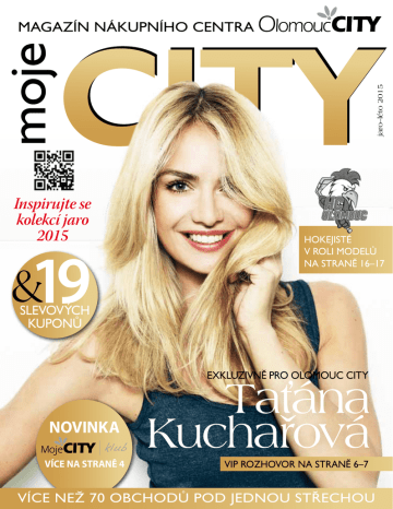 Inspirujte se kolekcí jaro 2015 &19 jaro–léto 2015 moje MAGAZÍN nákupního centra Hokejisté v roli modelů na straně 16–17 slevových ˚ kuponu exkluzivně pro OLOMOUC city NOVINKA VÍCE NA STRANĚ 4 Taťána Kuchařová VIP rozhovor na straně 6–7 VÍCE NEŽ 70 OBCHODŮ POD JEDNOU STŘECHOU moje MULTIKINO www.cinestar.cz AVENGERS: Age of Ultron předpremiéra 29. 4. v rámci Turbovečera Milé čtenářky a čtenáři, přátelé centra, konečně je tu zase jaro. Květiny rozkvétají, ptáci švitoří, děti si hrají venku a my si užíváme sluníčka nad šálkem kávy – co by mohlo být lepšího? Určitě chcete v tomto ročním období vypadat a cítit se skvěle, proto mi dovolte představit vám nabídku našeho obchodního centra pro nadcházející jarní slavnosti. Ukážeme vám, jak můžete v šatech či obleku udělat dobrý dojem a cítit se přitom pohodlně. Najdete zde také nápady na oblečení, které byste si mohli vzít na svůj příští výlet do města. V rubrice VIP rozhovor na stranách 6 a 7 zjistíte, co ráda nosí topmodelka Taťána Kuchařová a jak se dá pomáhat lidem. Nechybí rozhovor s mladými hokejisty Peterem Zuzinem a Radkem Dlouhým, kteří se za Kohouty rvali jako lvi. Jak hodnotí sezonu manažer HC Olomouc Mario Cartelli, se dozvíte na stranách 20 a 21. V rubrice Život v centru zjistíte, že to u nás nemusí být jen o nákupech a že vám v restauracích a kavárnách našeho centra bude báječně chutnat. V Aktualitách vám představujeme novinku Moje City klub, plnou výhod, slev a soutěží. Máte už i vy svou kartu plnou výhod? Pokud ne, čtěte více na straně 4! Zveme vás na unikátní výstavu Balónkový jarní svět! V termínu od 1. do 12. dubna si tuto podívanou rozhodně nenechte ujít! O velikonočních svátcích vás v našem centru čekají skvělé Velikonoce se zajíčkem. Sledujte naše webové stránky, kde vás informujeme o chystaných výstavách a dalších akcích. Na fashion blogu jsou stále nové aktuality a jsme s vámi i na Facebooku. Přejeme vám pěkné chvilky u nového vydání magazínu Moje City. Margareta Šulcová Marketing Coordinator Olomouc CITY Premiéra 2. 4. Premiéra 30. 4. 6-7 s naší klubovou kartou nákupy v OC Olomouc City ROZHOVOR s Taťánou Kuchařovou 16–17 20–21 ROZHOVORY s hokejisty HC Olomouc Obsah: www.mojecity.cz UVÁDÍ OC Olomouc City, Pražská ul. 255/41 4 výhodné nákupy Úvodní slovo . . . . . . . . . . . . . . . . . . 3 Karta Moje city klub . . . . . . . . . . . . 4 Aktuality. . . . . . . . . . . . . . . . . . . . 5 Rozhovor s Taťánou Kuchařovou. . . .6–7 Dětský svět Amazonie . . . . . . . . . . 8–9 Pro ženy. . . . . . . . . . . . . . . . . . . .10 Jarní trendy. . . . . . . . . . . . . . . 11–13 Slevové kupony. . . . . . . . . . . . . 14–15 Nákupy v OC Olomouc City . . . . 16–17 Kavárny a restaurace . . . . . . . . . . . . 18 Den v OC Olomouc City . . . . . . . . . 19 Rozhovor s Radkem Dlouhým . . . . . . 20 Rozhovor s Peterem Zuzinem. . . . . . .21 Sport a volný čas. . . . . . . . . . . . 22–23 Design a bydlení. . . . . . . . . . . . 24–25 Pro děti. . . . . . . . . . . . . . . . . . . . 26 Mapa centra . . . . . . . . . . . . . . . . . 27 Moje CITY, časopis nákupního centra Olomouc City. Vydává: Čistá Jižní Morava a.s., Rozkošného 1058/3, 150 00 Praha 5 – Smíchov, IČ: 24188166. Evidenční číslo: MK ČR E 21067. Vychází dvakrát do roka. Toto číslo vyšlo 1. 4. 2015. Vedoucí projektu: Margareta Šulcová, kontakt: [email protected], web: www.mojecity.cz. Grafické, redakční a foto práce: m-ARK Marketing a reklama, s.r.o. Přetiskování redakčních a foto materiálů bez souhlasu vydavatele není dovoleno. Modely do časopisu zajistila modelingová agentura STYL Olomouc, kadeřnictví VERA ICON upravilo účesy. Samostatně neprodejné. Změna cen produktů vyhrazena. Vydavatel neodpovídá za obsah inzerce. www.facebook.com/OlomoucCITY Olomouc City | Aktuality Nový klub Akce centra OC Olomouc CITY BALÓNKOVÝ JARNÍ SVĚT Od 1. do 12. dubna vás OC Olomouc City zve na ojedinělou výstavu ze světa balónků, která ve vás určitě probudí touhu sestrojit si vlastního balónkového kamaráda. Můžete vidět letadýlka, zvířátka, rostliny, stromy, velikonoční vajíčko a mnohé další exponáty. Přijďte co nejdříve, ve chvíli kdy se odpoutají, odletí vzhůru za jarním sluníčkem. Obchodní centrum Olomouc CITY pro vás připravilo věrnostní program MOJE CITY KLUB, prostřednictvím kterého přinášíme skvělé nákupy, zábavu a zážitky. A protože si ceníme, že u nás nakupujete, máme pro vás také připraveno mnoho slev a soutěží. Stačí se přihlásit přes registrační formulář na webových stránkách klubu www.mojecityklub.cz nebo u hostesek v obchodním centru a vaše očekávání se mohou začít plnit. 1 Naše prodejny a externí partneři připravují pro členy klubu neustále nové slevy, speciální nabídky a benefity. V našem klubu nakoupíte nejvýhodněji na různých místech jen s jednou kartou v peněžence. Je důležité se při nákupech i bavit – proto budeme soutěžit i o spoustu zajímavých cen. Přehled najdete na klubových stránkách www.mojecityklub.cz „Být členem našeho klubu může být úplně každý. Členství v klubu je pro všechny zdarma, tak proč to nezkusit,“ říká Margareta Šulcová, marketingová manažerka obchodního centra Olomouc CITY. SoutĚž o spoustu lákavých cen Soutěže se může zúčastnit každý člen klubu, který v období trvání soutěže nakoupí v kterékoli provozovně centra za nejméně 200 Kč, správně nahraje svou účtenku na webu klubu www.mojecityklub.cz a zodpoví zadanou soutěžní otázku: Kolik bonbónů Moje City klub se nachází v plexi kostce umístěné v centrální části obchodního centra Olomouc city? Soutěž trvá od 14. 2. do 30.