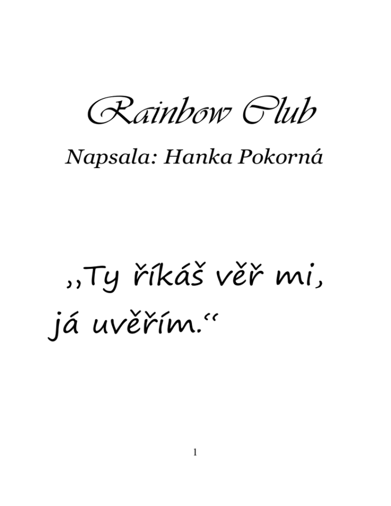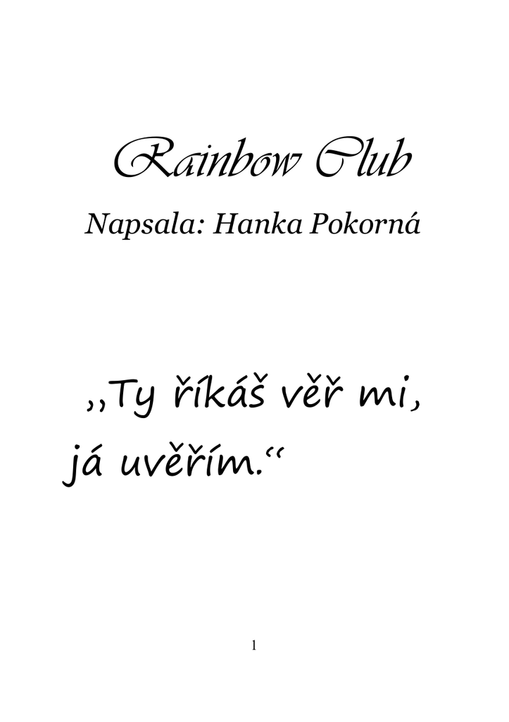 Rainbow Club Napsala: Hanka Pokorná „Ty říkáš věř mi, já uvěřím.“ 1 Díl 1x01 Únos Bylo normální ráno, normálního dne. Tedy zrovna Pondělku. Jenže to bylo jen zdání. Jako obvykle mě ráno přišel vzbudit táta. Já sice už vzhůru byla, ale komu by se chtělo z vyhřátého pelechu? No mě teda ne. Rozhlédla jsem se po pokoji. Toho dne se to dalo nazvat pouze nepořádkem. Úklízela jsem si totiž. Já smysl pro pořádek vždycky měla jen v určitých věcech. A můj pokoj k nim nepatřil. Mě typická výmluva: "Tohle je ale pracovní pořádek." pro mě byla pravdou. Ta peněženka byla někde v téhle hromadě na stole a teď je kde?? Neuvěřitelně rychle zapomínám, kam ty věci při úklidu dávám. Tudíž pro mě napohled pořádek byl chaos. Líně jsem se zvedla z postele a šla do kuchyně. Tam jsem vzala z lednice konzervu pro kočky a šla nakrmit ty svoje dva tygry. Pak obvyklý ranní koloběh. Najíst, oblíct, učesat, atd., atd. Školu mám doslova "před domem",takže dojít tam až takový problém nebyl. Snad jen ten pohled a představa, že tam budu sedět až do tří do odpoledne. Hodiny jsem strávila ve stavu, kterému říkám stav hlubokého zamyšlení. Pak jsem zjistila, že mi chybí sešity do jednoho předmětu. Výhoda domu před škoulou je to, že se můžete na 10 minut vypařit a pak se vrátit se vším, co potřebujete a v pohodě to stihnete. Těch 20 metrů dělících školu od domu jsem uběhla. Doma jsem se začala prohrabávat sešity. "Né, né, taky 2 néééé." prostě pohoda. A pak mě něco chňaplo. A já omdlela. Díl 1x02 Seznamte se s nepřítelem Začala jsem se probouzet: "Au, moje hlava..." Vedle mě se něco zavrtělo: "A co myslíš, že my??? Nás asi nic nebolí." ozvalo se. Otočila jsem se. "Lindo, Anastázie, co vy dvě tu děláte?" byly to moje dvě kamarádky ze školy. Pak jsem se rozhlédla. Byli jsme na hřbitově. "Hřbitov? Co to sakra..." začala jsem a pokusila se zvednout. Nešlo to. Neviděla jsem žádná pouta, ale prostě to nešlo. "Ááá, holoubci se probudili." trhli jsme sebou a otočili se za hlasem. Stála tam babizna, na pohled ani ne moc stará, ale pěkně nechutná. Otrhaný hadry, šedá kůže a plesnivý vlasy. "No fůj!" protáhli jsme všechny tři zároveň. Normálně bysme se tomu začli smát, ale teď... "Babice, jak popelnice." vypadlo ze mě. Holky vyprskly. A baba si mě změřila pohledem, který vraždil. Potom jakási neviditelná síla vytáhla na nohy. "Vezmu si vaši sílu a pak si jděte, kam chcete... Pokud toho vůbec ještě budete schopné!!!" ten začátek jsme moc nepochopili, ale konec jo. A nevypadalo to s náma moc dobře. "Ehm, jakou sílu?? Je vám dobře?" zeptala se Anastázie. "Hloupé víly, to je na tom to nejlepší!! Neumíte se ani bránit!" zařvala. "Začnu s tebou za tu popelnici." otočila se ke mě. A pak to začlo. "Au, au, nech mě ty popelnice!" kvílela jsem zoufale. Cosi ze mě rvala, nějakou moji část o které jsem nevěděla. "Nech ji!" zařvala Linda. "Hanko!" zoufale 3 ječela Anastázie. Podívala jsem se na Popelnici. V rukou se jí začala objevovat malá barevná koule. "Moje, moje. MOJE!" zařvala jsem a přitáhla k sobě tu kouli. A pak kolem mě žačali výřit barvy. Díl 1x03 Rvačka na hřbitově Proměnila jsem se na vílu. "Hanko, super! Podívej se na sebe!" vykřikla Linda. Prohlédla jsem se. Pouta byla pryč. Ale Popelnice tam stála pořád. Některé věci prostě jen tak nemizí. Škoda. "Nevadí, obstarám ti zábavu a pak to skončím s těma dvěma." řekla. Zábava na sebe nenechala čekat. Z hrobů začali vylézat kostry a sápat se po mě. "Ááá, vy jste nekromantka!" ječela jsem. Jsen se na mě koukla. A pak jsem měla co dělat s mojí "zábavou". "Útoč!" volala Anastázie. "Ale oni tam možná jsou někde moji příbuzní!" volala jsem. "Hanko,ti tvoji příbuzní, co tu jsou už jsou mrtvý! Tohle jsou už jen kostry!"volala zpátky Linda."Tak jo. Ehm.... oheň, voda, příroda, vzduch, hudba, já nevím.. prostě něco!" čekala jsem, že nebude fungovat nic. Omyl. Fungovalo všechno. Nejbližší kouhoutky se zbláznily, na několik koster se vrhla ohnivá koule, další svázaly šlahouny, další smetlo tornádo a jiné se rozpadly ze zvukové vlny. Ale pořád jich bylo moc. "Hanko tak leť, na co máš křídla!" volala na mě Anastázie. Pokusila jsem se letět. "Jen kdybych věděla, jak se to děláááááááááááááááááááááááááá!" trochu jsem to přehnala. Hřbitov se začal zmenšovat. "Dost! Dolů!" řvala jsem zoufale. 4 Popelnice toho dole využila a začala vysávat sílu z Anastázie. "Nech ji!!" zařvala jsem, když se mi podařilo zabrzdit metr nad zemí. Škubla jsem Anastáziinou silou k sobě a pak jí ji vrátila. Účinnek byl stejný, jako u mě. Proměnila se. "Supeeeeeeeeer. Hm... Co zkusíme, tak třeba... HUDBA!" trefa na první pokus. Ta zvuková vlna byla mnohem silnější, než u mě. Babice se teprve teď objevil v očích strach. Kouzlo oživující kostry z ní sice vysávalo sílu, ale rychle se pokusila získat novou u Lindy. "Soukromý majetek!" zařvala na ni Linda a proměnila se sama od sebe. "Tak jo ty babo, coto bude? Příroda, voda.... asi nic, OHEŇ!" tak tohle stálo za to. Ohnivá koule se prohnala hřbitovem, ale na všechny kostry to nestačilo. Babice nám obstarala víc "zábavy" a zmizela. Holky smetávaly kostry po desítkách a já se snažila taky. "Hanko udělej něco pořádnýho!!!" volala Linda. Šly po ás pořád a pořád nové kostry. Na hřbitovech je jich halda. "Ale co mám dělat..." řekla jsem. Pak mě napadlo jedno slovo. Jednou jsem viděla v počítačové hře a útok spojený s ním byl super silný. "ARMAGEDON!!" vykřikla jsem. Následovala vlna všech vílích sil, co existovaly. Cítila jsem, jak ze mě mizí energie. A pak tma. POKRAČOVÁNÍ PŘÍŠTĚ Díl 1x04 Alfea Bylo n