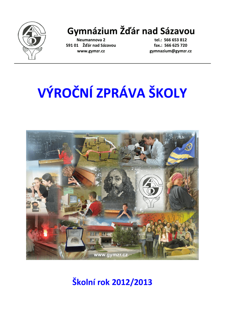 Gymnázium Žďár nad Sázavou Neumannova 2 591 01 Žďár nad Sázavou www.gymzr.cz tel.: 566 653 812 fax.: 566 625 720 [email protected] VÝROČNÍ ZPRÁVA ŠKOLY Školní rok 2012/2013 O Obbssaahh Obsah .......................................................................................................................................... 2 Charakteristika školy ................................................................................................................... 4 Úvodní informace ................................................................................................................... 4 Kurikulum školy....................................................................................................................... 4 Profil absolventa nižšího stupně 8-letého studijního cyklu ................................................... 5 Profil absolventa 4-letého studijního cyklu ............................................................................ 5 Základní údaje o škole ............................................................................................................ 6 Demografické složení žáků školy ............................................................................................ 6 Vybavení školy výpočetní a kancelářskou technikou ............................................................. 6 Organizační schéma školy ....................................................................................................... 7 Rada rodičů ............................................................................................................................. 8 Školská rada ............................................................................................................................ 8 Další informace ....................................................................................................................... 8 Obsazení jednotlivých kabinetů školy .................................................................................... 9 Seznam vedoucích předmětů ............................................................................................... 10 Přehled tříd a třídních učitelů............................................................................................... 11 Přehled učebních plánů ............................................................................................................ 12 Úvodní informace ................................................................................................................. 12 Seznam tříd a jednotlivých učebních plánů ......................................................................... 13 Rozšířená výuka jazyků ......................................................................................................... 13 Údaje o pracovnících školy ....................................................................................................... 14 Seznam provozních zaměstnanců školy ............................................................................... 14 Vzdělávání učitelů ................................................................................................................. 16 Výsledky vzdělávání žáků .......................................................................................................... 17 Úspěšnost absolventů gymnázia na přijímacích zkouškách na VŠ ....................................... 18 Nadace Evy Haňkové-Neugebauerové ................................................................................. 19 Školní projekty .......................................................................................................................... 20 Dny otevřených dveří 2013 .................................................................................................. 47 O radioklubu ......................................................................................................................... 47 Soutěže a olympiády................................................................................................................. 49 Nejvýraznější úspěchy studentů školy.................................................................................. 49 Mezinárodní fyzikální olympiáda - Ondřej Bartoš stříbrný .................................................. 49 Dan Vašek nás bude reprezentovat v Petrohradu ............................................................... 49 Celorepublikové úspěchy španělštinářů ............................................................................... 50 Markéta Trembaczová bodovala v celostátním kole AO ..................................................... 51 Vítěz 2013 ............................................................................................................................. 51 Cena Talent Vysočiny 2013 dvakrát pro Gymnázium Žďár n. S. .......................................... 53 Naši studenti úspěšní ve finále Eurorebusu ......................................................................... 53 Aneta Halouzková oceněna ve výtvarné soutěži .................................................................. 55 Výsledky maturitních zkoušek .............................................................................................. 55 Prima bodovala v soutěži Najdi, co hledáš! ......................................................................... 56 Nejlepší bioložka okresu kategorie D je z naší školy ............................................................ 57 Anička Křečková a Dan Vašek zvítězili v krajském kole ZO ................................................. 57 Máme tři vítězné matematiky! ............................................................................................. 57 V okresním kole zeměpisné olympi