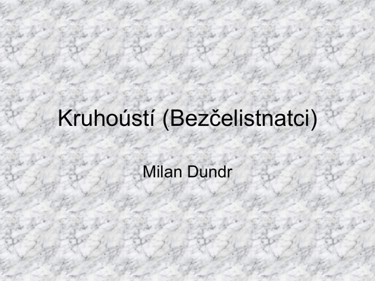 Kruhoústí (Bezčelistnatci) Milan Dundr Nadtřída: Bezčelistnatci (Agnatha) • nemají čelisti • nemají párové končetiny • malá skupina Nadtřída: Bezčelistnatci (Agnatha) • vodní obratlovci – rybovité nebo hadovitě protáhlé tělo • dýchají žábrami • poměrně jednoduchá tělní stavba Nadtřída: Bezčelistnatci (Agnatha) • po celý život primárně zachovaná chorda • všechny žaberní oblouky slouží původní funkci Třída: Kruhoústí (Cyclostomata) Třída: Kruhoústí (Cyclostomata) • primární adaptace k životu ve vodě • tělo hadovitého tvaru – nemá žádné párové přívěsky • chybí kožní kostra včetně šupin Třída: Kruhoústí (Cyclostomata) • vnitřní kostra pouze chrupavčitá • páteř buď úplně chybí • nebo základy horních oblouků obratlů – které přisedají k chordě Třída: Kruhoústí (Cyclostomata) - složité ústní ústrojí - mohutná svalovina - silný jazyk - rohovité zuby Třída: Kruhoústí (Cyclostomata) - výživa: - zvláštní modifikace predátorství, s jakou se u žádné jiné třídy nesetkáváme - některé druhy v dospělosti nepřijímají potravu Třída: Kruhoústí (Cyclostomata) • pohlavní žlázy nepárové • nemají vlastní vývody • někteří mají larvu Stavba larvy mihule (minohy): Minoha: • původně ji omylem popsali jako samostatný rod kruhoústých • tělesnou stavbou i způsobem života připomíná kopinatce Minoha: • ústa: – podkovovitý tvar – ústní dutina nemá zuby ani mohutný jazyk – přepážkou s centrálním otvorem je ústní dutina oddělena od prostorného hltanu Minoha: • hltan: – na dně endostyl (!) (7) – kolem něj není obžaberní prostor – voda se dostává do žaberních váčků • ústí žaberními štěrbinami v podélné vkleslině na bocích přední části těla Minoha: • kostra: – jen chrupavčité základy lebky Minoha: • mozek: – třídílný (2) (ostatní oddíly jen naznačeny) Minoha: • smyslové orgány: – čichový orgán: • má 2 laloky – u dospělce pak splynou – proudový orgán • vnímá proudění vody • buňky v brázdách na povrchu těla Minoha: • smyslové orgány: – primitivní labyrint vnitřního ucha – oči • nejsou dokončeny • pod kůží • neslouží zrakovému vnímání – ALE: pokožka citlivá na světlo Minoha: • vylučovací orgán – holonefros: • nejprimitivnější typ ledviny Minoha: • holonefros: – v každém tělním článku původně: • 1 pár kanálků a náznaků nálevkovitých váčků – k nim přiléhají vnější glomeruly (klubíčka vlásečnic) • kanálky napojeny na párový primární močovod Minoha: - žijí v písku nebo v bahně ve sladkých vodách (!) Minoha: • po 2 – 5 letech (u našich druhů ve 4. roce života) – METAMORFÓZA: – trvá 6 – 8 týdnů – vystoupí oči, začne vidět Minoha: • METAMORFÓZA: – přetvoří se celá ústní krajina • vznikne mohutný svalnatý jazyk a rohovité zuby Minoha: • METAMORFÓZA: – hltan se oddělí od jícnu jako samostatný slepý vak na břišní straně – rozvoj obličejové části lebky • chrupavky, žaberní oblouky Minoha: • METAMORFÓZA: – trávicí trubice se prodlouží • u druhů, které v dospělosti nežerou, zakrní – vznikne tkáň slinivky – zdokonalí se mozek, proudový a čichový orgán Minoha: • METAMORFÓZA: – holonefros: • část zvaná pronefros (3) (hlavová) se redukuje • jako ledvina začne fungovat opistonefros (4) (zadní část ) Minoha: • METAMORFÓZA: – holonefros: • opistonefros (4) (zadní část ): – dokonalejší typ ledviny – ztráta segmentace – zmnožení počtu kanálků – vytvoření Bowmanových váčků s vnitřními glomeruly – vývodem je primární močovod (5) Minoha: • METAMORFÓZA: – mohutný rozvoj gonád • pokračuje i po skončení metamorfózy – u pohlavně dospělých mihulí zabírají nepárové gonády (1) (buď varle nebo vaječník) značnou část těla Stavba dospělce: Dospělec: • kůže: – žlaznaté buňky – slizovitý hlen Dospělec: • pololebka: – složitá obličejová část – jen zlomkovitá mozková část – svalovina trupu segmentovaná • neupírá se na kostru, ale na svalové přepážky (myosepta) Dospělec: • dýchací ústroje: – žábry ve zvláštních kulovitých váčcích (7) • jiní žijící obratlovci to nemají Dospělec: • cévní soustava: – srdce: • • • • žilný splav předsíň (21) komora (20) tepenný násadec (19) – systém cév běžný – je i primitivní mízní soustava Dospělec: • nervová soustava: – už je 5 oddílů mozku • ale koncový mozek (5) a mozeček (2) jsou velmi malé • oproti tomu je mezimozek (4) velký – mícha primitivnější stavby (1) Dospělec: • smyslové ústroje: – proudový orgán • hlava, mezi žaberními štěrbinami – čichový orgán • nepárový • ve stěně čichové chodby Dospělec: • žlázy s vnitřním vyměšováním: – hypofýza • bez vývodu • u mihulí stavba jako u ostatních obratlovců • u sliznatek primitivnější – štítná žláza • u mihulí vzniká z endostylu larev Dospělec: • urogenitální soustava: – u dospělců především opistonefros – gonády jednoduché, nepárové, bez vývodných cest Dospělec: • urogenitální soustava: – zralé pohlavní buňky do tělní dutiny • napojuje se na společné vyústění s primárním močovodem • odtud pohlavní buňky ven z těla Řád: Mihule (Petromyzoniformes) Řád: Mihule • štěrbinovitý ústní otvor se silnými pysky – po přisátí kruhovitý • ústní dutina s rohovitými zuby Řád: Mihule • na hltan se párově napojují žaberní váčky – ústí samostatně žabernmími štěrbinami ven z těla • žaberních štěrbin zpravidla 7 párů Řád: Mihule • dobře vyvinut