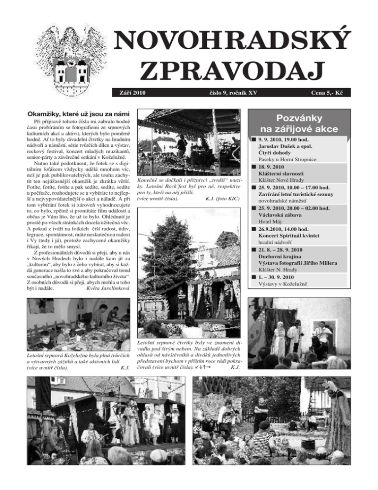 Září 2010 číslo 9, ročník XV Okamžiky, které už jsou za námi Při přípravě tohoto čísla mi zabralo hodně času probíráním se fotografiemi ze srpnových kulturních akcí a aktivit, kterých bylo poměrně hodně. Ať to byly divadelní čtvrtky na hradním nádvoří a náměstí, série tvůrčích dílen a výstav, rockový festival, koncert mladých muzikantů, senior-párty a závěrečné setkání v Koželužně. Nutno také podotknout, že fotek se s digitálním foťákem vždycky udělá mnohem víc, než je pak publikovatelných, ale touha zachytit ten nejúžasnější okamžik je zkrátka větší. Fotíte, fotíte, fotíte a pak sedíte, sedíte, sedíte u počítače, rozhodujete se a vybíráte to nejlepší a nejvypovídatelnější o akci a náladě. A při tom vybírání fotek si zároveň vyhodnocujete to, co bylo, zpětně si promítáte film událostí a občas je Vám líto, že už to bylo. Ohlédnutí je prostě po všech stránkách docela užitečná věc. A pokud z tváří na fotkách čiší radost, údiv, legrace, spontánnost, máte neskutečnou radost i Vy (tedy i já), protože zachycené okamžiky říkají, že to mělo smysl. Z profesionálních důvodů si přeji, aby u nás v Nových Hradech bylo i nadále kam jít za „kulturou“, aby bylo z čeho vybírat, aby si každá generace našla to své a aby pokračoval trend současného „novohradského kulturního života“. Z osobních důvodů si přeji, abych mohla u toho být i nadále. Květa Jarolímková Letošní srpnová Koželužna byla plná tvůrčích a výtvarných zážitků a také aktivních lidí (více uvnitř čísla). K.J. Cena 5,- Kč Pozvánky na zářijové akce Konečně se dočkali i příznivci „tvrdší“ muziky. Letošní Rock´fest byl pro ně, respektive pro ty, kteří na něj přišli. (více uvnitř čísla). K.J. (foto KIC) Letošní srpnové čtvrtky byly ve znamení divadla pod širým nebem. Na základě dobrých ohlasů od návštěvníků a diváků jednotlivých představení bychom v příštím roce rádi pokračovali (více uvnitř čísla). lihg K.J. ¢ 9. 9. 2010, 19.00 hod. Jaroslav Dušek a spol. Čtyři dohody Paseky u Horní Stropnice ¢ 18. 9. 2010 Klášterní slavnosti Klášter Nové Hrady ¢ 25. 9. 2010, 10.00 – 17.00 hod. Zavírání letní turistické sezony novohradské náměstí ¢ 25. 9. 2010, 20.00 – 02.00 hod. Václavská zábava Hotel Máj ¢ 26.9.2010, 14.00 hod. Koncert Spirituál kvintet hradní nádvoří ¢ 21. 8. – 28. 9. 2010 Duchovní krajina Výstava fotografií Jiřího Millera Klášter N. Hrady ¢ 1. – 30. 9. 2010 Výstavy v Koželužně 2 NOVOHRADSKÝ ZPRAVODAJ INFORMACE Z RADNICE Zápis z 19. schůze rady města ze dne 22. 07. 2010 1. Kontrola usnesení z 18. jednání rady města Nové Hrady Rada bere na vědomí provedenou kontrolu usnesení z 18. jednání rady města. 2. Žádost o povolení a oznámení o konání Údolských slavností a hasičské soutěže Memoriál Zdeňka Šavela Rada souhlasí s konáním Údolských slavností a hasičské soutěže Memoriál Zdeňka Šavela dle propozic předložených SDH Údolí u Nových Hradů. /Rada obdržela Žádost o povolení a oznámení o konání Údolských slavností a hasičské soutěže Memoriál Zdeňka Šavela. Uvedená akce se bude konat dne 14. srpna 2010 na Jánské louce v Údolí u Nových Hradů od 12.00 hod. do 01.00 hod. V rámci této akce jsou pro děti připraveny i pouťové atrakce./ 3. Výsledná kalkulace pro výpočet ceny vodného a stočného 2009 Rada bere na vědomí výslednou kalkulaci nákladů pro výpočet ceny vodného a stočného za rok 2009 předloženou provozovatelem ČEVAK, a.s. 4. Žádost o odkoupení pozemku číslo KN 2272 Rada pověřuje místostarostu pana M. Šlence svoláním místního šetření za účasti zástupce MěÚ Nové Hrady, Stavebního úřadu. /Rada obdržela žádost manželů Ivany a Vladimíra Hokrových a Jeleny a Vitalije Kolesníkových o odkoupení pozemku číslo KN 2 2272 rozloze 54 m , který je ve vlastnictví města Nové Hrady. Pozemek se nachází v uzavřené zóně, do které není z veřejných míst přístup./ 5. Vyrozumění o administraci Hlášení č. 1 – odbor SZIF České Budějovice Rada souhlasí s realizací projektu "Vytvoření zázemí pro volnočasové a spolkové aktivity v objektu bývalého Statku - II. etapa". Rada souhlasí s předfinancováním a kofinancováním projektu ve výši 20 % způsobilých výdajů (25 000,- Kč) a nezpůsobilých výdajů projektu ve výši 25 000,- Kč (DPH). Rada pověřuje Městský úřad N. Hrady, investiční odbor přípravou výběrového řízení na zhotovitele díla (stavebních prací). 6. Protokol o vytyčení hranic pozemků Rada bere na vědomí vytyčení hranic pozemků v k.ú. Byňov 7. Vyjádření k projektované trase NN – ZTV – I. Etapa 25 RD Rada souhlasí s návrhem projektované trasy. Rada souhlasí s návrhem Smlouvy o smlouvě budoucí o zřízení práva odpovídajícímu věcnému břemenu a postupuje ji k projednání na jednání zastupitelstva města. /Rada obdržela Vyjádření k projektované trase NN pro ZTV – I. etapa 25 RD, od Jiřík a syn v.o.s. Zliv, situační nákres vedení NN a návrh Smlouvy o budoucí smlouvě o zaří- zení práva odpovídajícího věcnému břemenu. Trasa kabelových rozvodů se dotýká pozemků ve vlastnictví města. Z tohoto důvodu bude třeba uzavřít smlouvu o smlouvě budoucí o zřízení práva odpovídajícímu věcnému břemenu./ 8. Přehled hospodaření 1. pololetí 2010 Rada bere na vědomí přehled hospodaření TSM Nové Hrady za I. pololetí roku 2010. /Rada obdržela od ředitele TSM Nové Hrady Přehled hospodaření za I. pololetí roku 2010. Výsledek hospodaření k 30.6.2010 je ztráta 1 461 780,- Kč. Ztráta je zdůvodněna: nedočerpáním dotace na provoz ve výši 1 milion korun, navýšením náklad
