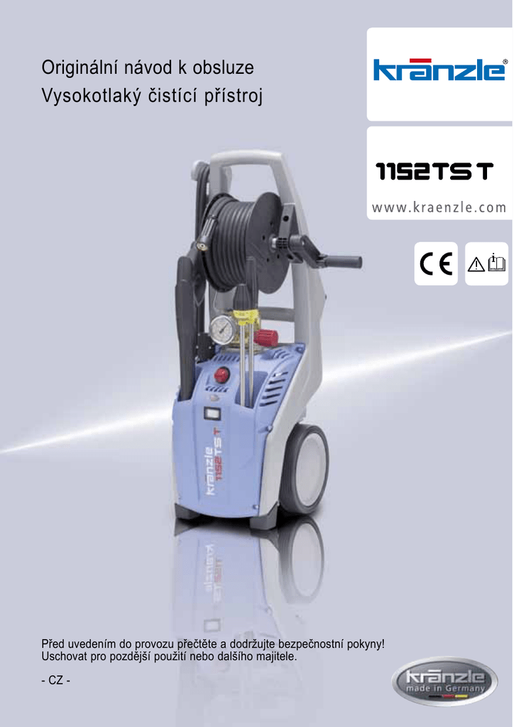 Originální návod k obsluze Vysokotlaký čistící přístroj Před uvedením do provozu přečtěte a dodržujte bezpečnostní pokyny! Uschovat pro pozdější použití nebo dalšího majitele. - CZ - 2 Popis zařízení Kränzle 1152 TS T Ergonomicky formované držadlo pro pojezd Navíjení kabelu s 5 m kabelu Buben s 15 m vysokotlaké hadice z ocelové tkaniny Bezpečnostní vypínací pistole Hadice pro injektor čisticího prostředku Hlava čerpadla ze speciální mosazi Velký manometr z nerezové oceli Plynulá regulace tlaku a množství vody Pouzdro pro bezpečnostní vypínací pistoli Vypínač ZAP/VYP s ochranou motoru Pouzdro pro stříkací trubici Vario-Jet z ušlechtilé oceli a lapač nečistot z ušlechtilé oceli Podvozek vhodný pro pohyb v terénu i po schodech Obsah Strana 3 Popis zařízení................................................................................................................. 2 Obsah ................................................................................................................. 3 Technická data................................................................................................................. 4 Přehled ‘Toto všechno jste koupili‘................................................................................... 5 Všeobecné předpisy........................................................................................................ 6 Bezpečnostní pokyny - Předcházení nehodám, ochrana zdraví................................ 7 Na co byste měli bezpodmínečně dávat pozor......................................................... 10 Technika Kränzle.......................................................................................................... 12 Vodní a čisticí systém............................................................................. 12 Proudová trubice s bezpečnostní vypínací pistolí................................... 12 Pojistný ventil pro regulaci tlaku............................................................. 12 Systém Totalstop.................................................................................... 12 Motorový jistič......................................................................................... 13 Vedení vysokotlaké hadice a stříkací zařízení........................................ 13 Uvedení do provozu..................................................................................................... 14 Nasávání přísad............................................................................................................. 18 Vyřazení z provozu / Ochrana proti mrazu.................................................................... 19 Malé opravy - které si můžete udělat sami.................................................................... 20 Prohlášení o konformitě s ES........................................................................................ 24 Prohlášení o poskytnutí záruky...................................................................................... 25 Univerzální prostřednictvím příslušenství...................................................................... 26 Výpis náhradních dílů.................................................................................................. 28 Kompletní agregát.................................................................................. 28 Motor...................................................................................................... 30 Pohon..................................................................................................... 32 Unloaderventil a tlakový spínač.............................................................. 34 Pouzdro ventilu....................................................................................... 36 Buben na navíjení hadíce....................................................................... 38 Pistole s proudovou trubicí..................................................................... 40 Lapač nečistot........................................................................................ 42 Schéma zapojení.................................................................................... 43 Zkoušky – Doklad o inspekci.................................................................. 44 4 Technická data Kränzle 1152 TS T Pracovní tlak, plynule regulovatelný30-130 bar / 3 - 13 MPa Velikost trysek 042 Přípustný přetlak 150 barů / 15 MPa Vodní výkon při 2.800 ot./min 10 l/min max. vstřikovací tlak vody 10 barů / 1,0 MPa Teplota vpouštěné vody max. 60 °C Buben na navíjení hadíce ano Vysokotlaká hadice z ocelové tkaniny15 m, JS 6 Nasávání přídavných prostředků ano Systém Totalstop ano Elektrická přípojka 230 V~, 12,0 A, 50 Hz Příkon P 1 - 2,8 kW Výkon P 2 - 2,1 kW Hmotnost 31,5 kg Rozměry s držadlem pro pojíždění v mm360 x 365 x 870 Hladina hlučn. podle normy DIN 45 63588 dB (A) Hladina hlučn. s lapač nečistot 90 dB (A) Akustický výkon LWA 93 dB (A) Zpětný náraz na proud. trubici cca. 27 N Vibrace na proud. trubici 1,9 m/s2 Objednací číslo s lapač nečistot 41.218 1 Přípustně odchylky v číselných hodnotách ± 5 % podle jednotkověho listu VDMA 24411 Toto všechno jste koupili 5 1. KRÄNZLE - Vysokotlaký čistící přístroj 1152 TS T s bubnem pro navinutí hadice a 15 m vysokotlaké hadice z ocelové tkaniny 2. Bezpečnostní vypínací pistole s izolovanou rukojetí, se šroubovým spojením 3. Trubice s lapačem nečistot s trubkou z ušlechtilé oceli (ne u zboží č. 41.217) 4. Trubice Vario-Jet s trubkou z ušlechtilé oceli 5. Ruční klika s upevňovacím šroubem 6. Připevňovací háčky pro elektrický kabel se 2 připevňovacími šrouby 7. Návod k provozu 6 Všeobecné předpisy Oblast použití Stroje používejte výhradně k čištění pr