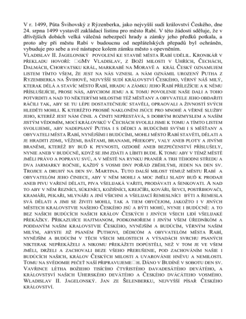 V r. 1499, Půta Švihovský z Rýzenberka, jako nejvyšší sudí království Českého, dne 24. srpna 1499 vystavěl zakládací listinu pro město Rabí. V této žádosti sděluje, že v dřívějších dobách velká válečná nebezpečí hrady a zámky jeho předků potkala, a proto aby při městu Rabí v budoucnu od nepřátelských přepadů byl ochráněn, vybuduje pro sebe a své nástupce kolem zámku město s opevněním. VLADISLAV II. JAGELONSKÝ POVOLENÍ KE STAVBĚ MĚSTA RABÍ UDĚLIL. KRONIKÁŘ V PŘEKLADU HOVOŘÍ: GMY VLADISLAV, Z BOŽÍ MILOSTI V UHŘÍCH, ČECHÁCH, DALMÁCII, CHORVATSKU KRÁL, MARKRABĚ NA MORAVĚ A KRÁL ČESKÝ OZNAMUJEM LISTEM TÍMTO VŠEM, ŽE JEST NA NÁS VZNESL A NÁM OZNÁMIL UROZENÝ PUTHA Z RYZEMBERKA NA ŠVIHOVĚ, NEJVYŠŠÍ SUDÍ KRÁLOVSTVÍ ČESKÉHO, VĚRNÝ NÁŠ MILÝ, KTERAK DĚLÁ A STAVÍC MĚSTO RABÍ, HRADU A ZÁMKU JEHO RABÍ PŘÍLEŽÍCIE A K NĚMU PŘÍSLUŠEJÍCIE, PROSE NÁS, ABYCHOM JEMU A K TOMU POVOLENIE NAŠE DALI A TOHO POTVRDITI A NAD TO NĚKTERÝMI MILOSTMI TÉŽ MĚSŤANY A OBYVATELE JEHO OBDAŘITI RÁČILI TAK, ABY SE TU LÉPE DOSTATEČNEJÍC STAVĚLI, OPRAOVALI A ŽIVNOSTÍ SVÝCH HLEDĚTI MOHLI. K KTERÉŽTO PROSBĚ NAKLONĚNI JSÚCE PRO MNOHÉ A VĚRNÉ SLUŽBY JEHO, KTERÉŽ JEST NÁM ČINIL A ČINITI NEPŘESTÁVÁ, S DOBRÝM ROZMYSLEM A NAŠÍM JISTÝM VĚDOMÍM, MOCÍ KRÁLOVSKŮ V ČECHÁCH SVOLILI JSME K TOMU A TÍMTO LISTEM SVOLUJEME, ABY NADEPSANÝ PUTHA I S DĚDICI A BUDÚCÍMII SVÝMI I S MĚŠŤANY A OBYVATELI MĚSTA RABÍ, NYNĚJŠÍMI I BUDÚCÍMI, MOHLI MĚSTO RABÍ STAVĚTI, DĚLATI A JE HRADITI ZDMI, VĚŽEMI, BAŠTAMI, BRANAMI, PŘIEKOPY, VALY ANEB PLOTY A JINÝMI BRANĚMI, KTERÉŽ BY BUĎ K PEVNOSTI, OZDOBĚ ANEB BEZPEČENSTVÍ PŘÍSLUŠELY, NYNIE ANEB V BUDÚCNĚ, KDYŽ SE JIM ZDÁTI A LÍBITI BUDE. K TOMU ABY V TÉMŽ MĚSTĚ JMĚLI PRÁVO A POPRAVU SVÚ, A V MĚSTĚ NA RYNKU PRANÉŘ A TRH TÉHODNI STŘEDU A DVA JARMARKY ROČNIE, KAŽDÝ S VOSMI DNY POŘÁD ZBĚHLÝMI, JEDEN NA DEN SV. TROJICE A DRUHÝ NA DEN SV. MARTINA. TUTO DALŠÍ MILOST TÉMUŽ MĚSTU RABÍ A OBYVATELÓM JEHO ČINIECE, ABY V NĚM MOHLI A MOC JMĚLI SLADY BUĎ K PRODAJI ANEB PIVU VAŘENÍ DĚLATI, PIVA VŠELIJAKÁ VAŘITI, PRODÁVATI A ŠENKOVATI. A NAD TO ABY V NĚM ŘEZNÍCI, SÚKENÍCI, KOŽIŠNÍCI, KREJČÍŘI, KOVÁŘI, ŠEVCI, POSTŘIHOVAČI, KRAMÁŘI, PEKAŘI, MLYNÁŘI A JINÍ VŠICHNI A VŠELIJACÍ ŘEMESLNÍCI BÝTI A ŘEMESLA SVÁ DĚLATI A JIMI SE ŽIVITI MOHLI, TAK A TIEM OBYČEJOM, JAKOŽTO I V JINÝCH MĚSTECH KRALOVSTVIE NAŠEHO ČESKÉHO JSÚ A BÝTI MOHÚ, NYNIE I BUDÚCNĚ: A TO BEZ NAŠICH BUDÚCÍCH NAŠICH KRÁLOV ČESKÝCH I JINÝCH VŠECH LIDÍ VŠELIJAKÉ PŘEKÁŽKY. PŘIKAZUJÍCE HAJTMANOM, PODKOMOŘIEM I JINÝM VŠEM ÚŘEDNÍKÓM A PODDANÝM NAŠIM KRALOVSTVIE ČESKÉHO, NYNĚJŠÍM A BUDÚCÍM, VĚRNÝM NAŠIM MILÝM, ABYSTE JIŽ PSANÉM PUTHOVI, DĚDICÓM A OBYVATELÓM MĚSTA RABÍ, NYNĚJŠÍM A BUDÚCÍM V TĚCH VŠECH MILOSTECH A VÝSADÁCH SVRCHU PSANÝCH NIKTERAK NEPŘEKÁŽELI A NIKOMU PŘEKÁŽETI DOPÚSTĚLI, NEŽ V TOM JE VE VŠEM JMĚLI, DRŽELI A ZACHOVALI BEZE VŠEHO PŘERUŠENIE, POD ZACHOVÁNÍM NAŠIE I BUDÚCÍCH NAŠICH, KRÁLOV ČESKÝCH MILOSTI A UVAROVÁNIE HNĚVU A NEMILOSTI. TOMU NA SVĚDOMIE PEČEŤ NAŠÍ PŘIPRAVUJEMEH. DÁNO V BUDÍNĚ V SOBOTU DEN SV. VAVŘINCE LÉTHA BOŽIEHO TISÍCÍHO ČTYŘISTÉHO DAVADESÁTÉHO DEVÁTÉHO, A KRÁLOVSTSVÍ NAŠICH UHERSKÉHO DEVÁTÉHO A ČESKÉHO DVÁCÁTEHO VOSMÉHO. WLADISLAV II. JAGELONSKÝ. JAN ZE ŠELENBERKU, NEJVYŠŠÍ PÍSAŘ ČESKÉHO KRÁLOVSTVÍ. LIST, NEBOLI VLAJKU TVOŘÍ DVA PRUHY V POMĚRU 2 :1. V MODRÉM PRUHU BĚŽÍCÍ HNĚDÝ VLK SE ŠIKMO POLOŽENÝM ZELENÝM JELENÍM PAROŽÍM KOLEM KRKU. BÍLÝ PRUH MÁ DEVĚT ČTVERCOVÝCH ZUBŮ (JAKO POČET NA HRADEBNÍCH CIMBUŘÍ) A OSUM STEJNÝCH MEZER (JAKO PŘIROZENÁ OCHRANA ŘEKOU OTAVOU). POZN.:VLK SE ZELENÝM PAROŽÍM JE OJEDINĚLÝM ZNÁZORNĚNÍM V ČESKÝCH ERBECH JAKO TAKOVÝMI. Erb, nebo-li městský znak tvoří modrý štít, v němž je stříbrná kvádrovaná hradba s cimbuřím a s otevřenou bránou uprostřed, která má černou vytaženou mříž a zlaté veřeje. Z hradby vyrůstají tři stříbrné čtyřhranné kvádrované věže, které mají po třech oknech (2+1) a nahoře jsou vždy zakončeny cimbuřím o třech stínkách. Na cimbuří obou krajních věží se nohama opírá vpravo běžící vlk přirozené barvy, který má na krku zavěšeny jelení parohy zelené barvy, skloněné nazpět. Na štítu je napravo pootočený kolčí helm se stříbrnými a modrými přikryvadly a stříbrnomodrou točenicí, ze které vyrůstá horní polovina vlka, mající na krku opět zavěšeny jelení parohy zelené barvy. (Poslední změnu barevnosti figury paroží vysvětluje v publikaci Jan Pelant “Znaky a pečetě západočeských měst a městeček” chybou v překladu českého privilegie v 17. a 18. století (především za Marie Terezie) ze staročeštiny do němčiny zřejmě došlo k chybě, neboť gelene (jelení) bylo zaměněno za grűne (zelené). Město Rabí obdrželo městský znak r. 1513.