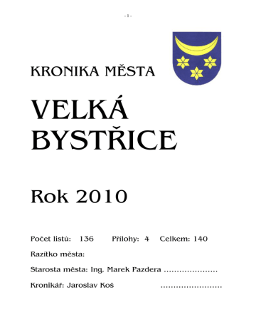 -1- KRONIKA MĚSTA VELKÁ BYSTŘICE Rok 2010 Počet listů: 136 Přílohy: 4 Celkem: 140 Razítko města: Starosta města: Ing. Marek Pazdera ………………… Kronikář: Jaroslav Koš …………………… -2- OBSAH: Č: I. II. III. IV. V. Str.: 4 4 5 8 9 10 10 12 13 15 16 16 22 23 29 31 32 33 33 35 36 37 39 40 42 42 42 43 44 45 45 46 49 50 51 52 Název části: Úvod Životopis kronikáře Světové a vnitrostátní zajímavosti a události roku 2009 Přehled nejdůležitějších událostí města v roce 2009 Popis obce Poloha obce Vzhled obce Počasí v roce Obyvatelstvo Samospráva a správa obce Samospráva – zastupitelstvo Rada města Rozpočet města Činnost komisí a výborů: komise stavební(str.23), sportovní(24),školská a kulturní(26), pro rodinu,sociální a zdravotní(26), umisťování na DPS(27), výbor finanční(27), výbor kontrolní(28) Městský úřad Stavební úřad Archiv města Hospodářský život Stavební činnost – firmy, řemesla, služby, prodejny, pohostinství Zemědělská činnost Autobusová doprava a autodoprava České dráhy a.s. Česká spořitelna, a.s. Hotel Zámek - Ferona, a.s. Politický a veřejný život Činnost politických stran KDU-ČSL ČSSD KSČM Činnost společenských a zájmových organizací Sbor dobrovolných hasičů Český rybářský svaz Český zahrádkářský svaz Český kynologický svaz Auto-velo-klub Svaz postižených civilizačními chorobami -3- VI. VII. VIII. IX. X. XI. XII. XIII. 52 54 54 56 56 57 57 58 58 60 61 69 69 76 77 81 82 97 99 99 100 102 103 104 108 110 110 115 119 120 121 122 122 123 124 125 126 127 129 133 135 136 Sdružení rodičů a přátel školy Junák-svaz skautů a skautek ČR Senior klub Sociální a zdravotní zařízení Dům pokojného stáří sv.Anny Ordinace praktického lékaře – MUDr. P.Kafka Dětské oddělení – MUDr. J.Andresová Praxe zubního lékaře – MUDr. P.Jašek Zařízení rehabilitační péče - Lékárna Školní jídelna Obvodní oddělení policie ČR Kultura a školství Masarykova základní škola a mateřská škola Základní umělecká škola Kulturní středisko Místní knihovna Národopisný soubor Haná Divadelní soubor Církevní život Římskokatolická církev Československá církev husitská Tělovýchova a sport Sportovní klub Sokol Orel Různé významné a zajímavé události města v chronologii Výstavba náměstí a amfiteátru Hanácký rok Půl století bystřických zahrádkářů XVII. Bílý kámen Slavnost kroje Volby do Poslanecké sněmovny Sečení lóke Lidový rok 2010 První Setkání Hanáků Projekt Comenius – návštěva partnerů u nás První Svatomartinské slavnosti XII. Bystřické banjo Komunální a senátní volby 2010 Videokronika města 2010 Závěr Přílohy kroniky Obsah Velkobystřických novin – Ing.Vladislav Miloš: Bystřická třicátá léta -4- I. Úvod Tento čtvrtý – závěrečný díl kroniky města za volební období 2007 – 2010 je tak trochu bilanční. Je to velké ohlédnutí nejen za rokem 2010 – rokem bezesporu úspěšným a rokem plným událostí – ale je to i jisté skládání účtů za celé čtyři roky. To vyvrcholilo v listopadu komunálními volbami, které odpověděly na otázku jak to občané vidí a jak (nebo spíš s kým) dál. A již v tomto úvodu je možno říct, že stávající garnitura bystřických zastupitelů téměř stoprocentně obstála, což je možno říct i o bystřických volebních stranách. Jistě k tomu přispělo i to, že zastupitelstvo, které po celé volební období nedoznalo jediné personální změny, finanční prostředky převážně z EU nejen získalo, ale i účelně a beze zbytku proinvestovalo. A tak jako červená nit se v mnoha statích této kroniky vracíme ke stavbě století – totální rekonstrukci bystřického náměstí a všech přilehlých prostorů, včetně výstavby a otevření nového amfiteátru. Rok 2010 tak do historie města vešel bezesporu jako rok úspěšný. Stručný životopis kronikáře Jaroslava Koše Narodil jsem se v roce 1939 v Olomouci – Chválkovicích. Po ukončení základní školy jsem se vyučil univerzálním soustružníkem kovů a pracoval v závodě TOS Olomouc, vystudoval mistrovskou průmyslovou školu, později pak olomoucké gymnázium Jiřího z Poděbrad. Absolvoval jsem vojenskou školu tankového vojska ve Vyškově a v hodnosti poručíka se stal v roce 1961 vojákem z povolání. S manželkou Věrou jsme se vzali v roce 1961 a nastěhovali do Přáslavic, kde jsem jako důstojník působil deset let, žena od roku 1962 učila na základní devítileté škole ve Velké Bystřici. V Přáslavicích se nám narodila dcera Dana, později i dcera Hana. V procesu normalizace jsem byl za své pravicové a antisovětské postoje zbaven funkce a v roce 1971 propuštěn z armády. Zaměstnání jsem získal u ČSAD jako řidič kamionu vnitrostátní dopravy. Jako politicky nespolehlivý jsem nesměl mít víc jak jednoho podřízeného a postavení druhořadého člena společnosti pocítila tvrdě i celá moje rodina. V Přáslavicích jsme byli po nuceném odchodu z armády společensky i morálně degradováni a proto jsme za cenu zadlužení postavili domek ve Velké Bystřici, kam jsme se v roce 1973 přestěhovali. Od roku 1980 jsem pracoval jako technik v bystřických Oblastních komunálních službách, v roce 1991 jsem byl politicky rehabilitován a vykonával funkci tajemníka na velkobystřickém Obecním úřadě. Tam jsem pracoval po dvě volební období a v roce 1999 odešel do důchodu. -5- Osm let jsem pak působil na částečný úvazek ve funkci sekretáře Sdružení tajemníků městských a obecních úřadů ČR. Ve Velké Bystřici 31. ledna 2011. Světové, evropské a vnitrostátní zajímavosti roku 2010 Informační zdroj: ročenka magazínu MF Dnes, vlastní poznámky • Španělsko se ujalo předsednictví v Evropské u