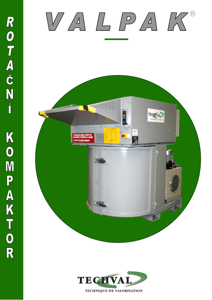 ® The VALPAK ®, snadné použití a nízké náklady … Vkládání do plastových pytlů Drcení a zhutňování Automatické spouštění Snadná manipulace s balíky Minimální nároky na prostor (3 m²) a minimální hladina hluku • kompaktor VALPAK® může být přímo na místě vzniku odpadů • materiál je drcen a zhutňován do plastových pytlů • VALPAK® zpracovává kartony, plasty a malé přepravky • automatické spouštění stroje pomocí fotobuňky • kontrolka stavu naplnění plastového pytle • kontrolka stavu množství vody na zvlhčování • automatické zastavení stroje při výskytu cizího tělesa • snadná obsluha Přídavné vybavení VALPAK Předdrtič Vyklápěcí adaptér Předdrtič na velké kartony o šířce do 1200 mm a tloušťce 70 mm Ruční lis Zařízení na vyklápění balíků (pouze pro vysokozdvižný vozík) Pro lisování malého množství plastů Hmotnost balíku: max 40 kg Rozměry Rozměry : A B C D E F VALPAK 2,8 m 1,4 m 2,4 m 1,7 m 1,7 m 2m / VALPAK S 2,4 m 1,2 m 2,2 m 1,5 m 1,7 m 2m Přepravní rozměry Electricity : 380 V triple phase or 220 V triple phase VALPAK / VALPAK S Power : 4 kW Délka x Šířka x Výška 2 ,4 x 1,4 x 2 2,2 x 1,2 x 2 Protection : 16 A curve D Hmotnost 1,2 t 1t Hmotnost balíku KARTON PLAST DŘEV.PŘEPRAVKY VALPAK / od 300 do 400 Kg od 150 do 200 Kg od 300 do 350 Kg VALPAK S od 250 do 350 Kg od 100 do 150 Kg od 250 do 300 Kg Napětí : 380 V tři fáze Příkon : 4 kW Ochrana (jistič) : 16 A (A nebo D) TECHVAL TEL : +33 (0)2 35 10 44 10 – FAX : +33 (0)2 35 10 44 19 Zone artisanale Toussaint – 76400 FECAMP FRANCE S.A.S. au capital de 98 880 euros – RCS : B 439 875 642 www.techval.fr Výhradní dovozce : WINCORP s.r.o. Jugoslávských partyzánů 26 • P.O.Box 148 • 160 41 Praha 6 Tel.: 257 325 450 • Fax: 257 322 193 • Mobil: 723 450 247 www.wincorp.cz