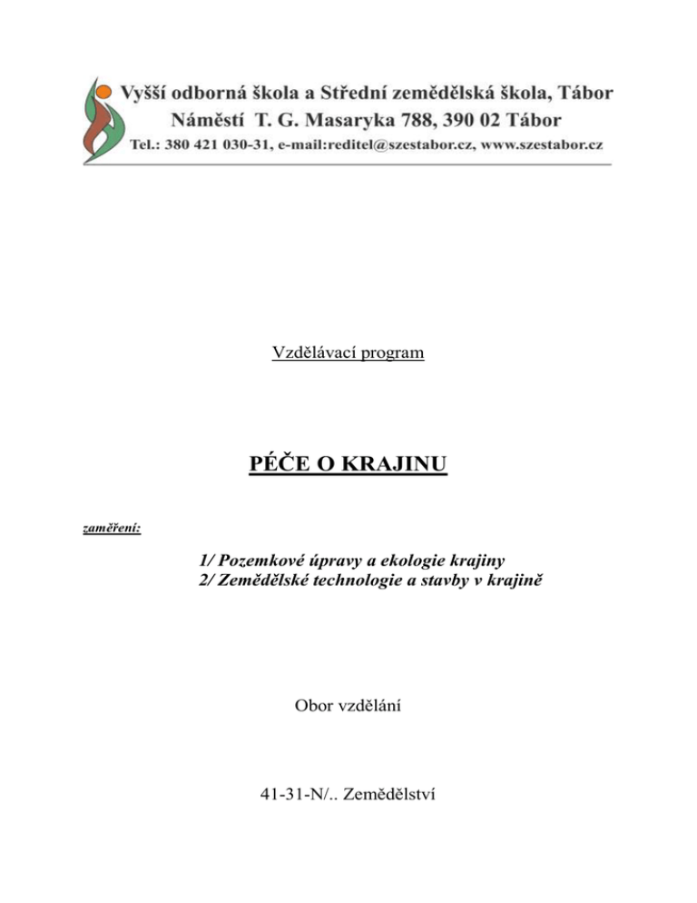 Vzdělávací program PÉČE O KRAJINU zaměření: 1/ Pozemkové úpravy a ekologie krajiny 2/ Zemědělské technologie a stavby v krajině Obor vzdělání 41-31-N/.. Zemědělství IDENTIFIKAČNÍ ÚDAJE VYŠŠÍ ODBORNÉ ŠKOLY: Název školy: Vyšší odborná škola a Střední zemědělská škola, TÁBOR, Náměstí T. G. Masaryka 788 Adresa školy: Náměstí T. G. Masaryka 788, 390 02 TÁBOR Zřizovatel školy: Jihočeský kraj Typ právnické osoby: příspěvková organizace Kód a název oboru vzdělání: 41-31-N/.. ZEMĚDĚLSTVÍ Název vzdělávacího programu: PÉČE O KRAJINU Zaměření vzdělávacího programu: 1) Pozemkové úpravy a ekologie krajiny 2) Zemědělské technologie a stavby v krajině (jen pro denní formu vzdělávání) Podmínky zdravotní způsobilosti uchazeče: obor nevyžaduje zvláštní zdravotní požadavky Řádná délka vzdělávacího programu: 3 roky Forma vzdělávání: denní a dálková Vyučovací jazyk: český jazyk Dosažený stupeň vzdělání: vyšší odborné Způsob ukončení vzdělávání: absolutorium Certifikát: vysvědčení o absolutoriu, diplom absolventa Označení absolventa: Diplomovaný specialista (DiS.) Vyšší odborná škola a Střední zemědělská škola, Tábor, Náměstí T. G. Masaryka 788 Náměstí T. G. Masaryka 788, 390 02 TÁBOR PÉČE O KRAJINU 41-31-N/.. Zemědělství OBSAH VZDĚLÁVACÍHO PROGRAMU: 1 Profil absolventa 2 Uplatnění absolventa 3 Charakteristika vzdělávacího programu 3.1 Pojetí a cíle vzdělávacího programu 3.2 Charakteristika obsahu vzdělávacího programu 3.3 Organizace výuky 3.4 Podmínky pro přijímání studentů 4 Učební plány 4.1 Denní forma vzdělávání 4.1.1 Učební plán jednosloupcový 4.1.2 Učební plán konkretizovaný 4.1.3 Poznámky k učebnímu plánu 4.1.4 Samostudium a konzultace 4.1.5 Přehled využití týdnů 4.2 Dálková forma vzdělávání 4.2.1 Učební plán konkretizovaný 4.2.2 Poznámky k učebnímu plánu 4.2.3 Přehled využití týdnů 4.3 Hodnocení výsledků vzdělávání studentů 4.4 Metodické postupy výuky 5 Učební osnovy 5.1 Učební osnovy povinných předmětů společných pro obě zaměření Anglický jazyk Německý jazyk Odborná konverzace v anglickém jazyce Odborná konverzace v německém jazyce Vybrané kapitoly z psychologie Sociální psychologie Základní poznatky o EU Právní příprava Tělesná výchova Výpočetní technika Obecná ekologie Péče o životní prostředí Dendrologie Tvorba krajiny Alternativní hospodaření v krajině Ekologická zařízení a stavby Podnikání Účetnictví Základy statistiky 3 strana: 6 8 9 9 9 11 12 12 13 13 16 18 18 18 19 19 20 21 21 22 23 24 28 32 35 38 42 46 49 51 54 58 62 68 72 76 80 83 86 89 Vyšší odborná škola a Střední zemědělská škola, Tábor, Náměstí T. G. Masaryka 788 Náměstí T. G. Masaryka 788, 390 02 TÁBOR PÉČE O KRAJINU 41-31-N/.. Zemědělství 5.2 Učební osnovy povinných předmětů výběrových: 5.2.1 zaměření Pozemkové úpravy a ekologie krajiny Analytická chemie Laboratorní práce Aplikace výpočetní techniky Geografické informační systémy Pedologie Obecná dendrologie Pěstování lesa Péče o zvěř Vodní plochy v krajině Ochrana živ. prostředí * Geodézie* Aplikace geodézie v praxi Pozemkové úpravy* Projektování krajinářských a pozemkových úprav Aplikovaná ekonomika Základy projektování na PC Technicko-právní normy Odborná praxe ekologická (odpolední) Individuální odborná praxe ekologická (bloková) 5.2.2 zaměření Zemědělské technologie a stavby v krajině Stavební materiály konstrukce Technické kreslení Výkresy zemědělských staveb Projektování na počítači * Základy vizualizace Technologie a stavby v RV * Projektování technologií a staveb v RV Etologie hospodářských zvířat Základy plemenářství Stájové technologie * Projektování technologií a staveb v ŽV Kvalitativní management Ekonomická optimalizace hospodaření Technicko-právní normy Odborná praxe technologická (odpolední) Individuální odborná praxe technologická (bloková) 5.3 Učební osnovy předmětů volitelných: Vybrané kapitoly z biologie Vybrané kapitoly z chemie Ekosystémy v krajině Vybrané kapitoly z ŽV Vybrané kapitoly z RV Biotechnologie Aplikovaná sociální psychologie Matematika Biochemie 4 93 96 99 102 105 110 114 118 121 124 127 131 133 139 143 146 148 152 155 157 161 164 168 171 173 177 179 183 186 191 195 200 203 207 210 212 216 219 222 225 228 231 233 236 Vyšší odborná škola a Střední zemědělská škola, Tábor, Náměstí T. G. Masaryka 788 Náměstí T. G. Masaryka 788, 390 02 TÁBOR PÉČE O KRAJINU 41-31-N/.. Zemědělství 6 Přílohy - doklady o odborném zabezpečení výuky vzdělávacího programu 6.1 6.2 6.3 6.4 6.5 6.6 6.7 Soupis specializovaných učeben, laboratoří a dalších výukových prostor Údaje o knihovně a její vybavenosti Záměr rozvoje a odůvodnění vzdělávacího programu Údaje o rozvoji spolupráce s odbornou praxí,VOŠ,VŠ a dalšími partnery Zdůvodnění společenské potřeby vzdělávacího programu Seznam pracovišť odborných praxí Vyjádření sociálních partnerů k předkládanému vzdělávacímu programu 5 239 242 242 243 244 246 249 Vyšší odborná škola a Střední zemědělská škola, Tábor, Náměstí T. G. Masaryka 788 Náměstí T. G. Masaryka 788, 390 02 TÁBOR PÉČE O KRAJINU 41-31-N/.. Zemědělství 1 PROFIL ABSOLVENTA: Absolvent má po úspěšném ukončení vzdělávání uvedeného vzdělávacího programu znalosti a schopnosti potřebné ke kvalifikovanému řešení problematiky projektování pozemkových a krajinářských úprav, Územních systémů ekologické stability a revitalizace krajiny, realizace programů Obnovy venkova, projektování a zavádění zemědělských a alternativních technologií citlivých ke krajině a životnímu prostředí, p