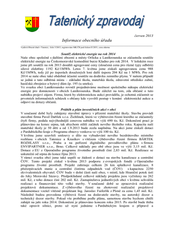 červen 2013 Informace obecního úřadu ______________________________________________________________________________ Vydává Obecní úřad v Tatenici, číslo 3/2013, registrováno MK ČR pod číslem E12831, cena zdarma Soutěž elektrické energie na rok 2014 Naše obec společně s dalšími obcemi a městy Orlicka a Lanškrounska se zúčastnila soutěže elektrické energie na Českomoravské komoditní burze Kladno pro rok 2014. V loňském roce jsme při soutěži na rok 2013 dosáhli agregované ceny (sloučená cena pro různé typy odběrů) silové elektřiny 1192 Kč/1MWh. Letos 7. května jsme získali agregovanou cenu 988 Kč/1MWh, tedy již po úsporách dosažených loni další úspora 204 Kč na 1 MWh. Pro rok 2014 se naše obec také obdobně účastní soutěže na dodávku zemního plynu. V našem případě se jedná o tato odběrná místa – základní škola, mateřská škola, zdravotní středisko zubní, hasičská zbrojnice a bytový dům čp. 195 (u smrku). Ve svazku obcí Lanškrounsko rovněž projednáváme možnost společného nákupu elektrické energie pro domácnosti v obcích Lanškrounska. Bude záležet na tom, zda občané o tuto nabídku projeví zájem. Firma, která by elektronickou aukci prováděla, je ochotná zúčastnit se prvotních informačních schůzek s občany kde vysvětlí postup v konání elektronické aukce a odpoví na dotazy občanů. Průběh a plán investičních akcí v obci V současné době byly zahájeny stavební úpravy v přízemí mateřské školy. Stavbu provádí stavební firma Pavel Dařílek s.r.o. Žichlínek, která ve výběrovém řízení kterého se zúčastnily čtyři firmy, podala nejvýhodnější cenovou nabídku ve výši 690 tis. Kč. Dokončení prací je plánováno na konec srpna, tak abychom stihli začátek nového školního roku. Kapacita naší mateřské školy je 50 dětí a od 1.9.2013 bude zcela naplněna. Na akci jsme získali dotaci z Pardubického kraje z Programu obnovy venkova ve výši 100 tis. Kč. V květnu jsme uzavřeli smlouvy o dílo na vybudování nového bezdrátového místního rozhlasu v obcích Tatenice a Krasíkov s vítězem výběrového řízení firmou BÁRTEK ROZHLASY s.r.o., Praha a na pořízení digitálního povodňového plánu s firmou ENVIPARTNER s.r.o., Brno. Celkové náklady pro obě obce jsou ve výši 3,15 mil. Kč. Dotace z EU z Operačního programu životního prostředí činí 2,83 mil. Kč. Realizace se uskuteční od srpna do konce října 2013. V rámci svazku obcí jsme také uspěli se žádostí o dotaci na stavbu kanalizace a centrální ČOV. Tento projekt získal v květnu 2013 podporu z evropských fondů z Operačního programu životní prostředí. Projekt zahrnuje celkem 26 km splaškové kanalizace, 8 přečerpávacích stanic a centrální čistírnu odpadních vod (ČOV) s kapacitou 2250 ekvivalentních obyvatel. ČOV bude v dolní části naší obce, v místě, kde Hraniční potok ústí do řeky Moravské Sázavy. Předpokládané celkové náklady projektu jsou vyčísleny na 262 mil. Kč, z toho dotace činí 202 mil. Kč. Zastupitelstva jednotlivých obcí v květnu schválila realizaci a financování této velké stavby. V současné době se zpracovává realizační projektová dokumentace. Z výběrového řízení na zhotovení realizační projektové dokumentace vzešel vítězně projektant Ing. Jaroslav Faiferlík z Plzně za cenu 1,45 mil. Kč. Následně budou provedena výběrová řízení na dodavatele stavby, na autorský dozor a technický dozor stavby. Pokud vše proběhne podle plánu, samotnou stavbu bychom chtěli zahájit na jaře roku 2014. Dokončení je plánováno koncem roku 2015. Po stavbě bude třeba také opravit silnici, proto už nyní jednáme s Pardubickým krajem o přípravě a předpokládaných termínech realizace akcí „Modernizace silnice II/315 Krasíkov – Tatenice – hranice kraje“ a „Modernizace silnice II/368 Krasíkov – Třebařov“. Prvně jmenovaná stavba by měla být zahájena v r. 2014, druhá až po stavbě kanalizace v r. 2016. Z menších akcí nyní opravujeme část střechy na přístavbě ZŠ. Opravu spojenou s výměnou střešní krytiny provádí fa. Robert Purkert z Lubníka. U ZŠ také pracujeme na opravě venkovního schodiště a oplocení kolem zahrady. Na zahradě MŠ bohužel někdo z hracího prvku odmontoval a odcizil plastovou skluzavku. Krádež šetří Policie, způsobená škoda je přes 6 tis. Kč. Zaměstnanci obce pracují při úklidu a údržbě veřejných prostranství a veřejné zeleně, v obecních lesích, při opravě veřejného osvětlení, na údržbě obecního majetku apod. Např. v lesích na jaře vysázeli 5 tis. nových sazenic, vyžínají trávu mezi mladými stromky, dělají úklid po těžbě a zpracovávají palivové dřevo k prodeji. Letos již bylo zpracováno a prodáno 70 m3 palivového dřeva. Realizace stavby „Hraniční potok-stabilizace koryta“, kterou již delší dobu připravuje správce potoka Lesy ČR s.p. byla opět odložena, a to na podzim letošního roku. Jedná se o tři úseky v horní části obce, kde budou upraveny a stabilizovány břehy potoka. Letní slavnost na nádvoří zámku 31.8.2013 Na konec prázdnin připravujeme větší kulturní akci pro všechny spoluobčany zejména seniory, na nádvoří zámku. V sobotu odpoledne 31.8. 2013 od 14 do 18 hod. vystoupí krojovaná dechová kapela ZDOUNEČANKA, večer bude dále hrát kapela STUDIO MIX Libchavy. O přestávkách mezi koncertem dechovky vystoupí několik tanečních skupin, zatím nemáme ještě vše dohodnuto. Ve spolupráci s místními spolky zajistíme občerstvení. V srpnu k této kulturní akci připravíme a rozešleme do Vašich domácností pozvánky. Vladimír Žák, starosta Informace Základní školy a Mateřské školy Tatenice Provoz mateřské školy během prázdnin od 1.7.2013 do 31.8.