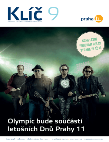 Klí periodický tisk územního samosprávného celku KOMPLETNÍ SLAV O M A R G O R P Ž 18 STRANA 15 A Olympic bude součástí letošních Dnů Prahy 11 asopis klí roník xxiv msíník mstské ásti praha . záí zdarma www.praha.cz facebook.compraha.cz Inzerce Šustova Komplexní zdravotní péče ve Vaší blízkosti SLEVA SLEVA Opatovská 25 NA DOPLATEK NA DOPLATEK věk do 15-ti let, nad 60 let věk od 16-ti do 59-ti let 2 Apo-Ibuprofen 400 mg 100 tablet uleví od bolesti hlavy, zad, kloubů i menstruační bolesti, snižuje horečku a tlumí projevy zánětu + Čtěte pečlivě příbalovou informaci. běžná cena NÍZKÉ CENY Majerského ODBORNÉ PORADENSTVÍ 129 Kč 30 tablet navíc léčivý přípravek k vnitřnímu užití, obsahuje ibuprofen Při nákupu předložte kupon v lékárně. Platnost kuponu 1.–30. 9. 2016 Čtěte pečlivě příbalovou informaci! Správné použití konzultujte se svým lékařem či lékárníkem. Akce platí od 1. 9. do 30. 9. 2016 nebo do vyprodání zásob pro držitele Klientské karty, v běžnou pracovní dobu. *Sleva až 50% na doplatek platí u léků hrazených z veřejného zdravotního pojištění pro pacienty starší 60- a mladší 15-ti let a pro všechny držitele průkazu TP, ZTP a ZTP/P. Ostatní pacienti získají slevu až 25 %. Slevu z doplatku lze poskytnout až do výše povolené regulované obchodní přirážky lékárny. Výši slevy lze ověřit na účtence. Více informací v lékárně nebo na www.medifin.eu PRAHA NEJŠIRŠÍ VÝBĚR ZA NEJLEPŠÍ CENY! Trávníkové hnojivo Expert Plus 10 kg se železem, složení NPK je 7-7-15, výrazně vyšší obsah draslíku, na všechny druhy trávníků, pro podzimní sílu trávníku a dobré zazimování, balení vystačí na cca 330 m2 vyrobeno v ČR vzor 1 od 35,- vzor 2 Plastové plotovky t k 10 kg nenasákavé a masivní plně probarvené profily v tradičních tvarech, nevyžadují žádnou údržbu, barevně stálé, profily lze snadno řezat a díky způsobu probarvení povrchově upravovat, mimořádná povětrnostní odolnost, půlkulatá (vzor 1) nebo tříhranná hlava (vzor 2) 249,- Lazura na ploty 5 kg slabovrstvá lazura, pro exteriéry, odstín palisandr, oregonská pinie 5 kg 229,Okrasná tvárnice jednostranná barva šedá, rozměr: 39 x 19,5 x 19 cm Beton B 20, 25 kg Mulčovací kůra 20 MPa, beton třídy C 15/20, vhodný pro všechny betonářské práce, např. jako podklady pro dlažby, základy, opěrné zdi, pro zahradní betonáž obrubníků apod. balení 80 l, produkt z nařezané kůry jehličnatých stromů 80 l 79,- 25 kg 65,od 1 palety 59,- ks 39,- Zveme Vás také k příjemnému posezení do našeho BAUHAUS Bistra. k. z. Průhonice - Čestlice, U Makra 130 • Praha Dolní Chabry, Ústecká 822 • Praha Pankrác, Budějovická 409/1a www.bauhaus.cz Tato nabídka platí od 1. 9. 2016 do vyprodání zásob, nejdéle však do 30. 9. 2016. Ceny jsou uvedeny včetně DPH. Platí pro obvyklé množství jedné domácnosti. Chyby a změny jsou vyhrazeny. Úvodem Obsah 5 Tóny Chodovské tvrze Příspěvek k problematice tranzitní dopravy na území Městské části Praha 11 14 Neztrácejte schopnost žasnout, říká Wabi Daněk 22 KC Zahrada 6 ĉČťŖĉĐť ßÀĊĈĉĎ ɏ° 15 Dny Prahy 11 24 Nábory do sportovních klubů 25 Co naděláme, škola je tu Prázdninové zprávy z Rady MČ .............................................................................................. 4 Jihoměstská sociální informuje ............................................................................................10 Velkoobjemové kontejnery na bioodpad – 2. pololetí 2016 ..........................................11 Kulturní přehled ...................................................................................................................... 20 Pozvánky do Chodovské tvrze ............................................................................................. 23 Měsíčník KLÍČ. Reg. č.: MK ČRE 13187. Vydavatel a redakce: městská část Praha 11, Ocelíkova 672, 149 41 Praha 415, IČO: 00231126, tel. ústředna: 267 902 111, redakce tel.: 267 902 217, tel./fax: 267 902 493, e-mail: [email protected]. Odpovědný redaktor: Dana Foučková. Výroba časopisu: BRANDBAKERS, s. r. o. Distribuce: Česká pošta, s. p., pro občany Prahy 11 bezplatně. Produkce: BRANDBAKERS, s. r. o. Náklad: 41 000 výtisků. Předáno do tisku: 23. srpna 2016. Nevyžádané rukopisy, fotografie apod. se nevracejí. Za obsah inzerátu odpovídá výhradně inzerent. Za obsahovou správnost příspěvků nesou odpovědnost autoři. Přetisk povolen jen se svolením redakce. Inzerce: volejte 734 259 340, pište na [email protected], informujte se na www.casopisklic.cz. Strana 26 až 28 je v souladu s ust. § 4a zákona č. 46/2000 Sb., o právech a povinnostech při vydávání periodického tisku a o změně některých dalších zákonů (tiskový zákon), vyhrazena pro sdělení, která vyjadřují názory členů zastupitelstva městské části Praha 11, týkající se městské části Praha 11. Uveřejněná sdělení nevyjadřují názor vydavatele, ale jednotlivých zastupitelů městské části Praha 11. VÁŽENÍ ČTENÁŘI, distribuci zpravodaje Klíč na území Prahy 11 má na starost Česká pošta, s. p. Pokud jste Klíč první týden v měsíci nedostali do schránek nebo byl pohozen na zemi, napište nám prosím na e-mail: [email protected], [email protected] a uveďte ulici a číslo popisné. Vážení obyvatelé Prahy 11, je konec prázdnin a rád bych vás tímto informoval o své činnosti za poslední půlrok. Myslím si, že jsme pracovali s kolegou Lukešem velmi intenzivně a kromě jiného jsme připravovali rozvojové projekty pro zlepšení bydlení na Praze 11. Velkým pomocníkem je Odbor územního rozvoje pod vedením paní architektky M. Fišarové, který pracuje naprosto perfektně. Předložili jsme v