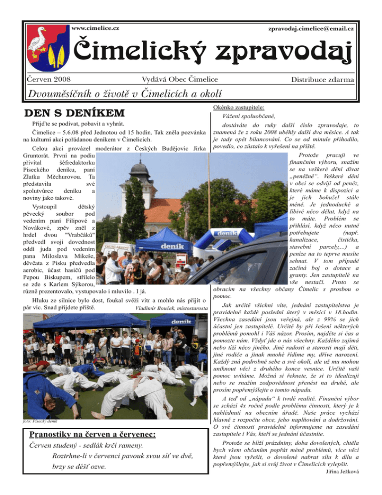 www.cimelice.cz [email protected] Čimelický zpravodaj Červen 2008 Vydává Obec Čimelice Distribuce zdarma Dvouměsíčník o životě v Čimelicích a okolí DEN S DENÍKEM Přijďte se podívat, pobavit a vyhrát. Čimelice – 5.6.08 před Jednotou od 15 hodin. Tak zněla pozvánka na kulturní akci pořádanou deníkem v Čimelicích. Celou akci provázel moderátor z Českých Budějovic Jirka Gruntorát. První na podiu přivítal šéfredaktorku Píseckého deníku, paní Zlatku Měchurovou. Ta představila své spolutvůrce deníku a noviny jako takové. Vystoupil dětský pěvecký soubor pod vedením paní Filipové a Novákové, zpěv zněl z hrdel dvou "Vrabčáků" předvedl svoji dovednost oddí juda pod vedením pana Miloslava Mikeše, děvčata z Písku předvedla aerobic, účast hasičů pod Pepou Biskupem, střílelo se zde s Karlem Sýkorou, různě prezentovalo, vystupovalo i mluvilo . I já. Hluku ze silnice bylo dost, foukal svěží vítr a mohlo nás přijít o pár víc. Snad přijdete příště. Vladimír Bouček, místostarosta foto: Písecký deník Pranostiky na červen a červenec: Červen studený - sedlák krčí rameny. Roztrhne-li v červenci pavouk svou síť ve dvě, brzy se déšť ozve. Okénko zastupitele: Vážení spoluobčané, dostáváte do ruky další číslo zpravodaje, to znamená že z roku 2008 uběhly další dva měsíce. A tak je tady opět bilancování. Co se od minule přihodilo, povedlo, co zůstalo k vyřešení na příště. Protože pracuji ve finančním výboru, snažím se na veškeré dění dívat „peněžně“. Veškeré dění v obci se odvíjí od peněz, které máme k dispozici a je jich bohužel stále méně. Je jednoduché a líbivé něco dělat, když na to máte. Problém se přihlásí, když něco nutně potřebujete (např. kanalizace, čistička, stavební parcely,...) a peníze na to teprve musíte sehnat. V tom případě začíná boj o dotace a granty. Jen zastupitelé na vše nestačí. Proto se obracím na všechny občany Čimelic s prosbou o pomoc. Jak určitě všichni víte, jednání zastupitelstva je pravidelně každé poslední úterý v měsíci v 18.hodin. Všechna zasedání jsou veřejná, ale z 99% se jich účastní jen zastupitelé. Určitě by při řešení některých problémů pomohl i Váš názor. Prosím, najděte si čas a pomozte nám. Vždyť jde o nás všechny. Každého zajímá nebo tíží něco jiného. Jiné radosti a starosti mají děti, jiné rodiče a jinak mnohé řídíme my, dříve narození. Každý zná podrobně sebe a své okolí, ale už mu mohou uniknout věci z druhého konce vesnice. Určitě vaši pomoc uvítáme. Možná si řeknete, že si to idealizuji nebo se snažím zodpovědnost přenést na druhé, ale prosím popřemýšlejte o tomto nápadu. A teď od „nápadu“ k tvrdé realitě. Finanční výbor se schází 4x ročně podle problému činnosti, který je k nahlédnutí na obecním úřadě. Naše práce vychází hlavně z rozpočtu obce, jeho naplňování a dodržování. O své činnosti pravidelně informujeme na zasedání zastupitele i Vás, kteří se jednání účastníte. Protože se blíží prázdniny, doba dovolených, chtěla bych všem občanům popřát méně problémů, více věcí které jsou vyřešit, o dovolené nabrat sílu k dílu a popřemýšlejte, jak si svůj život v Čimelicích vylepšit. Jiřína Ježková Čimelický zpravodaj Strana 2 ZPRÁVY Z OBCE ZÁPIS ZE ZASTUPITELSTVA OBCE Ze zasedání zastupitelstva obce dne 29.4.2008 v 18 hodin - Zastupitelstvo souhlasí s případnou výměnou pozemku stavební parcela č. 278/3 /v majetku obce pod panelákem čp. 242/ za pozemek č. 980/33. - Přiznání grantu - Obnova a vybavení sportovní haly 65 000,Kč, vypracování projektu kanalizace a čistírny 227 383,20 Kč, dotace na opravu hřbitova 70 000,-, zastupitelstvo pověřuje pana starostu k podpisu smlouvy. - Dotace na modernizaci sportovní haly nebyla přiznána. - Návrh: připravit projekt pro druhou výzvu ROP na celkovou rekonstrukci sportovní haly včetně možnosti nástavby družiny. Zadat vypracování žádosti firmě RAVEN. - Možnost prezentace Obce Čimelice v projektu firmy KARTOGRAFIA Brno - Zastupitelstvo odsouhlasilo rozšíření veřejného osvětlení - osvětlení na návsi - roh nákupního střediska - prodloužení od zdravotního střediska směrem k Nádražní ulici - rekonstrukce od Hubených až k čp. 24 - Návrh na změnu smlouvy na odpady pro podnikatele. Odloženo na příští jednání - Zastupitelstvo souhlasí s prodejem pozemku parcela č. 994/7 o výměře 403 m2 parcela č. 994/51 o výměře 103 m2 cena 80,- Kč za lm2 - Zastupitelstvo souhlasí pronajmout část parkoviště na návsi v Čimelicích pro akci „Den s deníkem“ dne 5.6.2008 - Zastupitelstvo souhlasí s prodejem pozemku č. 979/2 u čp. 312 za dříve stanovenou cenu po vyrovnání nákladů na výstavbu septiku mezi ZD Čimelice a společenství vlastníků - Různé - Zastupitelstvo bere na vědomí zprávu o hospodaření sportovní haly za rok 2007 Červen 2008 EXKURZE – OBECNÍ ODPADY – INSPIRACE OD SOUSEDŮ Sdružení Calla pořádalo v úterý 29.4.2008 exkurzi, která se uskutečnila jako aktivita projektu „Jihočeské přírodní zdroje pro budoucnost“ podpořeného grantem z Islandu, Lichtenštejnska a Norska v rámci Finančního mechanismu EHP a Norského finančního mechanismu prostřednictvím Nadace rozvoje občanské společnosti. Popíši Vám jak to dělají v příhraničí v okolí města Freistadt v Rakousku. Již 15 let je zde na území okresu Freistadt o rozloze 99 389,61 ha 27 obcí, v nichž žije celkem 64 tis.obyvatel ve 22 664 domácnostech přistupuje k odpadu takto. Problém s odpady řešili místní po uzavření skládky. Vznikl okresní odpadový svaz obcí, který řeší všechny otázky odpadů. V obcích lidé nemají popelnice, nejsou