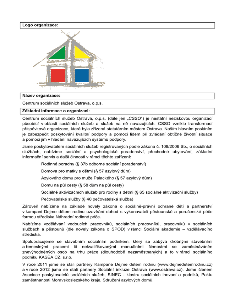 Logo organizace: Název organizace: Centrum sociálních služeb Ostrava, o.p.s. Základní informace o organizaci: Centrum sociálních služeb Ostrava, o.p.s. (dále jen „CSSO“) je nestátní neziskovou organizací působící v oblasti sociálních služeb a služeb na ně navazujících. CSSO vzniklo transformací příspěvkové organizace, která byla zřízená statutárním městem Ostrava. Naším hlavním posláním je zabezpečit poskytování kvalitní podpory a pomoci lidem při zvládání obtížné životní situace a pomoci jim v hledání navazujících systémů podpory. Jsme poskytovatelem sociálních služeb registrovaných podle zákona č. 108/2006 Sb., o sociálních službách, nabízíme sociální a psychologické poradenství, přechodné ubytování, základní informační servis a další činnosti v rámci těchto zařízení: Rodinné poradny (§ 37b odborné sociální poradenství) Domova pro matky s dětmi (§ 57 azylový dům) Azylového domu pro muže Palackého (§ 57 azylový dům) Domu na půl cesty (§ 58 dům na půl cesty) Sociálně aktivizačních služeb pro rodiny s dětmi (§ 65 sociálně aktivizační služby) Pečovatelské služby (§ 40 pečovatelská služba) Zároveň nabízíme na základě novely zákona o sociálně-právní ochraně dětí a partnerství v kampani Dejme dětem rodinu uzavírání dohod s vykonavateli pěstounské a poručenské péče formou střediska Náhradní rodinné péče. Nabízíme vzdělávání vedoucích pracovníků, sociálních pracovníků, pracovníků v sociálních službách a pěstounů (dle novely zákona o SPOD) v rámci Sociální akademie – vzdělávacího střediska. Spolupracujeme se stavebním sociálním podnikem, který se zabývá drobnými stavebními a řemeslnými pracemi či nekvalifikovanými manuálními činnostmi se zaměstnáváním znevýhodněných osob na trhu práce (dlouhodobě nezaměstnaných) a to v rámci sociálního podniku KASEA CZ, s.r.o. V roce 2011 jsme se stali partnery Kampaně Dejme dětem rodinu (www.dejmedetemrodinu.cz) a v roce 2012 jsme se stali partnery Sociální inkluze Ostrava (www.ostrava.cz). Jsme členem Asociace poskytovatelů sociálních služeb, SINEC - klastru sociálních inovací a podniků, Paktu zaměstnanosti Moravskoslezského kraje, Sdružení azylových domů. Nabízíme: Pro spolupráci s organizací Mezinárodní cenou vévody z Edinburghu bychom největší míru realizace dobrovolníků spatřovali v aktivitě DOUČOVÁNÍ dětí v pěstounské péči v rámci střediska Náhradní rodinné péče. Naše středisko aktuálně doprovází v pěstounství více než 150 rodin, ve kterých se velmi často objevují specifické problémy se školou, školním prospěchem a obecně probíraným učivem. V rámci námi poskytovaných aktivit na středisku nejsme schopni samostatně pokrýt poptávku ze strany dětí, pěstounů a školy na poskytnutí či zprostředkování právě doučování. Zpravidla se jedná o učivo na úrovni druhého stupně základní školy, mohou se objevit i témata středoškolského vzdělání. Dobrovolníky z řad studentů středních škol na území města Ostravy, popř. v okolních okresech, bychom uvítali právě pro doučování v rodinách, kdy na zajištění procesu doučování by dobrovolník spolupracoval s klíčovou pracovnicí rodiny. Rádi bychom, aby se doučování realizovalo od nového školního roku, tj. od září 2016. Požadavky: věk min. 16 let – dle aktuálně poptávaného učiva ochota být parťákem při učení, umět motivovat alespoň 1 týdně (dle individuální domluvy), vždy v odpoledních hodinách dlouhodobost – 3 a více měsíců Kontaktní osoba: Mgr. Hana Schwarz, vedoucí střediska Náhradní rodinné péče Náhradní rodinná péče Tovární 2114/11, 709 00 Ostrava – Mariánské Hory email: [email protected] nebo [email protected] tel.: 733 714 048 www.css-ostrava.cz