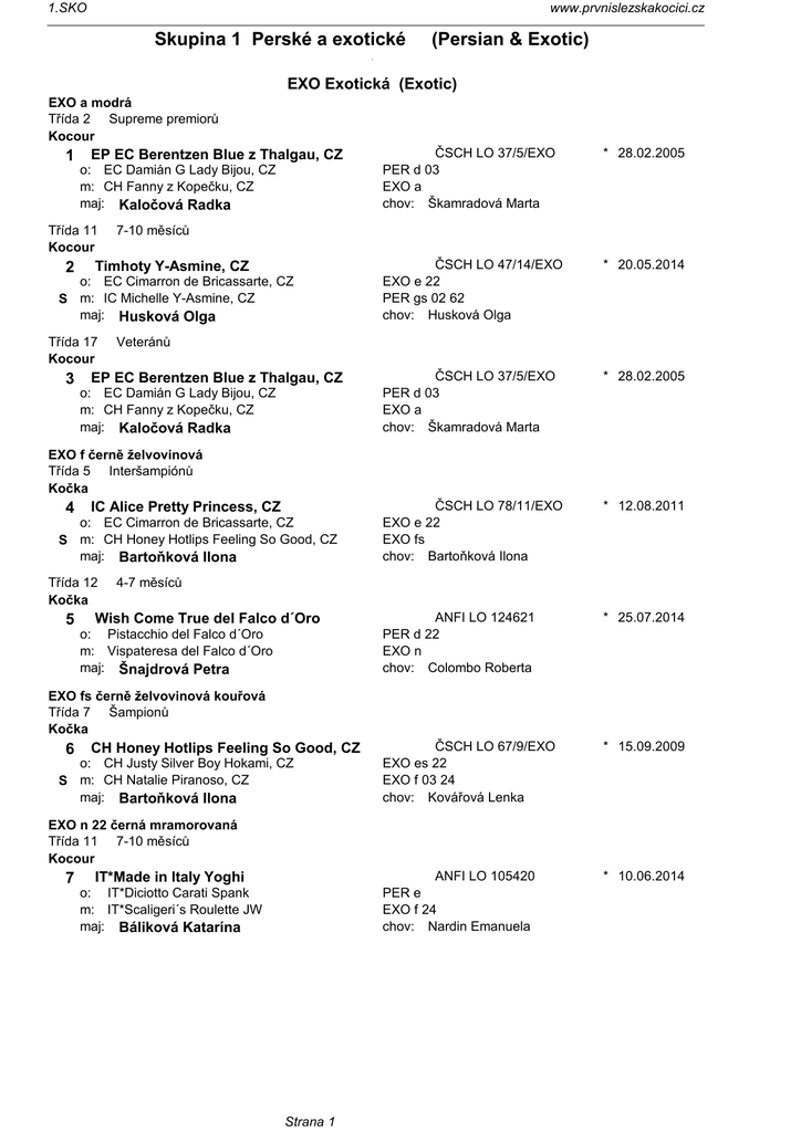 1.SKO www.prvnislezskakocici.cz Skupina 1 Perské a exotické (Persian & Exotic) . EXO Exotická (Exotic) EXO a modrá Třída 2 Supreme premiorů Kocour 1 EP EC Berentzen Blue z Thalgau, CZ o: EC Damián G Lady Bijou, CZ m: CH Fanny z Kopečku, CZ maj: Kaločová Radka Třída 11 Kocour 2 3 * 28.02.2005 ČSCH LO 47/14/EXO EXO e 22 PER gs 02 62 chov: Husková Olga * 20.05.2014 ČSCH LO 37/5/EXO PER d 03 EXO a chov: Škamradová Marta * 28.02.2005 ČSCH LO 78/11/EXO EXO e 22 EXO fs chov: Bartoňková Ilona * 12.08.2011 ANFI LO 124621 PER d 22 EXO n chov: Colombo Roberta * 25.07.2014 ČSCH LO 67/9/EXO EXO es 22 EXO f 03 24 chov: Kovářová Lenka * 15.09.2009 ANFI LO 105420 PER e EXO f 24 chov: Nardin Emanuela * 10.06.2014 7-10 měsíců Timhoty Y-Asmine, CZ o: EC Cimarron de Bricassarte, CZ S m: IC Michelle Y-Asmine, CZ maj: Husková Olga Třída 17 Kocour ČSCH LO 37/5/EXO PER d 03 EXO a chov: Škamradová Marta Veteránů EP EC Berentzen Blue z Thalgau, CZ o: EC Damián G Lady Bijou, CZ m: CH Fanny z Kopečku, CZ maj: Kaločová Radka EXO f černě želvovinová Třída 5 Interšampiónů Kočka 4 IC Alice Pretty Princess, CZ o: EC Cimarron de Bricassarte, CZ S m: CH Honey Hotlips Feeling So Good, CZ maj: Bartoňková Ilona Třída 12 Kočka 5 4-7 měsíců Wish Come True del Falco d´Oro o: Pistacchio del Falco d´Oro m: Vispateresa del Falco d´Oro maj: Šnajdrová Petra EXO fs černě želvovinová kouřová Třída 7 Šampionů Kočka 6 CH Honey Hotlips Feeling So Good, CZ o: CH Justy Silver Boy Hokami, CZ S m: CH Natalie Piranoso, CZ maj: Bartoňková Ilona EXO n 22 černá mramorovaná Třída 11 7-10 měsíců Kocour 7 IT*Made in Italy Yoghi o: IT*Diciotto Carati Spank m: IT*Scaligeri´s Roulette JW maj: Báliková Katarína Strana 1 1.SKO www.prvnislezskakocici.cz EXO fs 03 černě želvovinová stříbřitá bikolor Třída 7 Šampionů Kočka CH Eveline Pretty Princess, CZ 8 o: GIC I'm Boss Y-Asmine, CZ S m: CH Honey Hotlips Feeling So Good, CZ maj: Bartoňková Ilona Třída 11 Kočka * 14.06.2013 ČSCH LO 23/14/EXO PER ds 03 22 EXO fs chov: Bartoňková Ilona * 29.03.2014 7-10 měsíců Ginger Pretty Princess 9 ČSCH LO 31/13/PER PER ds 03 22 EXO fs chov: Bartoňková Ilona o: GIC I'm Boss Y-Asmine, CZ S m: CH Honey Hotlips Feeling So Good, CZ maj: Husková Olga . PER Perská (Persian) PER as 02 21 modrá stříbřitá harlekýn s nespecifickou kresbou Třída 9 Otevřená Kočka ČSCH LO 282/13/PER 10 Connie Dauphin, CZ JW PER ns 01 21 62 o: GIC Dauphin Granát, CZ PER f S m: CH De Lindars´Optical Illusion chov: Rylichová Helena maj: Rylichová Helena * 15.08.2013 PER n černá Třída 7 Šampionů Kočka 11 CH Valentine Baunty Kitty, CZ o: GIC Athelstones Out of The Blue, S JW m: Almathea Song of Love GG maj: Kostková Anna Třída 9 Kocour o: WW10 Rene Del Falco D´Oro, JW JW m: Welcome Melody maj: Belski Michal, Jerzy Třída 12 Kocour 13 * 20.08.2010 ANFI LO 109400 PER n EXO g chov: Belski Michal, Jerzy * 25.03.2012 ZAŽÁDÁNO PER n PER n chov: Makowska Aneta * 18.08.2014 0110-356214 PER n PER n chov: Makowska Aneta * 07.07.2014 FPL LO 54363 PER d PER f 03 23 chov: Büttner Ronald * 01.07.2011 Otevřená Trovatore Del Falco D´Oro 12 ČSCH LO 403/10/PER PER a 22 PER n chov: Čudovská Taťána 4-7 měsíců Almathea Say you love Me o: Kuorii Joe Black of Almathea JW S m: Almathea Aretha Franklin maj: Makowska Aneta Kočka 14 Almathea Royal Delivery o: Kuorii Joe Black of Almathea JW S m: Almathea Aretha Franklin maj: Makowska Aneta PER a modrá Třída 3 Grandinteršampiónů Kocour 15 GIC A Heaven Sent True Blue JW NW o: EC Lukas of Kenfthis JW S m: WW04-GIC Candirand´s Romance JW maj: Makowska Aneta Strana 2 1.SKO www.prvnislezskakocici.cz Třída 12 Kočka 16 4-7 měsíců Almathea one Wish one Heaven o: GIC A Heaven Sent True Blue JW NW S m: Pandapers Violet of Almathea maj: Makowska Aneta 17 Almathea Made in Heaven o: GIC A Heaven Sent True Blue JW NW S m: Pandapers Violet of Almathea maj: Makowska Aneta 0107 - 1757734 PER a PER f chov: Makowska Aneta * 20.06.2014 0107 - 1757735 PER a PER f chov: Makowska Aneta * 20.06.2014 FPL LO 64635 PER n 24 PER d 22 chov: Belski Michal, Jerzy * 01.05.2013 0110 - 1757736 PER a PER f chov: Makowska Aneta * 20.06.2014 PER d červená Třída 9 Otevřená Kocour 18 PL*Jurtomi Junior Mandau o: CH Moebius Chocobo, PL JW S m: LV*Nostri Vincent Private Emotions maj: Belski Michal, Jerzy Třída 12 Kocour 19 4-7 měsíců Almathea Must be Dreamin o: GIC A Heaven Sent True Blue JW NW S m: Pandapers Violet of Almathea maj: Makowska Aneta 20 0110-356219 Almathea All about Me o: GIC A Heaven Sent True Blue JW NW S m: Almathea And I love Her maj: Makowska Aneta * 19.07.2014 PER a PER f chov: Makowska Aneta PER f černě želvovinová Třída 12 4-7 měsíců Kočka 21 Iris Lady Bijou, CZ o: EC Ronald Lady Bijou, CZ m: CH Viktoria Granát, CZ maj: JUDr. Soukenková Dagmar ČSCH LO 159/14/PER PER ds 03 23 PER g chov: JUDr. Soukenková Dagmar * 16.06.2014 ČSCH LO 114/11/PER PER ns 03 24 PER ns 03 chov: Slabý Jiří * 15.01.2011 ČSCH LO 78/13/PER PER ns EXO f chov: Bartoňková Ilona * 24.04.2013 PER ns černá kouřová Třída 7 Šampionů Kocour 22 CH Jonáš Granát, CZ o: GIC Rooggenstein´s Summerlook S m: IC Turandot Granát, CZ maj: Bartoňková Ilona PER fs černě želvovinová kouřová Třída 5 Interšampiónů Kočka 23 IC Dorothy Pretty Princess, CZ o: CH Jonáš Granát, CZ S m: IC Alice Pretty Princess, CZ maj: Bartoňková Ilona Strana 3 1.SKO www.prvnislezskakocici.cz PER gs modře želvovinová kouřová Třída 5 Interšampiónů Kočka 24 IC Aisha Dauphin, CZ o: CH Miro Rock N Roll m: CH Glamour Granát, CZ maj: JUDr. Soukenková Dagmar ČSCH LO 294/11/PER PER n PER gs 03 chov: Rylichová Helena * 05.09.2011 FPL LO 42368 PER ns 12 PER ns 11 chov: Wilhelm Jeans * 06.07.2011 ČSCH LO 19/12/PER PER ns 11 PER ns 11 chov: Seichertová Jitka * 21.05.2008 PER ns 11 černá stříbřitá stínovaná Třída 1 Supreme šampi
