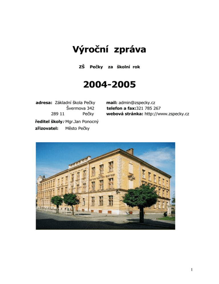 Výroční zpráva ZŠ Pečky za školní rok 2004-2005 adresa: Základní škola Pečky Švermova 342 289 11 Pečky mail: [email protected] telefon a fax:321 785 267 webová stránka: http://www.zspecky.cz ředitel školy: Mgr.Jan Ponocný zřizovatel: Město Pečky 1 Charakteristika školy Základní škola je součástí výchovně vzdělávací soustavy, poskytuje základní vzdělávání.Je zařazena do sítě škol/školského rejstříku/. Je právním subjektem, v právních vztazích vystupuje svým jménem a má odpovědnost vyplývající z těchto vztahů. Základní škola má devět ročníků a člení se na první a druhý stupeň. První stupeň je tvořen prvním až pátým ročníkem, druhý stupeň šestým až devátým ročníkem. Součástí školy jsou školní družina a školní klub. Na základě dlouhodobé koncepce práce školy se zaměřujeme na informatiku, výuku cizích jazyků a na péči o žáky s vývojovými poruchami učení. Ve škole se vyučovalo podle vzdělávacích programů schválených MŠMT ČR. Vzdělávací programy ve školním roce 2004/2005 1.stupeň ZÁKLADNÍ ŠKOLA čj.16847/96-2 2.stupeň ZÁKLADNÍ ŠKOLA čj.16847/96-2 V 7.-9. ročníku bylo zařazeno 7 volitelných předmětů formou 15 bloků. Cíle vzdělávání byly formulovány v dlouhodobé koncepci rozvoje školy - učit se poznávat, jednat, žít a být / 4 cíle vzdělávání pro 21.století /. Škola se snažila rozvíjet osobnost žáků s ohledem na individuální odlišnost dětí. Poskytovala dětem základní všeobecné vzdělání s důrazem na komunikaci, toleranci názorů, řešení problémů nekonfliktní cestou, ochranu přírody a vlastního zdraví. Prioritou zůstala výuka informatiky a cizích jazyků i zaměření na zdravý životní styl a integraci všech dětí do vzdělávání/3 speciální třídy,hodiny ambulatních nácviků/. I přes nekvalifikovanou výuku některých hodin Aj a Nj dosáhli žáci výborných výsledků v okresních, krajských a celostátních soutěžích díky výbornému vybavení jazykových pracoven a hodinám konverzace. Informatika dnes slouží vzdělávání v mnohem větší míře než v letech nedávných. Pomohlo proškolení učitelského sboru v rámci programu počítačové gramotnosti. Škola mohla být zapojena do mezinárodní soutěže „Safer Internet magický a přátelský“ ,do evropské spolupráce žáků / e-Twinning / i učitelů/ Comenius3 / právě díky tomu, že je zde zázemí ve dvou počítačových pracovnách a žáci ovládají základy práce ve Wordu, e-mailovou korespondenci, vyhledávání informací na internetu, chatování, někteří dokáží využít Power Point i Excel. Vztahy mezi učiteli a žáky byly většinou založeny na vzájemné důvěře a respektu. Učitelé vedli děti k odpovědnosti za vlastní jednání. Obsah vzdělání určovaly osnovy programu Základní škola. Snažili jsme se o odklon od jednotvárné frontální výuky k různorodým metodám / včetně projektových /. Výuku doplnily exkurze, besedy, charitativní sbírky. Počítačové pracovny využívali učitelé na různé předměty. 2 Evaluace Vnější ČŠI v uplynulém roce školu nenavštívila, máme tedy k dispozici zprávu z r. 2001, která naši školu zařadila mezi školy velmi dobré. Kvalita vzdělávání, řízení, vedení a motivace pracovníků byla hodnocena jako velmi dobrá, kvalita řízení jako nadprůměrná. Škola má funkční organizační strukturu. Mezi významnými zjištěními ČŠI zmínila výborné zajištění výuky Aj a výsledky pečeckých žáků v konverzačních soutěžích okresních i krajských a mezinárodní spolupráci školy. Vnitřní Přejeme si velmi dobrou školou zůstat. V rámci příprav na ŠVP ZV provedla školu SWOT analýzu. Silné stránky školy Za silné stránky školy učitelé považují kvalitní výuku informatiky a jazyků u aprobovaných učitelů, péči o žáky s VPU , integraci tělesně postižených, péči o talentované i v učivu zaostávající děti, schopnost týmové spolupráce učitelů 1.stupně,odborné pracovny, preventivní program se zaměřením na ochranu zdraví, charitativní akce, organizační strukturu školy,velkou účast žáků na okresních soutěžích, fungující školní družinu a školní klub,mimoškolní akce / KMD /, dobrá prezentace školy na webu a v místním tisku, úspěšnost v počtu přijatých na gymnázia a střední školy, estetické prostředí nové výdejny stravy, funkční školní počítačová síť/ učebny,kabinety,školní klub a družina/,vstřícný kolektiv vedení a ekonomického úseku. Slabé stránky školy Menší spolupráce učitelů 2.stupně a někdy jednotvárné metody frontální výuky,malá motivace učitelů ke zlepšování vlastního výkonu, nekvalifikovaná výuka výchov a některých hodin cizích jazyků, zastaralé vybavení sbírek a knihovny,chybějící sportoviště, tělocvična a zázemí pro družinu / venkovní prostor pro hry /, estetický vzhled staré budovy/ fasáda/, okna /,absence žaluzií / ,nevyhovující šatny pro žáky 2.stupně, nezájem části veřejnosti o práci školy / sponzoři i někteří rodiče /, absence cyklotras pro děti z vesnic, nedostatek finančních prostředků / vybavení kabinetů, vzdělávání učitelů,modernizace výuky ,poloha školy- hlučnost,prašnost /, bezpečnost ve městě . Příležitosti Větší využití moderních technologií ve výuce, důraz na výchovu ke zdravému životnímu stylu / měnit klima školy – nestresující prostředí /, realizace ročníkových nebo celoškolních projektů / vystoupit z budovy školy a zapojit místní komunitu /, rozšíření nabídky volitelných předmětů, péče o děti ze sociálně slabých rodin, navázání spolupráce s evropskými školami, sledovat moderní trendy ve výuce v evropském kontextu, celoži