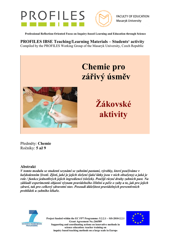 Professional Reflection-Oriented Focus on Inquiry-based Learning and Education through Science PROFILES IBSE Teaching/Learning Materials – Students‘ activity Compiled by the PROFILES Working Group of the Masaryk University, Czech Republic Chemie pro zářivý úsměv Žákovské aktivity Předměty: Chemie Ročníky: 5 až 9 Abstrakt V tomto modulu se studenti seznámí se zubními pastami, výrobky, které používáme v každodenním životě. Zjistí, jaké je jejich složení (jaké látky jsou v nich obsaženy) a jaká je role / funkce jednotlivých jejich ingrediencí (složek). Použijí různé druhy zubních past. Na základě experimentů objasní význam pravidelného čištění a péče o zuby a to, jak pro jejich zdraví, tak pro celkový zdravotní stav. Posoudí důležitost pravidelných preventivních prohlídek u zubního lékaře. Project funded within the EC FP7 Programme: 5.2.2.1 – SiS-2010-2.2.1 Grant Agreement No.:266589 Supporting and coordinating actions on innovative methods in science education: teacher training on inquiry based teaching methods on a large scale in Europe Professional Reflection-Oriented Focus on Inquiry-based Learning and Education through Science SCENARIO: Varianta 1: Petr dostává peníze na svačinu, za které si však kupuje sladkosti. Kamarád Honza mu to vytýká a říká, že bude mít problémy se zubním kazem. Petr odporuje, že si každé ráno a večer čistí zuby kvalitní zubní pastou, na zubech má jen bílé flíčky a žádné kazy, takže se nemá čeho bát. Naopak Petr si myslí, že problémy se zubním kazem bude mít Honza, protože pije hodně coca-coly a džusu. Kdo má pravdu? Varianta 2 (EN): Toothpastes often appear in television commercials. Their importance for the prevention of tooth decay is emphasized. Especially fluoride is considered as very important and active ingredient in toothpastes. Toothbrushing with fluoridated toothpastes results in increased salivary concentrations of fluoride, which has an anticariogenic effect. Fluoride incorporates itself into tooth enamel making teeth more resistant to acids produced by plaque bacteria, as well as acids found in fruit juices and certain foods. Fluorides are retained for longer periods in the oral cavity and hence the duration of their anti-cariogenic effects is longer. Is advertising on the toothpaste really true? Do we have in the mouth after cleaning using fluoridated toothpaste declared concentrations of fluoride? Are you sure you do not unnecessarily spend the money when you buy expensive toothpaste, but you use them in the wrong way? Is it recommended after use of fluoridated toothpastes rinsing the mouth with water? Can rinsing with water decrease the salivary concentration of fluoride and thus reduce the anticariogenic effect? Developed by: Josef Trna, Eva Trnova (2012) Institution: Faculty of Education, Masaryk University, Czech Republic Homepage: www.ped.muni.cz Email: [email protected] Adapted by: MU-PROFILES Working Group (2013) www.profiles.ped.muni.cz Professional Reflection-Oriented Focus on Inquiry-based Learning and Education through Science AKTIVITY: Popis úkolů Žáci pracují ve skupinách. Nejprve zjistí podle popisů na obalech látky obsažené v různých koupených zubních pastách. Tento úkol je možné zadat jako domácí práci. Ve třídě svoje zjištění vzájemně srovnávají nejprve ve skupinách, potom společně ve třídě. Pod vedením učitele rozdělují látky obsažené v zubních pastách do skupin podle významu. Následně v laboratoři připraví jednoduchou zubní pastu, jejíž vlastnosti na základě pokusů srovnávají s komerčními pastami. V závěrečné diskuzi vyvodí na základě předchozího studia složení různých zubních past a experimentů závěry o nezbytnosti péče o chrup. 1. krok Žáci pracují ve skupinách ve tříčlenných až pětičlenných skupinách. Diskutují o látkách obsažených v zubních pastách. Společně studují složení různých typů zubních past. Je na uvážení učitele, zda budou jednotlivé skupiny zkoumat nahodilý vzorek zubních past, které si například přinesou z domu, nebo se bude každá skupina zabývat určitým typem zubních past. Například jedna skupina bude zkoumat zubní pasty s bělícími účinky, druhá skupina pasty s protizánětlivými účinky, třetí skupina dětské pasty a čtvrtá skupina speciální zubní pasty pro kuřáky apod. Je vhodné, aby učitel zajistil co největší výběr různých druhů zubních past (dětské, s ochranou dásní, s bělícími účinky, pasty s obsahem jedlé sody, atd.) 2. krok Žáci pracují stále ve stejných skupinách. Snaží se chemicky určit různé přísady a charakterizovat jejich význam. Následně seskupují ingredience podle jejich významu do skupin. Každá skupina žáků následně zkoumá několik různý skupin ingrediencí, jejich vlastnosti, význam pro čištění zubů a použití i jinde, než v zubních pastách. Rozdělení ingrediencí jednotlivým žákovským skupinám může provést učitel, nebo může nechat žáky vybrat si podle jejich podle zájmu. 3. krok Žáci prezentují svou předchozí práci před celou třídou. Každá skupina prezentuje vlastní kategorie dělení látek obsažených v zubních pastách. Na tabuli (papír) napíší všechny skupiny svoje zjištění a po diskuzi vytvoří jednotný systém dělení látek obsažených v zubních pastách. 4. krok Žáci připraví v laboratoři podle návodu jednoduchou zubní pastu s využitím běžně dostupných materiálů a testují účinky této zubní pasty a porovnávají je s účinky komerční zubní pasty. Project funded within the EC FP7 Programme: 5.2.2.1 – SiS-2010-2.2.1 Grant Agreement No.:266589 Supporting and coordinating actions on innovative methods in science education: teacher training on inquiry based teaching methods on a large scale in Europe Prof