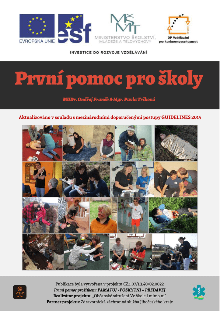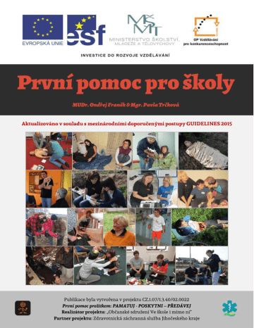 První pomoc pro školy MUDr. Ondřej Franěk & Mgr. Pavla Trčková Aktualizováno v souladu s mezinárodními doporučenými postupy GUIDELINES 2015 Publikace byla vytvořena v projektu CZ.1.07/1.3.40/02.0022 První pomoc prožitkem: PAMATUJ - POSKYTNI – PŘEDÁVEJ Realizátor projektu: „Občanské sdružení Ve škole i mimo ni“ Partner projektu: Zdravotnická záchranná služba Jihočeského kraje Obsah I. Úvodem ......................................................................................................................................................3 1. O publikaci První pomoc pro školy ............................................................................................................. 4 2. Vývoj první pomoci v historickém kontextu .......................................................................................... 6 II. O lidském těle ......................................................................................................................................... 9 1. Lidské tělo.............................................................................................................................................................. 10 2. Základy stavby těla............................................................................................................................................ 14 3. Základní životní funkce .................................................................................................................................. 18 4. Kosti, klouby, svaly a jejich funkce........................................................................................................... 24 5. Ostatní hlavní orgány a jejich funkce ......................................................................................................27 III. Systém zajištění neodkladné zdravotnické pomoci v ČR............................................................ 31 1. Systémové zajištění přednemocniční neodkladné péče v ČR ........................................................ 32 2. Tísňové linky a tísňové volání .................................................................................................................... 40 3. Telefonicky asistovaná první pomoc ....................................................................................................... 44 4. Sanitka odjela - co teď? ....................................................................................................................................47 5. Letecká záchranná služba ............................................................................................................................. 48 6. První pomoc z pohledu práva ...................................................................................................................... 51 7. Sociální problematika úrazů dětí ............................................................................................................... 57 8. Co znamená, když se řekne… ........................................................................................................................ 58 IV. Praktická část .......................................................................................................................................61 1. Místo úvodu ..........................................................................................................................................................62 2. Něco se stalo – co teď? ...................................................................................................................................... 63 3. Prvotní vyšetření a kontrola životních funkcí, druhotné vyšetření........................................... 65 4. Záchranářská Kámasútra aneb užitečné polohy ................................................................................ 68 5. Kolaps a bezvědomí: příčiny, rizika… a co dál? .................................................................................... 70 6. Resuscitace I: Bezvědomí s poruchou dýchání – náhlá zástava oběhu, resuscitace ............ 73 7. Resuscitace II: Dýchání z plic do plic, použití AED .............................................................................76 8. Bezvědomí s normálním dýcháním .......................................................................................................... 81 9. Srdeční záchvat ...................................................................................................................................................82 10. Problémy s dýcháním, dušení ..................................................................................................................... 84 11. Ochrnutí (bez spojitosti s úrazem)............................................................................................................. 88 12. Alergická reakce ................................................................................................................................................ 89 13. Záchvat křečí ........................................................................................................................................................ 91 1 14. Bolest břicha ......................................................................................................................................................... 93 15. Náhlá porucha chování, reakce na stres ................................................................................................ 94 16. Cukrovka, hypoglykemický záchvat ........................................................................................................ 96 17. Přehřátí a podchlazení.................................................................................................................................... 99 18. Da