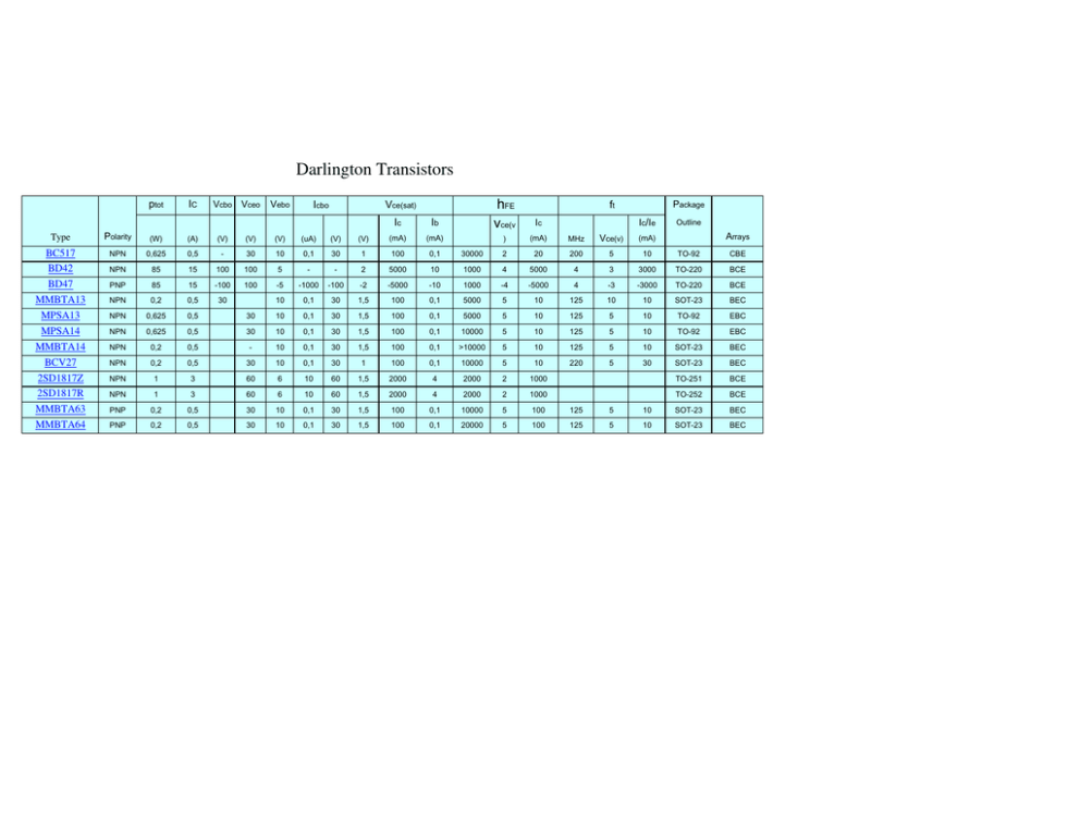Darlington Transistors ptot Type BC517 BD42 BD47 MMBTA13 MPSA13 MPSA14 MMBTA14 BCV27 2SD1817Z 2SD1817R MMBTA63 MMBTA64 IC Vcbo Vceo Polarity (W) (A) NPN 0,625 0,5 NPN 85 15 100 (V) Vebo Icbo Ic Ib hFE vce(v Ic (mA) (mA) ) (mA) MHz Vce(sat) (V) Package ft Ic/Ie Vce(v) Outline Arrays (mA) (V) (V) (uA) (V) - 30 10 0,1 30 1 100 0,1 30000 2 20 200 5 10 TO-92 CBE 100 100 5 - - 2 5000 10 1000 4 5000 4 3 3000 TO-220 BCE BCE PNP 85 15 -100 NPN 0,2 0,5 30 -5 -1000 -100 -2 -5000 -10 1000 -4 -5000 4 -3 -3000 TO-220 10 0,1 30 1,5 100 0,1 5000 5 10 125 10 10 SOT-23 NPN 0,625 0,5 BEC 30 10 0,1 30 1,5 100 0,1 5000 5 10 125 5 10 TO-92 EBC NPN 0,625 NPN 0,2 0,5 30 10 0,1 30 1,5 100 0,1 10000 5 10 125 5 10 TO-92 EBC 0,5 - 10 0,1 30 1,5 100 0,1 >10000 5 10 125 5 10 SOT-23 NPN BEC 0,2 0,5 30 10 0,1 30 1 100 0,1 10000 5 10 220 5 30 SOT-23 BEC NPN 1 3 60 6 10 60 1,5 2000 4 2000 2 1000 TO-251 BCE NPN 1 3 60 6 10 60 1,5 2000 4 2000 2 1000 TO-252 BCE PNP 0,2 0,5 30 10 0,1 30 1,5 100 0,1 10000 5 100 125 5 10 SOT-23 BEC PNP 0,2 0,5 30 10 0,1 30 1,5 100 0,1 20000 5 100 125 5 10 SOT-23 BEC Power Transistor Type 2SB772T 2SD882T 2SD882H 2SD882U-P BD135T BD137T BD139T H1061 13002T 13003T 13002L 13003L ST13003 13005 13007 13007 BC369 2SD1691T BD136T BD138T BD140T 2SB772U 2SD882U-P 2SA1012 BD909 BD911 BD910 BD912 2SD965U 2SB1332U 2SD1664U 2SA683 2SA684 2SB9435U TIP31C hFE ptot IC Vcbo Vceo Vebo Polarity (W) (A) (V) (V) (V) (uA) (V) (V) Ic(mA) Ib(mA) PNP 10 3 -40 30 -5 -1 -30 -0,5 -2000 -200 60-400 -2 -1000 80 -5 -100 TO-126 ECB NPN 1 3 40 30 5 1 30 0,5 2000 200 60-400 2 1000 90 5 100 TO-126 ECB Icbo Vce(sat) Package ft vce(v) Ic(mA) MHz Vce(v) Ic/Ie(mA) Outline Arrays NPN 1 3 60 30 5 1 60 0,5 2000 200 60-400 2 1000 90 5 100 TO-126 ECB NPN 36 4 120 100 6 100 120 0,8 2000 200 100-260 1 500 3 1 250 TO-126 ECB NPN 1,25 1,5 45 45 5 0,1 30 0,5 500 500 40-400 2 150 - - - TO-126 ECB NPN 1,25 1,5 60 60 5 0,1 30 0,5 500 500 40-400 2 150 - - - TO-126 ECB NPN 1,25 1,5 100 80 5 0,1 30 0,5 500 500 40-400 2 150 - - - TO-126 ECB NPN 25 3 50 50 4 100 20 1 2000 200 35-320 4 1000 8 4 500 TO-220 BCE NPN 1,4 1,5 - 300 9 - - 0,5 500 100 8-40 2 500 10 10 100 TO-126 ECB NPN 1,4 1,5 - 400 9 - - 0,5 500 100 8-40 2 500 10 10 100 TO-126 ECB NPN 1,15 1 600 400 9 0,1 600 0,8 500 100 10-70 10 100 - - - TO-92L ECB NPN 1,25 1,5 600 400 9 0,1 700 0,4 100 20 10-70 10 100 - - - TO-92L ECB NPN 1,5 1,5 600 400 9 0,1 600 1 1000 250 10-70 10 100 - - - TO-220 BCE NPN 2 4 - 400 9 - - 0,5 1000 200 10-60 5 1000 4 10 500 TO-220 BCE NPN 80 8 700 400 9 100 700 2 5000 1000 10-70 5 2000 4 10 500 TO-220 BCE NPN 80 8 700 400 9 100 700 2 5000 1000 10-70 5 2000 4 10 500 TO-220 BCE PNP 0,83 1 32 20 5 0,1 25 0,5 1000 100 85-375 1 500 40 5 10 TO-92 ECB NPN 1,3 8 60 60 7 10 50 0,3 2000 200 100-400 1 2000 - - - TO-126 ECB PNP 1,25 1,5 -45 45 -5 -0,1 -30 -0,5 -500 -50 40-400 -2 -150 - - - TO-126 ECB PNP 1,25 1,5 -60 60 -5 -0,1 -30 -0,5 -500 -50 40-400 -2 -150 - - - TO-126 ECB PNP 1,25 1,5 -100 80 -5 -0,1 -30 -0,5 -500 -50 40-400 -2 -150 - - - TO-126 ECB PNP 1 3 40 30 5 1 30 0,5 2000 200 60-400 2 1000 80 5 100 SOT-89 BCE NPN 1 3 40 30 5 1 30 0,5 2000 200 60-400 2 1000 90 5 100 SOT-89 BCE PNP 25 5 -60 50 -5 -1 -50 -0,4 -3000 -150 70-240 -1 -1000 60 -4 -1000 TO-220 BCE NPN 90 15 80 80 5 500 80 1 5000 500 40-250 4 500 3 4 500 TO-220 BCE NPN 90 15 100 100 5 500 100 1 5000 500 40-250 4 500 3 4 500 TO-220 BCE PNP 90 15 -80 80 -5 -500 -80 -1 -5000 -500 40-250 -4 -500 3 -4 -500 TO-220 BCE PNP 90 15 -100 100 -5 -500 -100 -1 -5000 -500 40-250 -4 -500 3 -4 -500 TO-220 BCE NPN 0,75 5 40 20 7 0,1 10 1 3000 100 230-600 2 500 150 6 50 SOT-89 BCE PNP 2 1 40 32 5 0,5 20 0,5 500 50 82-390 3 100 150 5 50 SOT-89 BCE NPN 2 1 40 32 5 0,5 20 0,4 500 50 82-390 3 100 150 5 50 SOT-89 BCE PNP 1 1 30 25 5 0,1 20 0,4 500 50 85-340 10 500 200 10 50 TO-92 ECB PNP 1 1 50 40 5 0,1 20 0,4 500 50 85-340 10 500 200 10 50 TO-92 ECB PNP 0,72 3 45 30 6 0,55 3000 300 110 1 1200 110 10 500 SOT-89 BCE NPN 2 3 100 100 5 1,2 3000 375 10-50 4 3000 3 10 500 TO-220 BCE 200 100 TIP32C 2SC4672 2SA1663U TIP31CR TIP32CR 2SC4672U PNP 2 3 100 100 5 200 100 1,2 300 375 10-50 4 3000 3 10 500 TO-220 BCE NPN 2 3 60 50 6 0,1 60 0,35 1000 50 82-270 2 500 210 2 500 SOT-89 BCE PNP 1 1,5 30 30 5 0,1 30 2 1500 30 100-320 2 500 120 2 500 SOT-89 BCE NPN 1 3 100 100 5 1,2 3000 375 10-50 4 3 3 10 500 TO-252 BCE PNP 1 3 100 100 5 1,2 3000 375 10-50 4 3 3 10 500 TO-252 BCE NPN 2 3 60 50 6 0,35 1000 50 82-270 1 500 210 5 500 SOT-89 BCE 0,1 60 NPN Silicon Epitaxial Planar Transistor hFE ptot IC Vcbo Vceo Vebo Type Polarity (W) (A) (V) (V) (V) (uA) (V) (V) Ic(mA) Ib(mA) 1702 NPN 0,6 1 30 25 5 0,1 20 0,7 500 50 132-476 1 100 100 5 10 TO-92 EBC 8050 NPN 0,625 0,8 40 25 6 0,1 35 0,5 500 50 70-380 1 100 100 5 10 TO-92 EBC 9011 NPN 0,4 0,03 50 30 5 0,1 50 0,3 10 1 28-198 5 1 370 5 1 TO-92 EBC 9013 NPN 0,625 0,8 - 30 5 0,1 31 0,5 500 20 110-380 1 50 100 5 10 TO-92 EBC 9014 NPN 0,45 0,1 50 45 5 0,05 50 0,6 100 5 60-1000 5 1 300 5 10 TO-92 EBC 9016 NPN 0,4 0,025 30 20 4 0,1 30 0,3 10 1 28-198 5 1 620 5 1 TO-92 EBC 9018 NPN 0,4 0,05 30 15 5 0,05 12 0,5 10 1 28-198 5 1 1100 5 5 TO-92 EBC Icbo Vce(sat) Package ft vce(v) Ic(mA) MHz Vce(v) Ic/Ie(mA) Outline Arrays 2N2222 NPN 0,625 0,6 60 30 5 0,01 50 0,4 150 15 100-300 10 150 250 20 20 TO-92 EBC 2N222A NPN 0,625 0,6 75 40 6 0,01 60 0,3 150 15 100-300 10 150 250 20 20 TO-92 EBC 2N3416 NPN 0,625 0,5 50 50 5 0,1 25 0,3 50 3 75-225 4,5 2 - - - TO-92 ECB 2N3417 NPN 0,625 0,5 50 50 5 0,1 25 0,3 50 3 180-540 4,5 2 - - - TO-92 ECB 2N3903 NPN 0,5 0,1 60 40 6 - - 0,2 10 1 50-150 1 10 250 20 10 TO-92 EBC 2N3904 NPN 0,5 0,1 60 40 6 - - 0,3 50 5 100-300 1 10 300 20 10 TO-92 EBC 2N4400 NPN 0,625 0,6 60 40 6 - - 0,4 150 15 50-150 1 150 200 10 20 TO-92 EBC 2N4401 NPN 0,625 0,6 60 40 6 - - 0,4 150 15 100-300 1 150 250 10 20 TO-92 EBC 2N5088 NPN 0,5 0,05 35 30 4,5 0,05 35 0,5 10 1 300-900 5 0,1 180 5 0,5 TO-92 EBC 2N5089 NPN 0,5 0,05 35 30 4,5 0,05 35 0,5 10 1 400-1200 5 0,1 180 5 0,5 TO-92 EBC 2N5550 NPN 0,625 0,6 160 140 6 0,1 10