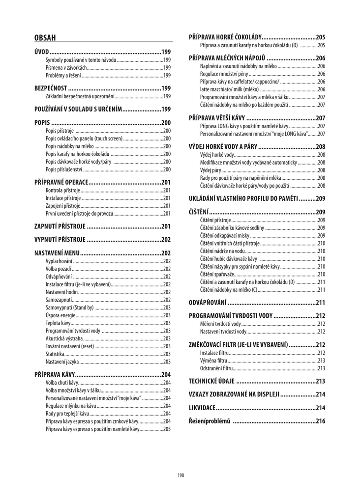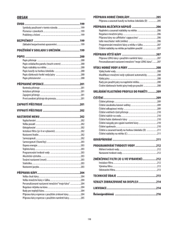 Obsah Příprava horké čokolády................................205 Příprava a zasunutí karafy na horkou čokoládu (D) . .............205 Úvod...................................................................199 Příprava mléčných nápojů..............................206 Symboly používané v tomto návodu......................................199 Písmena v závorkách..............................................................199 Problémy a řešení..................................................................199 Naplnění a zasunutí nádobky na mléko.................................206 Regulace množství pěny........................................................206 Příprava kávy na caffelatte/ cappuccino/ ..............................206 latte macchiato/ milk (mléko) . .............................................206 Programování množství kávy a mléka v šálku........................207 Čištění nádobky na mléko po každém použití .......................207 Bezpečnost........................................................199 Základní bezpečnostná upozornění........................................199 Používání v souladu s určením........................199 Příprava VĚTŠÍ kávy..........................................207 Popis..................................................................200 Příprava long kávy s použitím namleté kávy........................207 Personalizované nastavení množství “moje long káva”.........207 Popis přístroje .......................................................................200 Popis ovládacího panelu (touch screen).................................200 Popis nádobky na mléko........................................................200 Popis karafy na horkou čokoládu ...........................................200 Popis dávkovače horké vody/páry .........................................200 Popis příslušenství.................................................................200 VÝDEJ HORKÉ VODY A PÁRY...................................208 Výdej horké vody....................................................................208 Modifikace množství vody vydávané automaticky.................208 Výdej páry..............................................................................208 Rady pro použití páry na napěnění mléka..............................208 Čistění dávkovače horké páry/vody po použití . .....................208 Přípravné operace............................................201 Kontrola přístroje...................................................................201 Instalace přístroje..................................................................201 Zapojení přístroje...................................................................201 První uvedení přístroje do provozu.........................................201 Ukládání vlastního profilu do paměti...........209 Čištění................................................................209 Čištění přístroje......................................................................209 Čištění zásobníku kávové sedliny...........................................209 Čištění odkapávací misky.......................................................209 Čištění vnitřních částí přístroje...............................................210 Čištění nádrže na vodu...........................................................210 Čištění hubic dávkovače kávy ...............................................210 Čištění násypky pro sypání namleté kávy...............................210 Čištění spařovače...................................................................210 Čištění a zasunutí karafy na horkou čokoládu (D) ..................211 Čištění nádobky na mléko (C).................................................211 Zapnutí přístroje.............................................201 Vypnutí přístroje.............................................202 NASTAVENÍ MENU.................................................202 Vyplachování.........................................................................202 Volba pozadí..........................................................................202 Odvápňování . .......................................................................202 Instalace filtru (je-li ve vybavení)..........................................202 Nastavení hodin.....................................................................202 Samozapnutí..........................................................................202 Samovypnutí (Stand by)........................................................203 Úspora energie.......................................................................203 Teplota kávy...........................................................................203 Programování tvrdosti vody ..................................................203 Akustická výstraha.................................................................203 Tovární nastavení (reset)........................................................203 Statistika................................................................................203 Nastavení jazyka....................................................................203 Odvápňování.....................................................211 Programování tvrdosti vody..........................212 Měření tvrdosti vody..............................................................212 Nastavení tvrdosti vody..........................................................212 Změkčovací filtr (je-li ve vybavení).................212 Instalace filtru........................................................................212 Výměna filtru.........................................................................213 Odstranění filtru.........