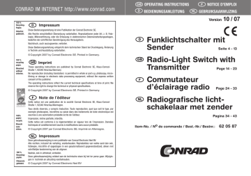 GB CONRAD IM INTERNET http://www.conrad.com 100 % RecyclingPapier. Chlorfrei gebleicht. D OPERATING INSTRUCTIONS BEDIENUNGSANLEITUNG NOTICE D’EMPLOI NL GEBRUIKSAANWIJZING Version D 10 / 07 Impressum Diese Bedienungsanleitung ist eine Publikation der Conrad Electronic SE. Alle Rechte einschließlich Übersetzung vorbehalten. Reproduktionen jeder Art, z. B. Fotokopie, Mikroverfilmung, oder die Erfassung in elektronischen Datenverarbeitungsanlagen, bedürfen der schriftlichen Genehmigung des Herausgebers. Nachdruck, auch auszugsweise, verboten. D Funklichtschalter mit Sender Seite 4 - 13 GB Radio-Light Switch with Transmitter Page 14 - 23 Diese Bedienungsanleitung entspricht dem technischen Stand bei Drucklegung. Änderung in Technik und Ausstattung vorbehalten. © Copyright 2007 by Conrad Electronic SE. Printed in Germany. 100 % recycling paper. Bleached without chlorine. GB Imprint These operating instructions are published by Conrad Electronic SE, Klaus-ConradStraße 1, 92240 Hirschau/Germany No reproduction (including translation) is permitted in whole or part e.g. photocopy, microfilming or storage in electronic data processing equipment, without the express written consent of the publisher. The operating instructions reflect the current technical specifications at time of print. We reserve the right to change the technical or physical specifications. F © Copyright 2007 by Conrad Electronic SE. Printed in Germany. F Note de l´éditeur Cette notice est une publication de la société Conrad Electronic SE, Klaus-ConradStraße 1, 92240 Hirschau/Allemagne. 100% papier recyclé. Blanchi sans chlore. Tous droits réservés, y compris traduction. Toute reproduction, quel que soit le type, par exemple photocopies, microfilms ou saisie dans des traitements de texte electronique est soumise à une autorisation préalable écrite de l`éditeur. Impression, même partielle, interdite. Cette notice est conforme à la règlementation en vigueur lors de l´impression. Données techniques et conditionnement soumis à modifications sans aucun préalable. © Copyright 2007 par Conrad Electronic SE. Imprimé en Allemagne. NL 100 % Recyclingpapier. Chloorvrij gebleekt. Impressum Deze gebruiksaanwijzing is een publikatie van Conrad Electronic Ned BV. Alle rechten, inclusief de vertaling, voorbehouden. Reprodukties van welke aard dan ook, fotokopie, microfilm of opgeslagen in een geautomatiseerd gegevensbestand, alleen met schriftelijke toestemming van de uitgever. Nadruk, ook in uittreksel, verboden. Deze gebruiksaanwijzing voldoet aan de technische eisen bij het ter perse gaan. Wijzigingen in techniek en uitrusting voorbehouden. © Copyright 2007 by Conrad Electronic Ned BV NL Commutateur d’éclairage radio Page 24 - 33 Radiografische lichtschakelaar met zender Pagina 34 - 43 Item-No. / No de commande / Best.-Nr./ Bestnr.: 62 05 87 standigheden uw toestel vernielen. Schakel de radiografische lichtschakelaar met zender niet direct in, maar laat het toestel eerst op kamertemperatuur komen. • U dient het gebruik van het toestel buiten een temperatuurbereik van 0°C tot +55°C te vermijden. D Einführung Sehr geehrter Kunde, wir bedanken uns für den Kauf des Funklichtschalters mit Sender • U mag het toestel niet te sterk belasten. • U mag het toestel niet blootstellen aan hoge temperaturen, sterke schokken of vochtigheid. U dient in ieder geval het contact met nattigheid te vermijden. • U mag de radiografische lichtschakelaar met zender niet in ruimtes of onder omstandigheden gebruiken waar brandbare gassen, dampen of stoffen aanwezig (kunnen) zijn. U dient in het belang van uw eigen veiligheid in ieder geval te vermijden dat de radiografische lichtschakelaar vochtig of nat wordt. Reiniging en onderhoud Indien blijkt dat het niet (meer) mogelijk is de radiografische lichtschakelaar met zender op een veilige manier te gebruiken, dient u het toestel buiten werking te stellen en onopzettelijk gebruik te voorkomen. Men mag ervan uitgaan, dat een veilig gebruik van de radiografische lichtschakelaar met zender niet (meer) mogelijk is, indien - het toestel duidelijke beschadigingen vertoont, - het toestel niet meer werkt en - na lange opslag onder ongunstige omstandigheden of Mit diesem Produkt haben Sie ein Gerät erworben, welches nach dem heutigen Stand der Technik gebaut wurde. Um diesen Zustand zu erhalten und einen gefahrlosen Betrieb sicherzustellen müssen Sie als Anwender diese Bedienungsanleitung beachten! Bestimmungsgemäße Verwendung Das Gerät ist als Schalter und Dimmer für 230V AC Verbraucher zu verwenden. Als Verbraucher sind ohmsche Lasten zulässig, die mit 230V Wechselspannung (AC) betrieben werden. Es dürfen nur Lampen mit einer Leistung von 40 bis 250Watt angeschlossen werden. Das Gerät ist für die Montage in Mauer- und Unterputz- und Hohlwand-Dosen vorgesehen. Der Betrieb/Montage ist ausschließlich in trockenen und geschlossenen Räumen, also nicht im Freien erlaubt, der Kontakt mit Wasser ist unbedingt zu vermeiden. Die Spannungsversorgung erfolgt über 230VAC 50Hz des öffentlichen Versorgungsnetzes. - na zware belastingen tijdens het transport. Bij het openen van afdekkingen of het verwijderen van onderdelen kunnen componenten blootgelegd worden die onder spanning staan. Aangesloten toestellen kunnen tevens onder spanning staan. U dient het toestel van de netspanning los te koppelen indi42 Eine andere Verwendung als zuvor beschrieben führt zur Beschädigung dieses Produkts. Darüber hinaus ist dies mit Gefahren, wie z.B. Kurzschluß, Brand, elektrischer Schlag, etc. verbunden. Das gesamte Produkt darf nicht geöffnet, geändert, bzw. umgebaut werden! 3 U mag de radiografische lichtschakelaar niet gebruiken indien het toestel geopend werd. U dient lege batterijen direct uit het toestel te verwijderen daar zelfs batterijen die tegen lekken beveiligd zijn kunnen corroderen en zo chemikaliën kunnen vrijkomen, die schadelijk zijn voor de gezondheid en het batterijcompartime