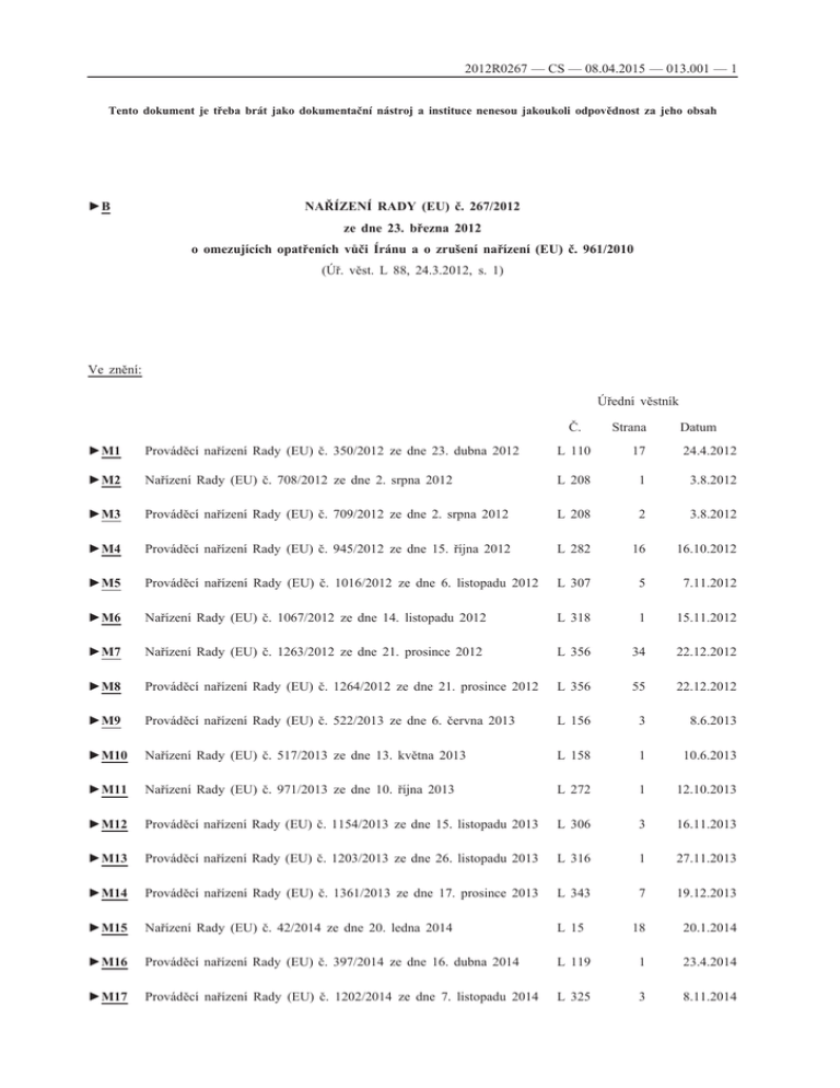 2012R0267 — CS — 08.04.2015 — 013.001 — 1 Tento dokument je třeba brát jako dokumentační nástroj a instituce nenesou jakoukoli odpovědnost za jeho obsah ►B NAŘÍZENÍ RADY (EU) č. 267/2012 ze dne 23. března 2012 o omezujících opatřeních vůči Íránu a o zrušení nařízení (EU) č. 961/2010 (Úř. věst. L 88, 24.3.2012, s. 1) Ve znění: Úřední věstník Č. Strana Datum ►M1 Prováděcí nařízení Rady (EU) č. 350/2012 ze dne 23. dubna 2012 L 110 17 24.4.2012 ►M2 Nařízení Rady (EU) č. 708/2012 ze dne 2. srpna 2012 L 208 1 3.8.2012 ►M3 Prováděcí nařízení Rady (EU) č. 709/2012 ze dne 2. srpna 2012 L 208 2 3.8.2012 ►M4 Prováděcí nařízení Rady (EU) č. 945/2012 ze dne 15. října 2012 L 282 16 16.10.2012 ►M5 Prováděcí nařízení Rady (EU) č. 1016/2012 ze dne 6. listopadu 2012 L 307 5 7.11.2012 ►M6 Nařízení Rady (EU) č. 1067/2012 ze dne 14. listopadu 2012 L 318 1 15.11.2012 ►M7 Nařízení Rady (EU) č. 1263/2012 ze dne 21. prosince 2012 L 356 34 22.12.2012 ►M8 Prováděcí nařízení Rady (EU) č. 1264/2012 ze dne 21. prosince 2012 L 356 55 22.12.2012 ►M9 Prováděcí nařízení Rady (EU) č. 522/2013 ze dne 6. června 2013 L 156 3 8.6.2013 ►M10 Nařízení Rady (EU) č. 517/2013 ze dne 13. května 2013 L 158 1 10.6.2013 ►M11 Nařízení Rady (EU) č. 971/2013 ze dne 10. října 2013 L 272 1 12.10.2013 ►M12 Prováděcí nařízení Rady (EU) č. 1154/2013 ze dne 15. listopadu 2013 L 306 3 16.11.2013 ►M13 Prováděcí nařízení Rady (EU) č. 1203/2013 ze dne 26. listopadu 2013 L 316 1 27.11.2013 ►M14 Prováděcí nařízení Rady (EU) č. 1361/2013 ze dne 17. prosince 2013 L 343 7 19.12.2013 ►M15 Nařízení Rady (EU) č. 42/2014 ze dne 20. ledna 2014 L 15 18 20.1.2014 ►M16 Prováděcí nařízení Rady (EU) č. 397/2014 ze dne 16. dubna 2014 L 119 1 23.4.2014 ►M17 Prováděcí nařízení Rady (EU) č. 1202/2014 ze dne 7. listopadu 2014 L 325 3 8.11.2014 2012R0267 — CS — 08.04.2015 — 013.001 — 2 ►M18 Nařízení Rady (EU) 2015/229 ze dne 12. února 2015 L 39 1 14.2.2015 ►M19 Prováděcí nařízení Rady (EU) 2015/230 ze dne 12. února 2015 L 39 3 14.2.2015 ►M20 Prováděcí nařízení Rady (EU) 2015/549 ze dne 7. dubna 2015 L 92 12 8.4.2015 Opraveno: ►C1 ►C2 ►C3 ►C4 ►C5 Oprava, Oprava, Oprava, Oprava, Oprava, Úř. Úř. Úř. Úř. Úř. věst. věst. věst. věst. věst. L L L L L 332, 4.12.2012, s. 31 (267/2012) 41, 12.2.2013, s. 14 (709/2012) 268, 10.10.2013, s. 18 (1264/2012) 93, 28.3.2014, s. 85 (267/2012) 216, 22.7.2014, s. 5 (267/2012) 2012R0267 — CS — 08.04.2015 — 013.001 — 3 ▼B NAŘÍZENÍ RADY (EU) č. 267/2012 ze dne 23. března 2012 o omezujících opatřeních vůči Íránu a o zrušení nařízení (EU) č. 961/2010 RADA EVROPSKÉ UNIE, s ohledem na Smlouvu o fungování Evropské unie, a zejména na článek 215 této smlouvy, s ohledem na rozhodnutí Rady 2012/35/SZBP ze dne 23. ledna 2012, kterým se mění rozhodnutí Rady 2010/413/SZBP o omezujících opatře ních vůči Íránu (1), s ohledem na společný návrh vysoké představitelky Unie pro zahraniční věci a bezpečnostní politiku a Evropské komise, vzhledem k těmto důvodům: (1) Rada dne 25. října 2010 přijala nařízení (EU) č. 961/2010 o omezu jících opatřeních vůči Íránu a o zrušení nařízení (ES) č. 423/2007 (2) s cílem provést rozhodnutí Rady 2010/413/SZBP (3). (2) Rada dne 23. ledna 2012 schválila rozhodnutí 2012/35/SZBP a stanovila další omezující opatření vůči Íránské islámské repub lice (dále jen „Írán“), jak požadovala Evropská rada dne 9. prosince 2011. (3) Tato omezující opatření zahrnují zejména další omezení obchodu se zbožím a technologiemi dvojího užití, jakož i klíčového zařízení a technologií, které by mohly být použity v petroche mickém průmyslu, zákaz dovozu íránské surové ropy, ropných produktů a petrochemických produktů a zákaz investic do petro chemického průmyslu. Rovněž je třeba zakázat obchod se zlatem, drahými kovy a diamanty s íránskou vládou, jakož i dodávání nově vytištěných bankovek a vyražených mincí íránské centrální bance nebo v její prospěch. (4) Rovněž je nutné provést určité technické změny stávajících opatření. Zejména definice „zprostředkovatelských služeb“ by měla být upřesněna. V případech, kdy může být příslušným orgánem povolen nákup, prodej, dodávání, převod nebo vývoz zboží a technologií nebo finančních a technických služeb, nebude vyžadováno samostatné povolení pro související zprostředkova telské služby. (1) Úř. věst. L 19, 24.1.2012, s. 23. (2) Úř. věst. L 281, 27.10.2010, s. 1. (3) Úř. věst. L 195, 27.7.2010, s. 39. 2012R0267 — CS — 08.04.2015 — 013.001 — 4 ▼B (5) Definice „převodu finančních prostředků“ by měla být rozšířena na neelektronické převody s cílem čelit pokusům o obcházení omezujících opatření (6) Revidovaná omezující opatření, která se týkají zboží dvojího užití, by se měla vztahovat na veškeré zboží a technologie uvedené v příloze I nařízení Rady (ES) č. 428/2009 ze dne 5. května 2009, kterým se zavádí režim Společenství pro kontrolu vývozu, přepravy, zprostředkování a tranzitu zboží dvojího užití (1), s výjimkou některého zboží v části 2 kategorie 5 zmíněné přílohy s ohledem na jeho využití ve veřejných komu nikačních službách v Íránu. Zákazy stanovené v článku 2 tohoto rozhodnutí se však nevztahují na prodej, dodávky, převod nebo vývoz zboží a technologií nově zařazených do příloh I nebo II tohoto nařízení, pro něž již příslušné orgány členských států vydaly povolení podle článku 3 nařízení (EU) č. 961/2010 před vstupem tohoto nařízení v platnost. (7) V zájmu zajištění účinného provádění 