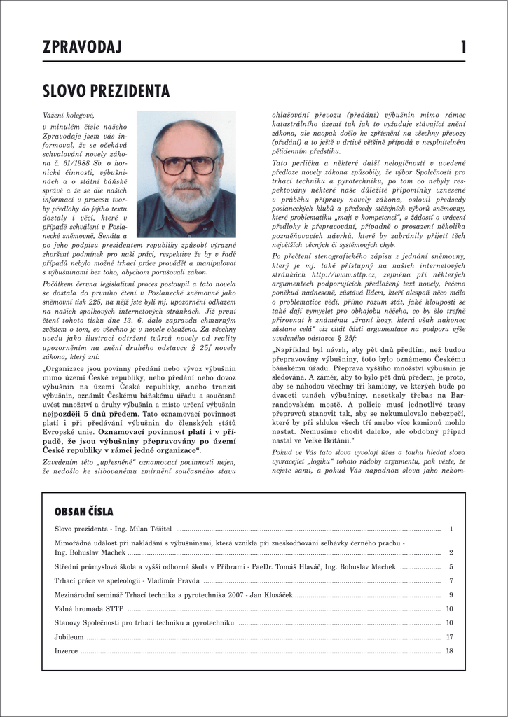1 ZPRAVODAJ SLOVO PREZIDENTA Vážení kolegové, v minulém čísle našeho Zpravodaje jsem vás informoval, že se očekává schvalování novely zákona č. 61/1988 Sb. o hornické činnosti, výbušninách a o státní báňské správě a že se dle našich informací v procesu tvorby předlohy do jejího textu dostaly i věci, které v případě schválení v Poslanecké sněmovně, Senátu a po jeho podpisu presidentem republiky způsobí výrazné zhoršení podmínek pro naši práci, respektive že by v řadě případů nebylo možné trhací práce provádět a manipulovat s výbušninami bez toho, abychom porušovali zákon. Počátkem června legislativní proces postoupil a tato novela se dostala do prvního čtení v Poslanecké sněmovně jako sněmovní tisk 225, na nějž jste byli mj. upozorněni odkazem na našich spolkových internetových stránkách. Již první čtení tohoto tisku dne 13. 6. dalo zapravdu chmurným zvěstem o tom, co všechno je v novele obsaženo. Za všechny uvedu jako ilustraci odtržení tvůrců novely od reality upozorněním na znění druhého odstavce § 25f novely zákona, který zní: „Organizace jsou povinny předání nebo vývoz výbušnin mimo území České republiky, nebo předání nebo dovoz výbušnin na území České republiky, anebo tranzit výbušnin, oznámit Českému báňskému úřadu a současně uvést množství a druhy výbušnin a místo určení výbušnin nejpozději 5 dnů předem. Tato oznamovací povinnost platí i při předávání výbušnin do členských států Evropské unie. Oznamovací povinnost platí i v případě, že jsou výbušniny přepravovány po území České republiky v rámci jedné organizace“. Zavedením této „upřesněné“ oznamovací povinnosti nejen, že nedošlo ke slibovanému zmírnění současného stavu ohlašování převozu (předání) výbušnin mimo rámec katastrálního území tak jak to vyžaduje stávající znění zákona, ale naopak došlo ke zpřísnění na všechny převozy (předání) a to ještě v drtivé většině případů v nesplnitelném pětidenním předstihu. Tato perlička a některé další nelogičností v uvedené předloze novely zákona způsobily, že výbor Společnosti pro trhací techniku a pyrotechniku, po tom co nebyly respektovány některé naše důležité připomínky vznesené v průběhu přípravy novely zákona, oslovil předsedy poslaneckých klubů a předsedy stěžejních výborů sněmovny, které problematiku „mají v kompetenci“, s žádostí o vrácení předlohy k přepracování, případně o prosazení několika pozměňovacích návrhů, které by zabránily přijetí těch největších věcných či systémových chyb. Po přečtení stenografického zápisu z jednání sněmovny, který je mj. také přístupný na našich internetových stránkách http://www.sttp.cz, zejména při některých argumentech podporujících předložený text novely, řečeno poněkud nadneseně, zůstává lidem, kteří alespoň něco málo o problematice vědí, přímo rozum stát, jaké hlouposti se také dají vymyslet pro obhajobu něčeho, co by šlo trefně přirovnat k známému „žraní kozy, která však nakonec zůstane celá“ viz citát části argumentace na podporu výše uvedeného odstavce § 25f: „Například byl návrh, aby pět dnů předtím, než budou přepravovány výbušniny, toto bylo oznámeno Českému báňskému úřadu. Přeprava vyššího množství výbušnin je sledována. A záměr, aby to bylo pět dnů předem, je proto, aby se náhodou všechny tři kamiony, ve kterých bude po dvaceti tunách výbušniny, nesetkaly třebas na Barrandovském mostě. A policie musí jednotlivé trasy přepravců stanovit tak, aby se nekumulovalo nebezpečí, které by při shluku všech tří anebo více kamionů mohlo nastat. Nemusíme chodit daleko, ale obdobný případ nastal ve Velké Británii.“ Pokud ve Vás tato slova vyvolají úžas a touhu hledat slova vyvracející „logiku“ tohoto rádoby argumentu, pak vězte, že nejste sami, a pokud Vás napadnou slova jako nekom- OBSAH ÈÍSLA Slovo prezidenta - Ing. Milan Těšitel ........................................................................................................................................ 1 Mimořádná událost při nakládání s výbušninami, která vznikla při zneškodňování selhávky černého prachu Ing. Bohuslav Machek ................................................................................................................................................................. 2 Střední průmyslová škola a vyšší odborná škola v Příbrami - PaeDr. Tomáš Hlaváč, Ing. Bohuslav Machek ..................... 5 Trhací práce ve speleologii - Vladimír Pravda .......................................................................................................................... 7 Mezinárodní seminář Trhací technika a pyrotechnika 2007 - Jan Klusáček............................................................................ 9 Valná hromada STTP ................................................................................................................................................................. 10 Stanovy Společnosti pro trhací techniku a pyrotechniku ........................................................................................................ 10 Jubileum ...................................................................................................................................................................................... 17 Inzerce ......................................................................................................................................................................................... 18 2 petentnost a bezradnost, pak také patrně nejste daleko od pravdy. Ano lze pochopit, že tato novela, která vznik