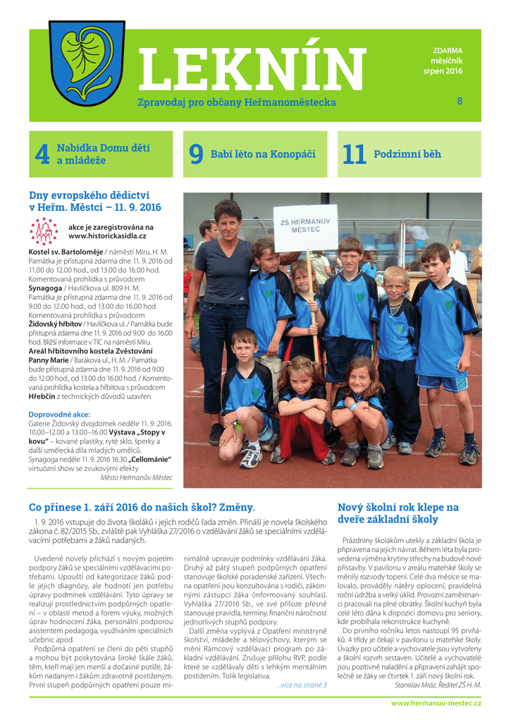 LEKNÍN ZDARMA měsíčník srpen 2016 8 Zpravodaj pro občany Heřmanoměstecka 4 Nabídka Domu dětí a mládeže 9 Babí léto na Konopáči 11 Podzimní běh Dny evropského dědictví v Heřm. Městci – 11. 9. 2016 akce je zaregistrována na www.historickasidla.cz Kostel sv. Bartoloměje / náměstí Míru, H. M. Památka je přístupná zdarma dne 11. 9. 2016 od 11.00 do 12.00 hod., od 13.00 do 16.00 hod. Komentovaná prohlídka s průvodcem Synagoga / Havlíčkova ul. 809 H. M. Památka je přístupná zdarma dne 11. 9. 2016 od 9.00 do 12.00 hod., od 13.00 do 16.00 hod. Komentovaná prohlídka s průvodcem Židovský hřbitov / Havlíčkova ul. / Památka bude přístupná zdarma dne 11. 9. 2016 od 9.00 do 16.00 hod. Bližší informace v TIC na náměstí Míru. Areál hřbitovního kostela Zvěstování Panny Marie / Barákova ul., H. M. / Památka bude přístupná zdarma dne 11. 9. 2016 od 9.00 do 12.00 hod., od 13.00 do 16.00 hod. / Komento‑ vaná prohlídka kostela a hřbitova s průvodcem Hřebčín z technických důvodů uzavřen Doprovodné akce: Galerie Židovský dvojdomek neděle 11. 9. 2016. 10.00–12.00 a 13.00–16.00 Výstava „Stopy v kovu“ – kované plastiky, ryté sklo, šperky a další umělecká díla mladých umělců. Synagoga neděle 11. 9. 2016 16.30 „Cellománie“ virtuózní show se zvukovými efekty Město Heřmanův Městec Co přinese 1. září 2016 do našich škol? Změny. 1. 9. 2016 vstupuje do života školáků i jejich rodičů řada změn. Přináší je novela školského zákona č. 82/2015 Sb., zvláště pak Vyhláška 27/2016 o vzdělávání žáků se speciálními vzdělá‑ vacími potřebami a žáků nadaných. Uvedené novely přichází s novým pojetím podpory žáků se speciálními vzdělávacími po‑ třebami. Upouští od kategorizace žáků pod‑ le jejich diagnózy, ale hodnotí jen potřebu úpravy podmínek vzdělávání. Tyto úpravy se realizují prostřednictvím podpůrných opatře‑ ní – v oblasti metod a forem výuky, možných úprav hodnocení žáka, personální podporou asistentem pedagoga, využíváním speciálních učebnic apod. Podpůrná opatření se člení do pěti stupňů a mohou být poskytována široké škále žáků, těm, kteří mají jen menší a dočasné potíže, žá‑ kům nadaným i žákům zdravotně postiženým. První stupeň podpůrných opatření pouze mi‑ nimálně upravuje podmínky vzdělávání žáka. Druhý až pátý stupeň podpůrných opatření stanovuje školské poradenské zařízení. Všech‑ na opatření jsou konzultována s rodiči, zákon‑ nými zástupci žáka (informovaný souhlas). Vyhláška 27/2016 Sb., ve své příloze přesně stanovuje pravidla, termíny, finanční náročnost jednotlivých stupňů podpory. Další změna vyplývá z Opatření ministryně školství, mládeže a tělovýchovy, kterým se mění Rámcový vzdělávací program po zá‑ kladní vzdělávání. Zrušuje přílohu RVP, podle které se vzdělávaly děti s lehkým mentálním postižením. Tolik legislativa. ...více na straně 3 Nový školní rok klepe na dveře základní školy Prázdniny školákům utekly a základní škola je připravena na jejich návrat. Během léta byla pro‑ vedena výměna krytiny střechy na budově nové přístavby. V pavilonu v areálu mateřské školy se měnily rozvody topení. Celé dva měsíce se ma‑ lovalo, prováděly nátěry oplocení, pravidelná roční údržba a velký úklid. Provozní zaměstnan‑ ci pracovali na plné obrátky. Školní kuchyň byla celé léto dána k dispozici domovu pro seniory, kde probíhala rekonstrukce kuchyně. Do prvního ročníku letos nastoupí 95 prvňá‑ ků. 4 třídy je čekají v pavilonu u mateřské školy. Úvazky pro učitele a vychovatele jsou vytvořeny a školní rozvrh sestaven. Učitelé a vychovatelé jsou pozitivně naladění a připraveni zahájit spo‑ lečně se žáky ve čtvrtek 1. září nový školní rok. Stanislav Mráz, Ředitel ZŠ H. M. www.hermanuv-mestec.cz LEKNÍN Zpravodaj pro občany Heřmanoměstecka Z jednání Rady města Jednání RM dne 27. 7. 2016 Usnesení č. R/2016/291 RM bere na vědomí předkládanou kontrolu usnesení a její plnění a schvaluje prodloužení termínu pro splnění usnesení R/2016/135 do 31. 8. 2016. Usnesení č. R/2016/292 RM bere na vědo‑ mí zápis z jednání Kulturní komise ze dne 28. 6. 2016. Usnesení č. R/2016/293 RM schvaluje ukonče‑ ní nájemní smlouvy na pozemky parcelní číslo 329 a parcelní číslo 330 k. ú. Vyžice a na proná‑ jem hájenky na adrese Slavkovice 71 s paní Pet‑ rou Horkou k 31. 8. 2016 a vyvěsit záměr na pro‑ nájem hájenky včetně pozemků p. č. 329 a 330. Usnesení č. R/2016/294 RM bere na vědomí protokol z jednání hodnotící komise na veřejnou zakázku „Chodník v Chotěnicích“ a rozhoduje o o zrušení veřejné zakázky „Chodník v Chotě‑ nicích“ z důvodu, že cenové nabídky přesahují částku vyhrazenou v rozpočtu města a ukládá zajistit vypsání nové veřejné zakázky „Chodník v Chotěnicích“ s rozdělením realizace na etapy. Usnesení č. R/2016/295 RM bere na vědomí protokol z jednání hodnotící komise na veřej‑ nou zakázku „Stavební úpravy hřbitovní zdi“ a rozhoduje o uzavření smlouvy na veřejnou zakázku „Stavební úpravy hřbitovní zdi“ se spo‑ lečností SOSTAF, s. r. o. Usnesení č. R/2016/296 RM bere na vědomí protokol z jednání hodnotící komise na veřejnou zakázku „Čekárna Radlín“ a rozhoduje o uzavření smlouvy o dílo na veřejnou zakázku „Čekárna Radlín“ s panem Jaroslavem Novotným. Usnesení č. R/2016/297 RM schvaluje smlou‑ vu č. SMLM 397/1215/MS/44/2016 se Správou a údržbou silnic Pardubického kraje o podmín‑ kách zřízení stavby elektrického vedení veřejné‑ ho osvětlení v Havlíčkově 