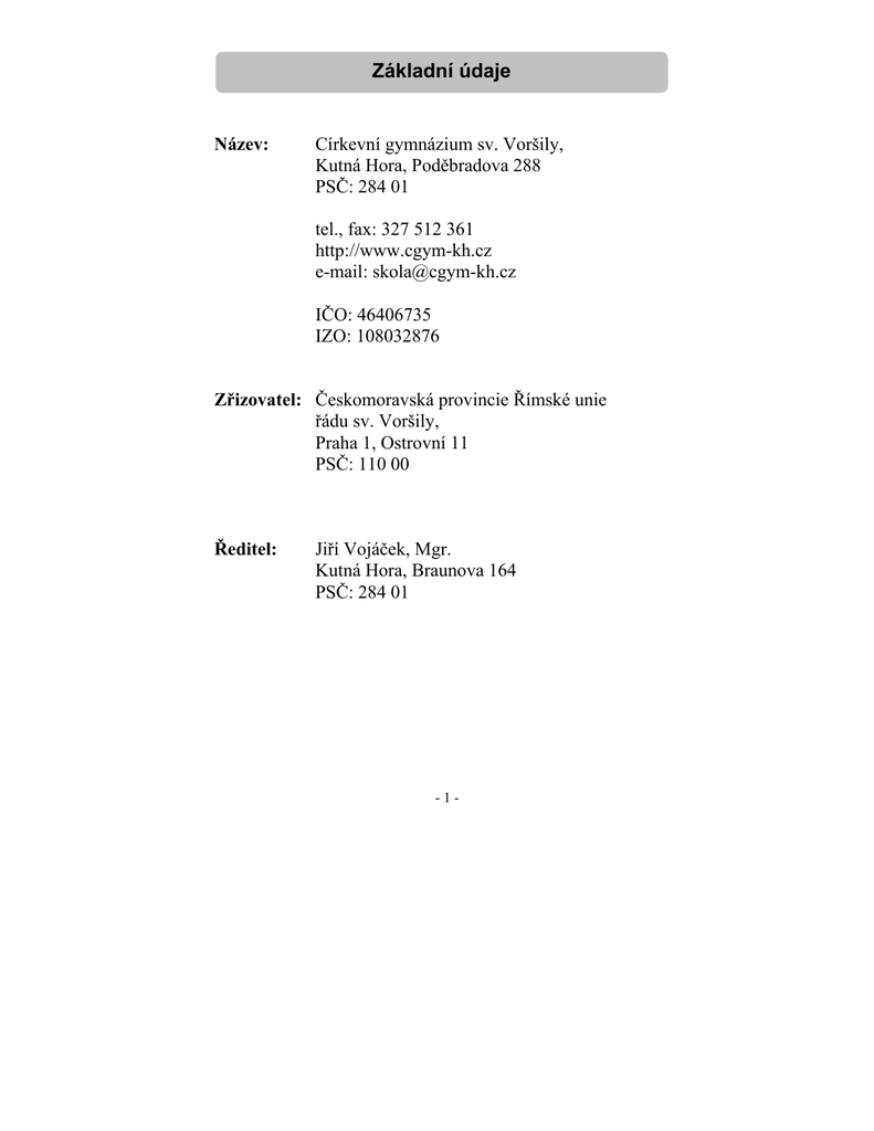 Základní údaje Název: Církevní gymnázium sv. Voršily, Kutná Hora, Poděbradova 288 PSČ: 284 01 tel., fax: 327 512 361 http://www.cgym-kh.cz e-mail: [email protected] IČO: 46406735 IZO: 108032876 Zřizovatel: Českomoravská provincie Římské unie řádu sv. Voršily, Praha 1, Ostrovní 11 PSČ: 110 00 Ředitel: Jiří Vojáček, Mgr. Kutná Hora, Braunova 164 PSČ: 284 01 -1- Charakteristika školy Gymnázium je zřízeno jako osmileté se zaměřením všeobecným a s profilací studentů podle jejich zájmu ve vyšších ročnících formou povinně volitelných předmětů. Připravuje studenty ke studiu na vysokých školách a klade si za cíl působit na ně i po stránce výchovné. Vede k toleranci, úctě k lidským právům a rozvíjí a kultivuje vztah studentů k jiným lidem a k Bohu v duchu zásad voršilské pedagogiky. Vztah mezi školou a řádem sv. Voršily se uskutečňuje také personálně. Sestry se podílejí na výuce a jedna sestra má funkci zástupkyně zřizovatele ve vztahu ke škole. Požadavky na uchazeče: Úspěšné složení přijímacích zkoušek, zájem o studium, otevřenost pro duchovní hodnoty, smysl pro práci v kolektivu. Učební plán: Na Církevním gymnáziu sv. Voršily se ve školním roce 2001/2002 vyučovalo dle učebních plánů, které schválilo Ministerstvo školství mládeže a tělovýchovy České republiky pod č.j. 20 594/99-22 dne 5.5.1999. -2- Výsledky vzdělávání Typ školy: osmileté gymnázium 79-41-K/801 Třída prima sekunda tercie kvarta kvinta sexta septima oktáva Celkem Počet žáků 26 26 22 24 19 19 22 21 179 Prospělo s vyznamenáním 9 6 4 5 5 3 4 11 47 Prospělo Opr./dopl. zkoušky 17 0 19 1 18 0 19 0 12 2 15 1 16 2 10 0 127 5 Sníž. stupeň z chování 0 0 0 0 0 0 0 0 0 Výsledky maturitních zkoušek Třída Počet žáků oktáva 21 Prospělo s vyznamenáním 9 -3- Prospělo Neprospělo 12 0 Učební plán Předmět Český jazyk a literatura Cizí jazyk 1 Cizí jazyk 2 Latina Základy společ. věd Dějepis Zeměpis Matematika Deskriptivní geometrie Fyzika Chemie Biologie / geologie Informatika Estetická výchova Tělesná výchova Vol. předmět 1 Vol. předmět 2 Vol. předmět 3 Vol. předmět 4 Nepovinné předměty Náboženství Informatika I. 5 II. 4 III. 4 4 3 3 2 2 2 2 5 2 CELKEM Ročník IV. V. 4 3 VI. 3 VII. VIII. 3 3 3 3 2 2 3 3 3 3 3 3 2 3 3 2 2 2 2 2 2 2 5 2 2 5 2 2 3 2 2 3 2 2 3 2 3 3 2 2 2 2 2 2 2 2 2 2 2 4 2 2 2 2 1 2 2 2 2 2 4 2 2 2 2 2 2 2 2 2 2 2 2 2 1 2 1 2 1 1 1 30 30 31 31 31 2 2 2 2 2 2 2 2 2 1 1 1 31 31 31 Volitelné předměty: Seminář z českého jazyka, matematiky, fyziky, chemie, biologie, estetické výchovy, zeměpisu; Konverzace z německého a anglického jazyka; Základy administrativy. Tyto předměty si studenti volí podle svého budoucího profesního nebo studijního zaměření tak, aby celkový součet vyučovacích hodin byl 31 za týden. -4- Pedagogický sbor a zaměstnanci školy Pedagogický sbor: Vojáček Jiří Benešová Věra Bouma David Eliášová Romana Francová Eva Fuková Magdaléna Habartová Alena Hartmanová Eva Havlová Ludmila (sestra Kateřina OSU) Jelínková Jitka Kašparová Helena King Philippa Kotyzová Beata Licek Zdeněk Lisková Stanislava Musílek Luboš Nechvílová Alžběta Němcová Anna Poživil Josef Suková Martina Šuláková Miriam Tobek Pavel Vojáčková Jaroslava Vopařil Karel Mgr. Mgr. Mgr. Mgr. Mgr. Mgr. Mgr. MUDr.,Mgr. ak. mal. Mgr. Mgr. PhDr. RNDr. PhDr. Mgr. Mgr., Ing. Mgr. Mgr. Mgr. Mgr. Mgr. Ostatní zaměstnanci: Hlavinková Zdeňka Hlavinka Jiří Krčíková Květuše Stryhal Tomáš Truncová Jitka ředitel školy M, F Nj Ke, Náb, Tv Cj, Aj Cj, Fj Aj M Cj, Vv, D Bi, Ke Vv ZA Aj Hv Hv Nj Ch Cj, , Vv Z, D Ke, Bi, Tv Ivt F D M, Tv zástupce ředitele Bi, Ch, Tv ekonom školník úklid školy asistent ředitele úklid školy -5- Aprobace M–F Cj – Nj Ke, Náb Cj – Aj Cj – Fj M Cj – Vv Ke Vv Cj – Hv Rj – Hv Bi – Ch Cj – L Z–D Ke M – Ivt F – ZT Ke M – ZT Bi – Ch Studenti školy PRIMA SEKUNDA TERCIE KVARTA Petr Aubrecht Michael Buban Andrea Bucifalová Lucie Bulánková Ladislav Ciner Katarína Drabešová Anežka Eliášová Antonín Grenar Anežka Cinerová Martin Cissé Tomáš Černý Tomáš Dejmal Ondřej Ďoubal Olexandra Hartová Ondřej Havlík Michala Hlavačková Veronika Holá Markéta Balánová Veronika Burešová Dominika Darebná Jiří Dejmal Petr Grenar Ondřej Hečl Josef Hylský Naďa Chramostová Kamil Brabec Lucie Drábková Michal Duspiva Marie Duhintsová Jan Ďoubal Tereza Fialová Tomáš Grenar Petr Hanzel Šárka Kořínková Marek Hynek Tomáš Charvát Filip Jeřábek Jiří Kadlec Kristýna Kopčíková Eliška Kratochvílová Libor Krycner Vendula Kuttová Vojtěch Jeřábek Barbora Kafková Ondřej Korábek Darius Kryszczuk Pavel Kurc Zdeňka Králová Jakub Krupička Iva Kuchařová Václav Kunášek Martin Menšík Štěpánka Horníčková Michal Charvát Stanislav Jelínek Věra Klatková Jan Krupička Markéta Křečková Jakub Lukeš Marek Michna Michala Pařízková Michaela Marková Jan Michal Vojtěch Neřold David Panas Alžběta Mašínová Josef Poživil Jan Rezler Tomáš Slavíček Klára Nechvílová Lukáš Osmančík Marin Pařízek Michaela Slaninková Tomáš Stříbrský Jakub Šťástka Lucie Telecká Monika Větrovská Simona Vítková Jan Hlavinka Kristýna Sovová Olga Svobodová Josef Veselý Jan Zadražil Lucie Zadražilová Studentů: 26 Třídní: PhDr. A. Nechvílová Studentů: 26 Třídní: Mgr. M. Šuláková Tomáš Polenský Barbora Procházková Anna Svobodová Romana Rousová Markéta Táborská Lukáš Seifert Petr Vobořil Monika Sovová Monika Vobořilová Martin Šíma Aneta Zvolánková Kateřina Telecká Jana Trnková Simona Vepřeková Studentů: 22 Třídní: Mgr. E. Hartmanová Studentů: 24 Třídní: Mgr. J. Vojáčková -6- Studenti školy KVINTA SEXTA SEPTIMA OKTÁVA Jan Bigas Klára Cine