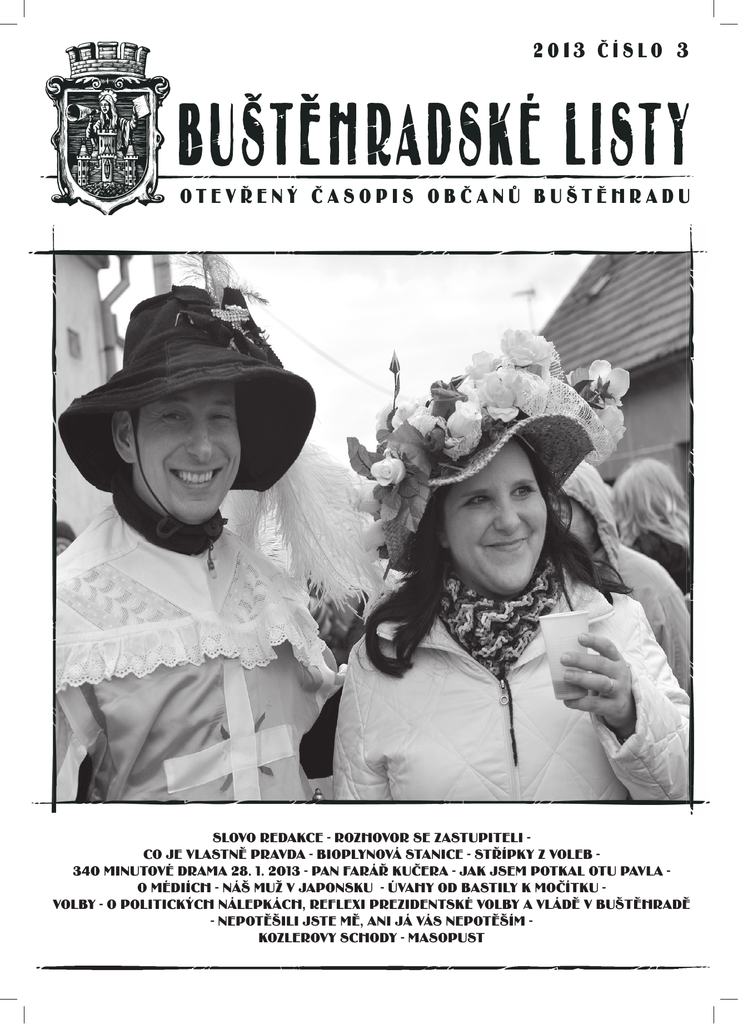 2 0 13 2 c i s l o 03 OTEVRENY CASOPIS OBCANU BUSTEHRADU SLOVO REDAKCE - ROZHOVOR SE ZASTUPITELI CO JE VLASTNĚ PRAVDA - BIOPLYNOVÁ STANICE - STŘÍPKY Z VOLEB 340 MINUTOVÉ DRAMA 28. 1. 2013 - PAN FARÁŘ KUČERA - JAK JSEM POTKAL OTU PAVLA O MÉDIÍCH - NÁŠ MUŽ V JAPONSKU - ÚVAHY OD BASTILY K MOČÍTKU VOLBY - O POLITICKÝCH NÁLEPKÁCH, REFLEXI PREZIDENTSKÉ VOLBY A VLÁDĚ V BUŠTĚHRADĚ - NEPOTĚŠILI JSTE MĚ, ANI JÁ VÁS NEPOTĚŠÍM KOZLEROVY SCHODY - MASOPUST 2 0 1 3 , Č Í S LO 3 ST R A N A 1 SLOVO REDAKCE Vážení čtenáři, Vážení čtenáři Buštěhradských listů, přáli bychom si, abyste měli stále dobrou náladu a obsah našeho časopisu vás osvěžil a pobavil. Je to naším cílem. Na druhou stranu si chceme všímat všech událostí, které se týkají Buštěhradu, ačkoliv někdy nejsou povzbudivé a nastavují zrcadlo některým oficiálním informacím, za kterými často občan nepostihne pozadí nebo reálnou skutečnost. Žijeme v demokratické společnosti, a tak se přirozeně nevyhneme různým pohledům na záležitosti, které se nás dotýkají. Věříme, že s informacemi, které veřejnosti předkládáme, naložíte podle vlastních zkušeností a uděláte si vlastní názor. Naším dalším cílem je totiž předkládat i ne příliš pozitivní zprávy, protože takový je bohužel reálný život. S přáním hezkého dne vaše RR Vaše finanční příspěvky na vydání Buštěhradských listů můžete posílat na číslo našeho bankovního účtu: 2200312227 / 2010. Potvrzení o předání daru vám na požádání vystaví občanské sdružení Buštěhradské fórum. Buštěhradské listy můžete také nalézt na www.bustehradskeforum.cz . V tištěné podobě do vyčerpání zásob v Hotelu Buštěhrad, U Bečvářů nebo v knihovně. Co je vlatně pravda? Na náš nový časopis jsme zaznamenali řadu reakcí. Většina jich byla kladných – čtenáři jsou rádi, že vzniklo něco nového, co zároveň navazuje na tradici starého Buštěhradského zpravodaje, neboť v novém městském bulletinu toho moc ke čtení není. Jsou rádi, že si někde mohou přečíst informace nezávislé na oficiální interpretaci, že v Buštěhradských listech nacházejí oblíbené rubriky, aktuální komentáře, kulturní zprávy, inspirativní články pana kronikáře, fiktivní rozhovory s Dušanem Spiritem, glosy „buštěhradského chodce“ a další literárně společenské pokusy o vystižení mnohovrstevnaté skutečnosti života v našem městě. Dále máme také negativní ohlasy – například místostarosta Oplt tvrdí, že nikomu z jeho okolí se Listy nelíbí, že se v nich uveřejňují pomluvy, že články pokračují v napadání, které se prý dělo v posledních měsících na stránkách „starého“ Buštěhradského zpravodaje. Nicméně reagovat a uvést věci na pravou míru nechce. A zaznamenali jsme také jeden velmi pozoruhodný ohlas, pro dnešní 2 0 1 3 , Č Í S LO 3 dobu zřejmě charakteristický: někteří občané navštěvující ordinaci místního lékaře si stěžují sestře, zastupitelce Mrázkové, že nevědí, co je pravda, jestli to, co se píše v Buštěhradských listech, anebo to, co je v Buštěhradském zpravodaji. Prý v tom mají zmatek a nevědí, čemu mají věřit! To je nám tedy opravdu líto. Zde je na místě úvaha o svobodě slova, přístupu k informacím a vytváření si vlastního názoru. Protože bych to lépe neformulovala, budu citovat novináře, dramatika a spisovatele Karla Hvížďalu: „Noviny byly založeny v roce 1605, u nás je začal vydávat Kramerius v roce 1791… Cenzura v Anglii byla zrušena v roce 1695, u nás v roce 1989. Přístup všech občanů k informacím o státní správě byl ve Švédsku zaručen zákonem přijatým na konci 18. století, u nás o 200 let později, a dodnes se nedodržuje. Zpoždění není v desetiletích, ale staletích, a je naivní čekat, že se to dá dohnat za 20 let.“ K tomu bych dodala, že ještě v roce 2012 je v Buštěhradě možné, aby se vedení města pokusilo o cenzuru místního časopisu tím, že jej „z úsporných důvodů inovuje“, a tím se zbaví nepříjemných příspěvků, ale i redaktorů píšících příliš otevřeně a kriticky. A tento pokus by bezpochyby vyšel, kdyby redaktoři nebyli paličatí a nereagovali založením vlastního časopisu. Mimochodem, podle informací a průzkumů, na jejichž podkladě byla vytvořena novela tiskového zákona (která určuje povinně třetinu prostoru v obecním tisku názorům opozice, a která čeká na schválení), má snahy vytěsnit kritické příspěvky nadpoloviční většina obecních samospráv. Zřejmě neblahé dědictví minulého režimu – bývalí komunisté ve vedeních obcí dělají jen to, co dělali celý život, protože jinak to neumí. A kde je tedy ta pravda? Časopis Buštěhradské listy nijak neaspiruje na to, aby byl „jediný Pravdivý a Vševědoucí“. Vše, co zde uveřejňujeme, píšeme na základě dostupných faktů, maximálně se snažíme o objektivitu, přičemž osobnost a názorová orientace píšícího se v textu vždy zákonitě projeví také. Je na čtenáři, aby dostupné informace kriticky vyhodnotil a vytvořil si vlastní NÁZOR. Opět cituji Karla Hvížďalu: „…děti by se měly vychovávat ke kritickému myšlení ... lidé by měli pochopit, že důležité není, co se píše v novinách, ale co si o dané věci myslí sami – s použitím inforST R A N A 2 mací z médií, s odkazem na vlastní zkušenosti a díky studiu a vyhledávání dalších informací. NÁZOR JE PRÁCE, KTERÁ VYŽADUJE NAMÁHAVOU SPOLUÚČAST. A je rozdíl mezi názorem a míněním. Názor musí být podložen vlastní analýzou, mínění je jen domněnka, pocit, vágní tušení. Každému názoru musí předcházet analýza a syntéza, kterou za vás nikdo jiný neudělá.