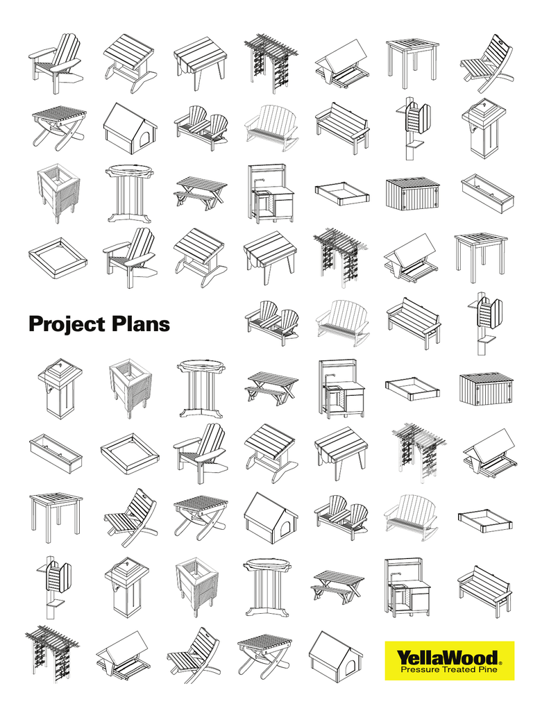 o o o o o o o o o o o o o o o o o o o o o o o o o o o o o o o o Project Plans o o o o o o o o o o o o o o o o o o o o o o o o o o o o o o o o o o o o o o o o o o o o o o o o o o o o o o o o o o o o o o o o Table of Contents Adirondack Chair Arbor Cocktail Table Daytripper Table MORE PLANS AT www.yellawood.com 5 20 65 90 10 Adirondack Footstool Big Green Egg Table Corn Hole Dog House 25 72 96 FIND A DEALER www.yellawood.com/dealers Adirondack Table Bird Feeder Daytripper Chair 15 58 84 104 Double Adirondack Chair ©Great Southern Wood Preserving, Inc. 2 Table of Contents 117 Double Rocker Garden Bench 179 199 Multi-Purpose Stand 126 Dream Dog House 186 Hose Holder 205 Picnic Table 157 Freestanding Hammock 193 Hummingbird Feeder 211 Planter Box o o o o o o o o o o o o o o o o o o o o o o o o o o o o o o o o Play Set 216 MORE PLANS AT www.yellawood.com Potting Bench 262 FIND A DEALER www.yellawood.com/dealers 269 Raised Veggie Bed ©Great Southern Wood Preserving, Inc. 3 Sandbox 273 Window Box 279 285 Fastener & Hardware Information 286 Important Information *All photos by Eliza Stoll MORE PLANS AT www.yellawood.com FIND A DEALER www.yellawood.com/dealers ©Great Southern Wood Preserving, Inc. 4 Adirondack Chair There are many variations of the classic adirondack chair. This particular version features straightforward construction and common materials. This chair makes for a satisfying project that can be built and finished in one weekend. And when properly finished, it will provide years of comfortable seating. BUILD TIME Cutting parts: 1 – 2 hours Assembly: 1 – 2 hours Finishing: 2 hours Total: 4 – 6 hours MORE PLANS AT www.yellawood.com FIND A DEALER www.yellawood.com/dealers ©Great Southern Wood Preserving, Inc. 5 Adirondack Chair TOOLS A Miter saw (or hand or circular saw) Table saw Jig saw (or hand or circular saw) Drill/driver 18 " drill bit Clamps Damp rag to wipe up excess glue X2 B X2 C X6 SUPPLIES (4) 1 x 4 x 8' (2) 1 x 8 x 8' (1) 2 x 4 x 10' 1 ¼" deck screws 2" deck screws 3" deck screws Waterproof wood glue D X1 E X2 CUT LIST A B C D E F G H I J K (2) (2) (6) (1) (2) (2) (2) (2) (2) (1) (2) F ¾ x 7 ¼ x 36" 1 ½ x 3 ½ x 21 ½" ¾ x 3 x 23" ¾ x 6 x 36" ¾ x 3 x 34" ¾ x 3 x 32" ¾ x 3 x 17" 1 ½ x 3 ½ x 21" ¾ x 7 ¼ x 30" 1 ½ x 3 ½ x 26" ¾ x 2 x 5" X2 G X2 H X2 I J K MORE PLANS AT www.yellawood.com FIND A DEALER www.yellawood.com/dealers X2 ©Great Southern Wood Preserving, Inc. 6 Adirondack Chair F E D I G J I B A H C B K A 2” H 5” Braces Arm detail 1 1/2” 4” 3” 2 1/2” 1 1/2” (H) (J) I 45 0 (K) 1 1/2” 19” 15” (Save this cutout to make piece K) A 90 8” MORE PLANS AT www.yellawood.com (B) (B) 3” Back leg detail FIND A DEALER www.yellawood.com/dealers ©Great Southern Wood Preserving, Inc. 7 Adirondack Chair BUILDING STEPS 01 Cut the back legs (A) to length and lay out and cut the angles according to the detail drawing. Use a jig saw or circular saw and guide to make smooth, straight cuts. Note which cutout pieces you will be saving to make braces later on. Lay out where seat stretchers (B) will be attached according to detail drawing. Drill pilot holes. 02 Cut seat stretchers (B) to length and attach to back legs according to layout marks with 2" screws. 03 Cut arms (I) to length and mark where back support (J), front legs (H) and braces (K) will be attached according to detail drawing. Drill 8 " pilot holes. 04 Clamp back support (J) in place and attach with 2" deck screws. Trim two of the cutout pieces from back legs to make braces (K) according to detail drawing, and attach them and front legs (H) to the underside of the arms where noted with 3" deck screws. 05 Measure up from the bottom of both front legs and mark 16". Clamp back leg/stretcher assembly to the front leg arm assembly, keeping the top of the back legs at the 16" mark and the front edge of the back legs flush with the front edge of the front legs. Attach with 2" deck screws. MORE PLANS AT www.yellawood.com FIND A DEALER www.yellawood.com/dealers ©Great Southern Wood Preserving, Inc. 8 Adirondack Chair BUILDING STEPS 06 Cut all other pieces to lengths according to cut list. Lay out your back slats (D, E, & F) with the best sides facing down and ¼" spacers between each slat. Use a straightedge along the bottoms to help with alignment. Drill pilot holes in back stretchers (G) and attach to the back of the slats. Attach bottom edge of the bottom stretcher 4" up from bottom of slats, and the second stretcher 16" up from that. 07 Set back slat assembly into place, with the bottom stretcher (G) resting on the back seat stretcher (B). With 2" screws attach through the slats (D, E, & F) into the seat stretcher (B) and back support (J). 08 Drill pilot holes in seat slats (C) and lay them out on the seat with ¼" spacers between each slat. Remove one arm assembly for drill clearance and drill pilot holes into the back legs through your slat pilot holes, then attach with 2" screws. Reattach arm assembly and repeat for other side. 09 Break all edges and sand all surfaces smooth before applying waterproof finish according to manufacturer instructions. MORE PLANS AT www.yellawood.com FIND A DEALER www.yellawood.com/dealers ©Great Southern Wood Preserving, Inc. 9 Adirondack Footstool Another piece of our Adirondack furniture suite is this stylish and easy to build footstool. With angles and lines that mimic the other two pieces, and a gentle angle on which to rest your feet, you can relax in comfort and satisfaction after building these pieces. With the same simple joinery techniques, coated screws and waterproof glue, this piece will also last for years of enjoyment. BUILD TIME Cutting parts: 1 – 2 hours Assembly: 1 hour Finishing: 2 hours Total: 4 – 5 hours MORE PLANS AT www.yellawood.com FIND A DEALER www.yellawood.com/dealers ©Great Southern Wood Preserving, Inc. 10 Adirondack Footstool A TOOLS Miter saw Table saw Drill/driver Jig saw 18 " drill bit Damp rag to wipe up excess g