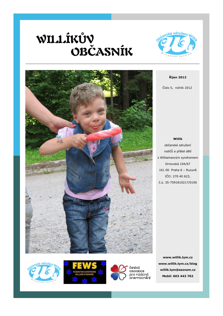 Willíkův občasník Říjen 2012 Číslo 5, ročník 2012 Willík občanské sdružení rodičů a přátel dětí s Williamsovým syndromem Drnovská 104/67 161 00 Praha 6 – Ruzyně IČO: 270 40 623, č.ú. 35-7591810217/0100 www.willik.tym.cz www.willik.tym.cz/blog [email protected] Mobil: 603 443 762 Strana 2 Willíkův občasník Slovo úvodem Váţení rodiče, milé děti, váţení příznivci o.s. Willík, ani se tomu nechce věřit, ale od vydání minulého čísla Willikova občasníku opět uplynul rok…. A byl to rok poměrně náročný, především díky tzv. sociální reformě, která odstartovala 1.1.2012. Nové zákony se ve svých důsledcích dotkly snad všech rodin vychovávajících dítě s Williamsovým syndromem, zejména na ně doplatily rodiny s malými dětmi, pro které představovalo zrušení souběhu rodi- čovského příplatku a příspěvku na péči a zrušení sociálního příplatku citelný zásah do rodinných financí. A to vůbec nemluvím o dalších změnách… Domníváme se, ţe je třeba zájmy našich rodin více hájit a podporovat, a proto jsme se na jaře tohoto roku stali členy nově vzniklé České asociace pro vzácná onemocnění. Snad se v rámci této organizace podaří definovat společné problémy pacientů s jednotlivými vzácnými diagnózami, ke kterým Williamsův syndrom patří, a snad se společným úsilím jednotlivých pacientských organizací začne dařit tyto obtíţe odstraňovat. Přeji pěkné čtení a hodně zdraví do dalšího roku. Hanka Kubíková Aktivity Willíka v uplynulém roce Říjen 2011: setkání rodin v Dětském středisku Březejc na Vysočině (9 rodin), proběhly semináře hostů z Institutu pro výzkum inkluzivního vzdělávání a přednáška MUDr. Neuschlové o publikovaných případech těhotenství u ţen s Williamsovým syndromem. s podporou grantu Úřadu vlády vyšla broţura s názvem Edukace dětí s Williamsovým syndromem — autorkou byla Martina Danišková, která příručku vytvořila v rámci své diplomové práce. Listopad 2011: ţádosti o granty a dotace - Nadace Dobré dílo sester Boromejek, Ministerstvo zdravotnictví, Úřad vlády a Nadace ČEZ . v listopadovém čísle časopisu Děti a my vyšel článek "Děti s Williamsovým syndromem bývají muzikální", kde o svých zkušenostech s výchovou dítěte s Williamsovým syndromem vyprávějí Jeřábkovi a Kratinovi. Leden 2012: Prosinec 2011: mikulášské setkání v Chýni s muzikoterapeutem Matějem Lipským. Setkání bylo zároveň i oslavou 5. výročí zaloţení o.s. Willík. v rámci poskytnutého grantu Pomozte dětem byl v liberecké MŠ Motýlek natáčen dokument České televize z cyklu Kde peníze pomáhají: Osobní asistence pro Bartoloměje. vysílání pořadu České televize Kde peníze pomáhají o občanském sdruţení Willík a o projektu osobní asistence pro Bartoloměje Hruše - první uvedení dokumentu shlédlo přes půl milionu diváků. Březen 2012: uspěli jsme v grantovém řízení Úřadu vlády na členství v Evropské federaci asociací Williamsova syndromu (FEWS) a na nové letáky o Williamsově syndromu v češtině a angličtině. Číslo 5, ročník 2012 Stránka 3 Duben 2012: Chýně, přednáška na téma Sociální reforma 2012, Lucie Koţnarová, DiS., odborná poradkyně Poradny pro osoby se zdravotním postiţením a seniory NRZP ČR. Květen 2012: dotace z Ministerstva zdravotnictví, která bude vyuţita na podporu rodin na setkáních v roce 2012. nový letáček o Williamsově syndromu. občanské sdruţení Willík se stalo členem nově vzniklé České asociace pro vzácná onemocnění (ČAVO). v rámci stránek Willíka vznikl blog, jehoţ cílem je zveřejňovat informace "odjinud", a o nejen týkající se Williamsova syndromu, ale i sociální reformy, problematiky mentálního postiţení, inkluzivního vzdělávání apod. jarní setkání Willíka v Soběšicích na Šumavě (11 rodin), na programu byla canisterapie a výroba hudebních nástrojů. benefiční koncert pro Willíka proběhl v Naší kavárně v Thomayerově nemocnici v Praze pod patronací Nadace Divoké husy. Účinkovaly skupiny Šestet a Tremoloboty (poděkování všem účinkujícím a hlavně Renému Inquortovi!) a také proběhl velmi úspěšný prodej výrobků členů našeho sdruţení. Výtěţek bude pouţit na letní rekondiční pobyt na Slovensku, zejména na zajištění muzikoterapie pro děti a podporu rodin. Nadace Divoké husy výtěţek z akce zdvojila. Výroční zpráva za rok 2011. Červenec 2012: účast na Veletrhu neziskových organizací (NGO market 2012). Srpen 2012: Červen 2012: připojili jsme se k "Projektu speciálních vzdělávacích potřeb dětí a ţáků se vzácnými onemocněni", který řídí Společnost pro mukopolysacharidosu. Jeho výsledkem bude metodika pro učitele učící děti se vzácným onemocněním. proběhl letní rekondiční pobyt Willíka na Slovensku, v Malé Fatře, v Malé Lučivné (9 českých a 17 slovenských rodin). Na progamu byla muzikoterapie, arteterapie, soutěţe, sport, turistika, výlety. čtyři členové našeho sdruţení (Adam, Martin, Nikolka a Tomáš) a jejich dvě průvodkyně (Dana a Lenka) se zúčastnili letního tábora ve Španělsku pořádaného Evropskou federací asociací Williamsova syndromu (FEWS). Září 2012: setkání slovenské Spoločnosti Williamsovho syndrómu v Bratislavě, s českou účastí. Stránka 4 Willíkův občasník Podzimní setkání v Březejci (říjen 2012) Podzimní setkání Willíka 2011 se uskutečnilo poslední říjnový víkend v Dětském středisku Březejc na Vysočině. Účast byla trochu poznamenána podzimními virózami, nakonec do krásného centra uprostřed lesů přijelo celkem 9 rodin či jejich zástupců. Tentokrát lehce převaţovali kluci - dojelo jich 5: Tomáš H., Kuba K., Kuba J., Tomáš K., a po komplikovan