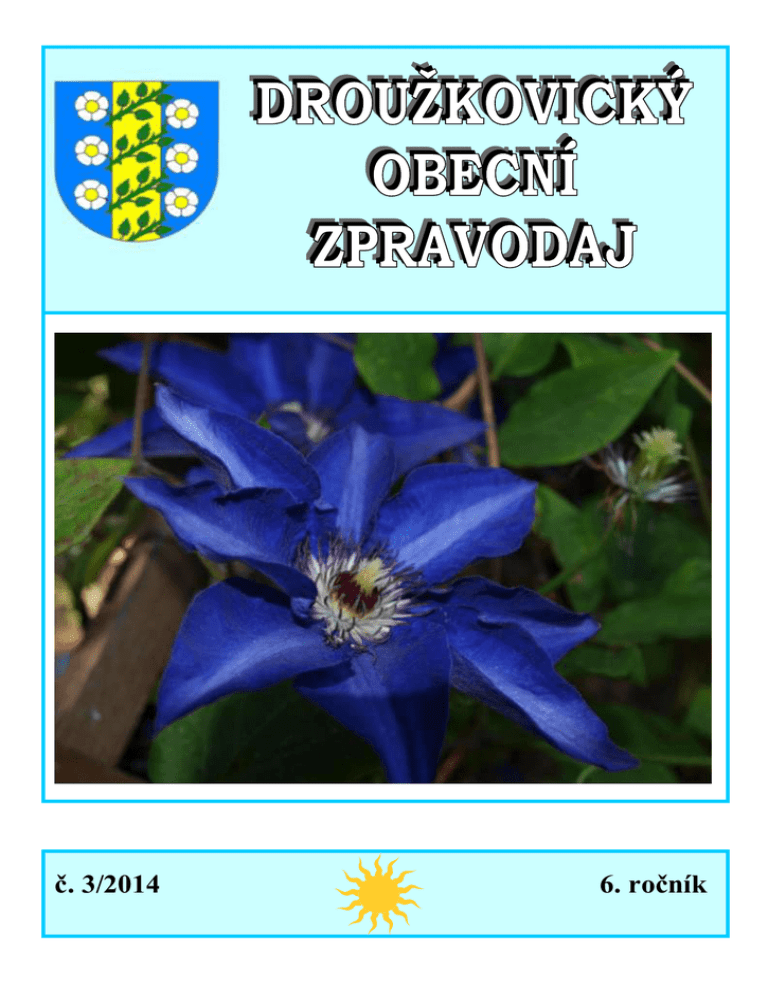 č. 3/2014 6. ročník 2. Společenská kronika JUBILANTI SRPEN ČERVENEC paní Roušarová Anna 85 let paní Huňadyová Klára 70 let paní Zvánovcová Jiřina 80 let paní Kaliničová Marie 65 let paní Pekařová Anna 70 let paní Havlíčková Dagmar 60 let pan Pavlíček Vlastimil 60 let paní Vinterová Zina 55 let ZÁŘÍ ŘÍJEN paní Holková Jaroslava 70 let pan Campr Vladimír 75 let pan Stupka Karel 55 let paní Merhautová Alena 75 let paní Camprová Jarmila 50 let paní Konrádová Helena 65 let paní Sýkorová Anna 65 let pan Cyprich František 60 let paní Kužílková Marcela 55 let NOVĚ NAROZENÍ DUBEN KVĚTEN ČERVEN -- Viktorie Vršovská Ester Velková ZESNULÍ DUBEN KVĚTEN ČERVEN -- -- -- Obsah vydání Titulní strana, společenská kronika, atd. 1. - 2. strana Mateřská škola Současnost 3. - 4. strana Sbor dobrovolných hasičů Dění v obci 4. - 6. strana Stáje Droužkovice 34. - 35. strana Kultura 7. - 16. strana Připravujeme slovem 35. - 37. strana Upozornění 37. - 38. strana Sport & Kultura 16. - 20. strana Sport 20. - 21. strana Připravujeme, připravují Volný čas 21. - 25. strana Zajímavosti 26. - 30. strana Droužkovické čtvrtletí obrazem 30. - 33. strana 33. strana 38. - 39. strana 40. strana 3. Současnost Zastupitelstvo obce a uplynulé čtvrtletí Zastupitelstvo obce se v uplynulém čtvrtletí sešlo pouze jednou, a to až ke konci měsíce června dne třicátého. Hlavním bodem programu bylo schválení Závěrečného účtu Obce Droužkovice za rok 2013. Ten musel být projednán nejpozději do konce prvního pololetí letošního roku. Mezi další nejdůležitější body jednání patřilo hospodaření obce do 31. května 2014 a 2. rozpočtová změna 2014. Dále se projednávalo uzavření smluv: o zřízení věcného břemene mezi obcí a RWE GasNet, s.r.o; o zajištění zpětného odběru a využití odpadů mezi obcí a firmou EKO-KOM, a.s.; o zřízení služebnosti inženýrské sítě mezi obcí a firmou Telefónica CR, a.s. na mýtné R7 v úseku Droužkovice – Spořice a dále na pronájem přízemní, pravé části budovy čp. 23 pro volnočasové centrum občanskému sdružení Setkávání – Živný venkov. Velmi důležitým bodem jednání bylo také udělení čestného občanství panu Vlastimilu Harapesovi. Dále se projednávali žádosti na udělení souhlasu pro výkon funkce přísedícího u Okresního soudu v Chomutově, o poskytnutí finančních darů na pořádání akcí Fesťáček u vody a jezdeckých závodů a zakoupení dresů pro mužstvo dospělých TJ Slavoj Droužkovice. Dále byly na programu věci týkající se majetku obce, a to žádosti na pronájmy pozemků a jejich prodeje. Zastupitelstvo se také muselo vyjádřit k dalšímu pokračování rekonstrukce čp. 23, konkrétně prvního poschodí a uzavřít dohodu mezi obcí a Státním zemědělským intervenčním fondem. Posledním bodem programu bylo vyjádření obce k projektu „15 miliard“. - vň Jarní bouřky páchaly opět škody Letošní duben byl abnormálně teplý, kvůli čemuž byl taktéž bohatý na silné bouřky. Nevíme čím to je, ale téměř pokaždé dojde na území naší obce k zásahu objektů bleskem. Nejhorší je, že tomu nejde zabránit a jakákoliv ochrana je prakticky zbytečná. Jak je vidno, nepomáhají ani hromosvody. První letošní ničivá bouřka byla ve čtvrtek dne 3. dubna. V ulici J. Švermy došlo za potokem k zásahu tří domů bleskem. Dokonce byl pozorován na cestě k železniční stanici mimořádný úkaz, a to blesk kulový. Došlo k poškození plynového kotle v jednom domě a různých elektrospotřebičů v dalších dvou budovách. Tento den došlo také na obecním úřadě k zásahu. Porušena byla pevná linka. Bohužel ke spálení telefonních drátů došlo postupně, kvůli čemuž jsme nedávali do souvislosti zásah blesku a poruchu. Než se přišlo na závadu, týden nefungovalo telefonní spojení na pevnou linku na úřad. V provozu byl jen mobil, jehož číslo většina občanů však nezná. Pro zajímavost je uvedeno na našich webových stránkách. Jedná se o číslo 702 048 634. Opravena však byla pouze jedna pevná linka, neboť bylo porušeno zařízení pro ISDN. Telefon v kanceláři starosty, který je propojen s faxem, prozatím nefungoval. Druhá bouřka, která nám přidělala další vrásky na čele, byla také ve čtvrtek, ale 24. dubna. Opět dostala zásah budova radnice. Na pracovišti pošty – Partner II. došlo k fatálnímu poškození čtečky karet, takže nešlo ukládat a vybírat peníze, ani provádět transakce přes karty. Postupem času zde přestalo také fungovat připojení na internet, takže tu půl dne nešlo prakticky vůbec nic. Dále byl poškozen vysílač umístěný na půdě potřebný pro zabezpečovací zařízení ve třech hlídaných objektech - a to obecního úřadu, obchodu s volnočasovým centrem a mateřinky. K poškození došlo také v budově mateřské školky. Zničen byl modem, takže tu nepracoval internet ani pevná linka. Došlo také k poškození videotelefonu, který je napojený na otvírání hlavních vchodových dveří. Zničeno bylo taktéž hlídací čidlo. Současnost 4. Současnost Do třetice zasáhl budovu úřadu blesk v pondělí 19. května. Stalo se to ještě v pracovní době, přesně v půl čtvrté odpoledne. Na věži došlo k poruše příjmu internetu, tudíž místní pobočka pošty nemohla uzavřít denní cyklus. Firma Grape SC, a.s. ale poruchu neodkladně odstranila. Horší to bylo opět s telefonním připojením na obecním úřadě. To opět nefungovalo a následovala další oprava. Nyní jsou už v provozu obě linky. - vň Dění v obci Lampa veřejného osvětlení i před kostelem Absenci lampy veřejného osvětlení před vchodem do kostela a zároveň na příchozí cestě do místní mateřské školy jsme pociťovali již del