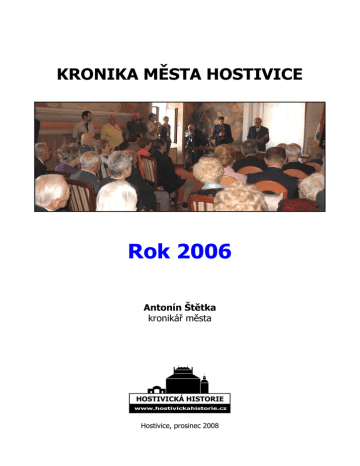 KRONIKA MĚSTA HOSTIVICE Rok 2006 Antonín Štětka kronikář města Hostivice, prosinec 2008 Kronika města Hostivice Rok 2006 2 Kronika města Hostivice – zápis za rok 2006 Pro město Hostivice zpracoval Antonín Štětka Graficky upravil, titulní obrázek doplnil a se souhlasem autora na webu Hostivické historie zveřejnil Jiří Kučera Stránky jsou upraveny pro zmenšování při tisku na formát A5 Kronika města Hostivice Rok 2006 3 Rok 2006 zaznamenal další upevňování českého státu, který se učí životu v Evropském společenství. Naše republika ležící uprostřed Evropy si zvyká na svébytné rozhodování. Tyto snahy však často narušují osobní i politická přání, vytváří se tím v mnoha lidech pocit nejistoty a narůstající obavy z budoucnosti. Proklamací k nutným ekonomickým reformám bylo podáno již dost. Po roce 1990 došlo k ohromnému přesunu majetku, byly uvedeny v život restituce soukromého vlastnictví, uskutečnily se dvě vlny privatizace státního majetku. Skutečnost potvrzuje, že tyto akce nebyly vždy právnicky ani společensky čisté, republika přišla o ohromné jmění, noví nabyvatelé získali tak nezaslouženě nepředstavitelné majetkové hodnoty. V kronikářském záznamu bude zaznamenáno, co dobrého či méně dobrého nám tento rok přinesl, jak jsme pokročili v budování svého domova, co se nám podařilo a v čem jsme zůstali na poloviční cestě. ROK 2006 VE SVĚTĚ Předností bylo, že podařilo uchovat světový mír. K životnímu klidu však stále cosi chybí. Trvá napjatá situace v soužití národů Asie, Afriky, Jižní Ameriky. Tamní obyvatelé žijí často na hranici bídy, jejich nespokojenost vytváří podmínky k různým mocenským šarvátkám a často i bratrovražedným bojům. V lednu došlo při návratu slovenského vojenského kontingentu KFOR z Kosova k letecké havárii na maďarsko-slovenském pomezí. Zahynulo 42 pasažérů, zachránil se pouze jeden voják. Ptačí chřipka hrozila už v Turecku, v únoru se vyskytla již v Itálii, Řecku, Slovinsku a Rakousku. Podnikatel Petr Kellner byl označen 10. 3. prvním Čechem, kterého americký časopis zařadil mezi nejbohatší lidi světa. Ve vězení v Haagu zemřel 11. 3. bývalý srbský prezident Slobodan Miloševič. Dne 24. 4. vraždili teroristé v Egyptě. V letovisku Dahab zabili 24 osob a dalších 60 bylo zraněno. Světové velmoci začínají mít strach z „Osy zla“ – Irák, Írán, severní Korea (KLDR). Íránský prezident Ahmadínežád vyhlásil: „… můžeme vyrobit atomovou bombu“. Při volbách v Itálii prohrál premiér Silvio Berlusconi a na svůj post rezignoval. Ve svém projevu 10. 5. prohlásil ruský prezident Putin, že silně vyzbrojená armáda je pro Rusko životně důležitá, „závody ve zbrojení nesmíme prohrát“. Dnem 22. 5. se odtrhla od Srbska republika Černá Hora. Dne 8. 6. USA dopadly a zabily hledaného teroristu č. 2 Abú Músu Zárkavího, který vedl Al-Kajdu v Iráku. Multimilionář a šéf Microsoftu Bill Gates opustil 16. 6. po třiceti létech vedení své firmy a chce se věnovat charitě. Po osmi létech vlády pravice na Slovensku vyhrála 18. 6. parlamentní volby levice, vládu sestavil sociální demokrat Robert Fico. Bahamský soud 23. 6. rozhodl, že podnikatele Viktora Koženého vydá vládě USA. Severní Korea demonstrovala světu svoji sílu, 7. 7. odpálila sedm raket, které mohou nést jaderné nálože. Dne 13. 7. zaútočila vojska Izraele na sousední Libanon, nálety měly za cíl i mezinárodní letiště v Bejrútu. Britové odhalili teroristy, kteří hrozili pumovými útoky na letadla Londýn – USA, bylo zatčeno 24 osob. Vůdce kubánských komunistů Fidel Castro neslavil svoje 81. narozeniny z důvodu zhoršení zdravotního stavu. V Maďarsku se 17. 9. Kronika města Hostivice Rok 2006 4 rozpoutaly bouře proti premiérovi Ferenci Gyurcsanymu, který přiznal, že svými činy klamal veřejnost. Pouliční boje a demonstrace pokračovaly i v říjnu. Dne 7. 10. nájemný vrah zabil ruskou novinářku Annu Politkovskou, která psala o korupci ve vládě a kritizovala proruskou čečenskou vládu. V USA začaly 7. 11. volby do amerického Kongresu. O den později, po prohře republikánů odstoupil ministr obrany USA Donald Rumsfeld a demokraté získali většinu v Senátu, po dvanácti létech ovládli i Sněmovnu reprezentantů. V Londýně 23. 11. zemřel za podivných okolností bývalý ruský agent Alexandr Litviněnko, v těle měl velké množství radioaktivního polonia. Dlouhodobé vyšetřování 14. 12. v Anglii prokázalo, že princezna Diana, narozena 1961, zemřela v roce 1997 na následky dopravní nehody, kdy řidič nepřizpůsobil rychlost jízdy vozidla. Prezident USA Bush přiznal, že válka v Iráku se dostává do spletitých situací, Spojené státy nevyhrávají a ani neprohrávají. Čas až později ukáže, jak to tedy bylo. Ani ve sportu se naše Česká republika ve světě neztratila. Již v lednu byly v italském Turínu zimní olympijské hry, kde naši lyžaři získali zlaté, stříbrné a bronzové medaile. Bronzovou medaili získali i hokejisté, kteří porazili Rusko. V sousedním Německu začal 8. 6. svátek všech příznivců fotbalu, turnaj mistrovství světa. Po olympijských medailích získala navíc 8. 3. Kateřina Neumanová stříbrný světový pohár za soutěže v ženském lyžování a 19. 3. se stal náš skokan Jakub Janda vítězem Světového poháru. Čeští hokejisté získali na květnovém mistrovství světa v lotyšské Rize stříbrné medaile, prohráli až ve finále se Švédy 0:4. V Německu začaly v červnu závěrečné boje světového mistrovství v kopané. Po 16 létech se do těchto zápolení probojoval i český tým. Tomu se však již nedařilo a ze skupiny nepostoupil. Světovým vítězem se stalo mužstvo Itálie. Česká 